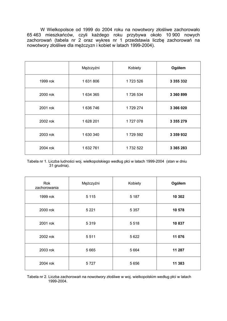 W Wielkopolsce od 1999 do 2004 roku na nowotwory złośliwe zachorowało 65 463 mieszkańców, czyli każdego roku przybywa około 10 900 nowych zachorowań (tabela nr 2 oraz wykres nr 1 przedstawia liczbę zachorowań na nowotwory złośliwe dla mężczyzn i kobiet w latach 1999-2004). Mężczyźni Kobiety Ogółem 1999 rok 1 631 806 1 723 526 3 355 332 2000 rok 1 634 365 1 726 534 3 360 899 2001 rok 1 636 746 1 729 274 3 366 020 2002 rok 1 628 201 1 727 078 3 355 279 2003 rok 1 630 340 1 729 592 3 359 932 2004 rok 1 632 761 1 732 522 3 365 283 Tabela nr 1. Liczba ludności woj. wielkopolskiego według płci w latach 1999-2004 (stan w dniu 31 grudnia). Rok zachorowania Mężczyźni Kobiety Ogółem 1999 rok 5 115 5 187 10 302 2000 rok 5 221 5 357 10 578 2001 rok 5 319 5 518 10 837 2002 rok 5 511 5 622 11 076 2003 rok 5 665 5 664 11 287 2004 rok 5 727 5 656 11 383 Tabela nr 2. Liczba zachorowań na nowotwory złośliwe w woj. wielkopolskim według płci w latach 1999-2004. 11 383 11 287 10 837 10 578 10 302 5 727 5 656 5 665 5 664 5 319 5 518 6 000 5 221 5 357 8 000 5 511 5 622 10 000 5 115 5 187 liczba zachorowań 12 000 11 076 Liczba zachorow ań na now otw ory złośliw e w w oj.w ielkopolskim w latach 1999-2004 Ogółem Mężczyźni 4 000 Kobiety 2 000 0 1999 2000 2001 2002 2003 2004 lata Wykres nr 1. Liczba zachorowań na nowotwory złośliwe w woj. wielkopolskim w latach 1999-2004. Należy zaznaczyć, że dane liczbowe o zachorowaniach za lata 1999 – 2004 dla województwa wielkopolskiego różnią się nieznacznie od danych zamieszczonych w dostępnych biuletynach. Jest to wynikiem ciągłego uzupełniania bazy rejestru o przypadki zdiagnozowane w tych latach, a dotąd nie zarejestrowane w bazie Wielkopolskiego Rejestru Nowotworów. Analizując liczby bezwzględne zarejestrowanych zachorowań i zgonów u mężczyzn w Wielkopolsce na przełomie ostatnich 6-ciu lat obserwujemy wzrost liczby zachorowań o 12% i zgonów o 10% (wykres numer 2). Przy czym pozytywnym faktem jest, iż linie zarejestrowanych zachorowań i zgonów zaczynają stopniowo oddalać się od siebie. Sytuacja przedstawia się podobnie w przypadku współczynników surowych zachorowalności i umieralności (wykres numer 3). 99 19 00 20 01 20 93 41 02 20 66 42 03 20 57 27 78 41 56 62 08 41 55 09 53 15 49 41 52 20 7000 6000 5000 4000 3000 2000 1000 0 51 15 liczby bezwzględne Liczba zachorow ań i zgonów dla mężczyzn w Wielkopolsce w latach 1999-2004 50 45 zachorow ania zgony 04 20 lata Wykres nr 2. Liczba zarejestrowanych zachorowań i zgonów dla mężczyzn w Wielkopolsce w latach 1999-2004. współczynniki surowe Współczynniki surow e zachorow alności i umieralności dla mężczyzn w Wielkopolsce w latach 1999-2004 46 3, 1 3 400 350 300 250 200 150 100 50 0 39 9, 31 7 4, 32 6 35 ,2 1, 4 5 2 25 99 19 00 20 3 52 7, 5 2 26 5, 25 w spółczynnik surow y zachorow alności 67 8, 27 66 1, 6 2 w spółczynnik surow y umieralności 04 20 03 20 02 20 lata 01 20 76 0, 5 3 29 35 7, 8, 4 3 3 3 Wykres nr 3. Współczynniki surowe zachorowalności i umieralności dla mężczyzn w Wielkopolsce w latach 1999-2004. U kobiet w analizowanym okresie zaobserwowano wzrost liczby zachorowań o 9% i zgonów o 10% (wykres numer 4). Podobnie jak w przypadku mężczyzn linie współczynników surowych dla zachorowań i zgonów zaczynają oddalać się od siebie (wykres numer 5). 56 56 56 17 55 63 55 17 5000 4000 zachorow ania zgony 34 07 33 29 33 91 34 08 33 21 2000 32 34 3000 1000 20 04 20 03 20 02 20 01 20 00 0 19 99 liczby bezwzględne 6000 53 55 51 86 Liczba zachorow ań i zgonów dla kobie t w Wielkopolsce w latach 1999-2004 lata Wykres nr 4. Liczba zarejestrowanych zachorowań i zgonów dla kobiet w Wielkopolsce w latach 1999-2004. 350 Współczynniki surow e zachorow alności i umieralności dla kobiet w Wielkopolsce w latach 1999-2004 4 6 1 ,0 1 76 46 2, 0, 4, 6, 19 1 3 32 3 32 32 89 0, 30 współczynniki surowe 300 w spółczynnik surow y zachorow alności 250 200 150 100 64 7, 18 35 2, 19 08 7, 19 34 6, 19 47 2, 19 65 6, 19 w spółczynnik surow y umieralności 50 20 04 20 03 20 02 20 01 20 00 19 99 0 lata Wykres nr 5. Współczynniki surowe zachorowalności i umieralności dla kobiet w Wielkopolsce w latach 1999-2004. Analizując zachorowalność i umieralność na nowotwory złośliwe w Wielkopolsce na przykładzie współczynników standaryzowanych u mężczyzn i kobiet (wykres numer 6 i 7) widzimy wyraźnie, iż wzrost zachorowań i zgonów wynika przede wszystkim ze starzenia się populacji Wielkopolski. Współczynniki standaryzowane w ciągu sześciu ostatnich lat utrzymują się na bardzo podobnym poziomie stanowiąc prawie linię prostą. 28 0, 44 27 8, 92 27 2, 26 27 1, 03 28 0, 15 w spółczynnik standaryzow any zachorow alności 21 9, 13 20 7, 8 100 20 9, 23 150 20 9, 38 200 21 1, 02 250 21 8, 11 współczynniki standaryzowane 300 27 0, 45 Współczynniki standaryzow ane zachorow alności i umieralności dla mężczyzn w Wielkopolsce w latach 1999-2004 w spółczynnik standaryzow any umieralności 50 20 04 20 03 20 02 20 01 20 00 19 99 0 lata Wykres nr 6. Współczynniki standaryzowane zachorowalności i umieralności dla mężczyzn w Wielkopolsce w latach 1999-2004. współczynniki standaryzowane 21 2, 13 21 1, 77 21 3, 74 21 3, 79 21 3, 29 250 20 8, 07 Współczynniki standaryzow ane zachorow alności i umieralności dla kobiet w Wielkopolsce w latach 1999-2004 200 w spółczynnik standaryzow any zachorow alności 150 100 50 97 6, 1 1 02 7, 1 1 06 8, 1 1 31 6, 1 1 0 99 19 00 20 01 20 02 20 83 0, 1 1 03 20 5 ,0 2 11 w spółczynnik standaryzow any umieralności 04 20 lata Wykres nr 7. Współczynniki standaryzowane zachorowalności i umieralności dla kobiet w Wielkopolsce w latach 1999-2004. Porównując aktualne dane liczbowe dotyczące zachorowań w Wielkopolsce z poprzednimi latami można stwierdzić, iż nowotwory złośliwe stanowią w Wielkopolsce poważny problem zdrowotny. Tendencje wzrostowe dotyczą r