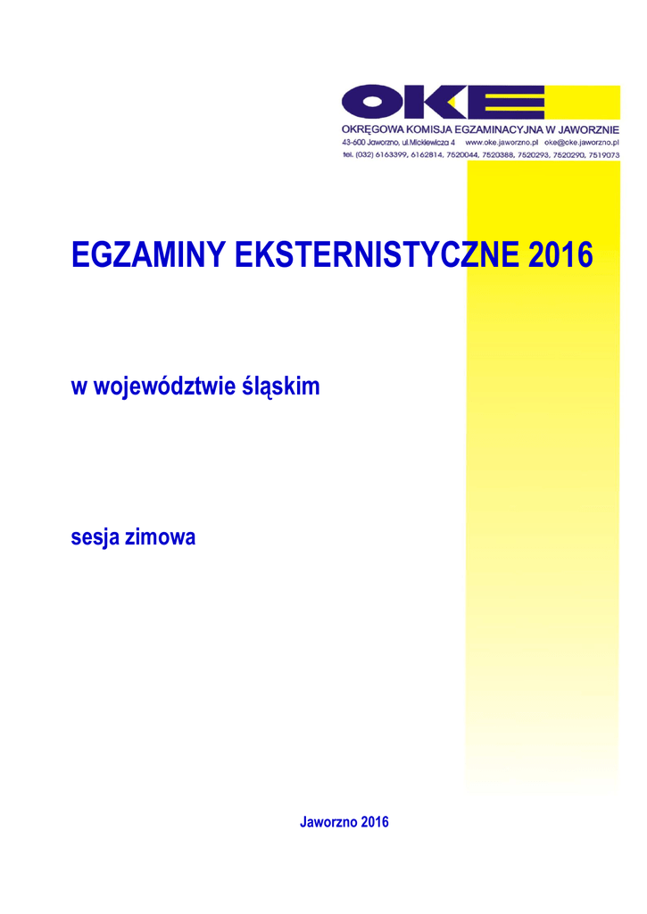 EGZAMINY EKSTERNISTYCZNE 2016 w województwie śląskim sesja zimowa Jaworzno 2016 Okręgowa Komisja Egzaminacyjna w Jaworznie Spis treści Wstęp _____________________________________________________________________________________________________ 3 Warunki przystąpienia do egzaminów eksternistycznych ________________________________________ 3 Wymagania egzaminacyjne __________________________________________________________________________ 4 Termin i miejsce egzaminów ________________________________________________________________________ 4 Zgłoszenia do egzaminów ____________________________________________________________________________ 5 Arkusze egzaminacyjne ______________________________________________________________________________ 6 Wyniki i świadectwa __________________________________________________________________________________ 7 Egzaminy eksternistyczne w sesji zimowej 2016 w województwie śląskim _______________________ 9 Wyniki egzaminów eksternistycznych w sesji zimowej w województwie śląskim ________________ 9 Egzaminy z zakresu sześcioletniej szkoły podstawowej___________________________________________ 9 Egzaminy z zakresu gimnazjum ____________________________________________________________________ 10 Liczba zdających egzaminy _______________________________________________________________________ 10 Średnie wyniki ____________________________________________________________________________________ 11 Wydane świadectwa ______________________________________________________________________________ 11 Egzaminy z zakresu zasadniczej szkoły zawodowej ______________________________________________ 11 Egzaminy z zakresu liceum ogólnokształcącego __________________________________________________ 12 Liczba zdających egzaminy _______________________________________________________________________ 12 Średnie wyniki ____________________________________________________________________________________ 13 Wydane świadectwa ______________________________________________________________________________ 15 Rozkłady wyników i ocen z poszczególnych przedmiotów ____________________________________ 16 Język polski _____________________________________________________________________________________ 16 Język angielski __________________________________________________________________________________ 17 Biologia __________________________________________________________________________________________ 18 Chemia __________________________________________________________________________________________ 19 Fizyka____________________________________________________________________________________________ 20 Geografia ________________________________________________________________________________________ 21 Historia __________________________________________________________________________________________ 22 Matematyka _____________________________________________________________________________________ 23 Podstawy przedsiębiorczości __________________________________________________________________ 24 Technologia informacyjna _____________________________________________________________________ 25 Wiedza o społeczeństwie ______________________________________________________________________ 26 Słownik terminów ______________________________________________________________________________________ 27 Pracownia ds. Analiz Wyników Egzaminacyjnych Strona 2 z 27 Okręgowa Komisja Egzaminacyjna w Jaworznie WSTĘP Zgodnie z Ustawą z dnia 11 kwietnia 2007 roku o zmianie ustawy o systemie oświaty oraz o zmianie niektórych innych ustaw (Dz.U. Nr 80, poz. 542) egzaminy eksternistyczne zostały włączone do zewnętrznego systemu egzaminowania, – przygotowanie i przeprowadzanie egzaminów eksternistycznych powierzono Centralnej Komisji Egzaminacyjnej oraz okręgowym komisjom egzaminacyjnym. Egzaminy eksternistyczne przeznaczone są dla osób dorosłych, które decydują się na samodzielne przygotowanie do egzaminów. W trybie eksternistycznym można uzyskać świadectwo ukończenia szkoły podstawowej, gimnazjum, liceum ogólnokształcącego, a od roku 2013 także zasadniczej szkoły zawodowej. WARUNKI PRZYSTĄPIENIA DO EGZAMINÓW EKSTERNISTYCZNYCH Do egzaminów eksternistycznych mogą przystąpić osoby, które ukończyły 18 lat i nie są uczniami szkół dziennych lub wieczorowych. Do egzaminów z zakresu: sześcioletniej szkoły podstawowej dla dorosłych może przystąpić osoba, która tej szkoły nie ukończyła lub osoba, która ukończyła klasę programowo niższą niż klasa VI ośmioletniej szkoły podstawowej, gimnazjum dla dorosłych może przystąpić osoba, która ukończyła sześcioletnią szkołę podstawową albo ukończyła klasy VI lub VII ośmioletniej szkoły podstawowej albo posiada wpis w indeksie potwierdzający uzyskanie promocji do klasy VII lub VIII ośmioletniej szkoły podstawowej dla dorosłych, liceum ogólnokształcącego dla dorosłych może przystąpić osoba, która posiada świadectwo ukończenia gimnazjum lub świadectwo ukończenia ośmioletniej szkoły podstawowej, wymagań określonych w podstawie programowej kształcenia ogólnego dla zasadniczej szkoły zawodowej może przystąpić osoba, która posiada świadectwo ukończenia gimnazjum lub świadectwo ukończenia ośmioletniej szkoły podstawowej. Pracownia ds. Analiz Wyników Egzaminacyjnych Strona 3 z 27 Okręgowa Komisja Egzaminacyjna w Jaworznie WYMAGANIA EGZAMINACYJNE W sesji zimowej 2016 r. zakres wiadomości i umiejętności sprawdzanych na egzaminie eksternistycznym z przedmiotów ogólnokształcących: w przypadku szkoły podstawowej i liceum ogólnokształcącego – określają standardy wymagań egzaminacyjnych zatwierdzone przez Ministra Edukacji Narodowej i opublikowane w Rozporządzeniu z dnia 27 września 2007 r. w sprawie standardów wymagań będących podstawą przeprowadzania egzaminów eksternistycznych. w przypadku gimnazjum i zasadniczej