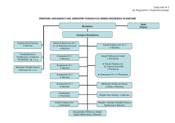 Załącznik Nr 5 do Regulaminu Organizacyjnego STRUKTURA ORGANIZACYJNA JEDNOSTEK PODLEGŁYCH URZĘDU MIEJSKIEGO W BARCINIE Rada Miejska Burmistrz Zastępca Burmistrza Gminna Straż Pożarna w Barcinie Przedsiębiorstwo Produkcyjno -Usługowe "WODBAR" Sp. z o.o. Barciński Ośrodek Sportu i Rekreacji Sp. z o.o. Szkoła Podstawowa Nr 1 im. dr Stanisława Krzysia w Barcinie Szkoła Podstawowa Nr 2 w Barcinie Gimnazjum Nr 1 w Barcinie Zespół Publicznych Szkół w Piechcinie Przedszkole Nr 1 w Barcinie ● Szkoła Podstawowa im. Janusza Korczaka w Piechcinie Przedszkole Nr 2 w Barcinie ● Gimnazjum Nr 2 w Piechcinie Przedszkole Nr 3 w Barcinie Biblioteka Publiczna Miasta i Gminy w Barcinie Przedszkole w Piechcinie Miejski Dom Kultury w Barcinie Szkoła Podstawowa w Mamliczu Miejsko -Gminny Ośrodek Pomocy Społecznej w Barcinie Samodzielny Publiczny Zakład Opieki Zdrowotnej w Barcinie