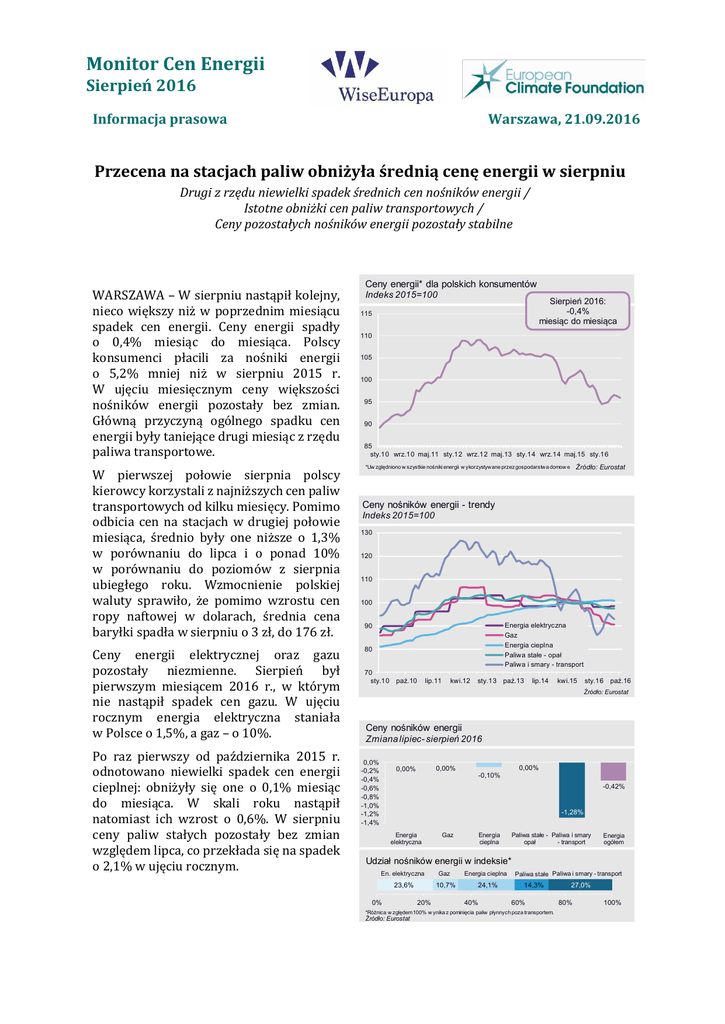 Monitor Cen Energii Sierpień 2016 Informacja prasowa Warszawa, 21.09.2016 Przecena na stacjach paliw obniżyła średnią cenę energii w sierpniu Drugi z rzędu niewielki spadek średnich cen nośników energii / Istotne obniżki cen paliw transportowych / Ceny pozostałych nośników energii pozostały stabilne WARSZAWA – W sierpniu nastąpił kolejny, nieco większy niż w poprzednim miesiącu spadek cen energii. Ceny energii spadły o 0,4% miesiąc do miesiąca. Polscy konsumenci płacili za nośniki energii o 5,2% mniej niż w sierpniu 2015 r. W ujęciu miesięcznym ceny większości nośników energii pozostały bez zmian. Główną przyczyną ogólnego spadku cen energii były taniejące drugi miesiąc z rzędu paliwa transportowe. W pierwszej połowie sierpnia polscy kierowcy korzystali z najniższych cen paliw transportowych od kilku miesięcy. Pomimo odbicia cen na stacjach w drugiej połowie miesiąca, średnio były one niższe o 1,3% w porównaniu do lipca i o ponad 10% w porównaniu do poziomów z sierpnia ubiegłego roku. Wzmocnienie polskiej waluty sprawiło, że pomimo wzrostu cen ropy naftowej w dolarach, średnia cena baryłki spadła w sierpniu o 3 zł, do 176 zł. Ceny energii elektrycznej oraz gazu pozostały niezmienne. Sierpień był pierwszym miesiącem 2016 r., w którym nie nastąpił spadek cen gazu. W ujęciu rocznym energia elektryczna staniała w Polsce o 1,5%, a gaz – o 10%. Po raz pierwszy od października 2015 r. odnotowano niewielki spadek cen energii cieplnej: obniżyły się one o 0,1% miesiąc do miesiąca. W skali roku nastąpił natomiast ich wzrost o 0,6%. W sierpniu ceny paliw stałych pozostały bez zmian względem lipca, co przekłada się na spadek o 2,1% w ujęciu rocznym. 115 110 105 100 95 90 85 sty.10 wrz.10 maj.11 sty.12 wrz.12 maj.13 sty.14 wrz.14 maj.15 sty.16 130 120 110 100 Energia elektryczna Gaz Energia cieplna P ł ł Paliwa i smary - transport 90 80 70 sty.10 ź. lip.11 0,0% -0,2% -0,4% -0,6% -0,8% -1,0% -1,2% -1,4% kwi.12 sty.13 ź. 3 Energia cieplna P lip.14 kwi.15 ź. sty.16 0,00% Energia elektryczna Gaz ł Paliwa i smary - transport ł ł ł . ł Paliwa 3 0% 20% *R ż 100% : Eurostat P 3 40% 60% ł 80% . 100% W sierpniu po raz kolejny odnotowano spadek cen konsumpcyjnych rok do roku. Wyniósł on 0,5% i był nieco mniejszy niż w ubiegłym miesiącu. Spadek cen energii pozostaje kluczowym czynnikiem odpowiadającym za deflację w Polsce. W sierpniu wpływ cen energii na inflację wyniósł -0,7 p.p. Podobnie jak w Polsce, spadek cen nośników energii zarejestrowano również w skali całej Unii Europejskiej: w sierpniu były o 0,9% tańsze niż w lipcu i o 5,1% tańsze niż rok temu. Wśród największych gospodarek europejskich, w ujęciu miesięcznym nośniki energii najbardziej staniały we Francji (-1,5%), najmniej zaś we Włoszech oraz Wielkiej Brytanii (-0,7%). W ujęciu rocznym największy spadek cen energii nastąpił we Włoszech (-6,4%), a najmniejszy – we Francji (-2,4%). W ł W ł Inflacja ze zmiany cen energii) Ceny energii w Europie - trendy Indeks 2015=100 120 115 110 105 100 95 90 UE-28 Niemcy Francja Wł Polska W.Brytania 85 80 sty.10 ź. lip.11 kwi.12 sty.13 ź. 3 lip.14 kwi.15 sty.16 ź. Aleksander Śniegocki, Urszula Siedlecka WiseEuropa Monitor Cen Energii publikowany jest co miesiąc prezentując najnowsze dane o zmianach cen energii dla konsumentów. Monitor bazuje na oficjalnych danych o zmianach cen poszczególnych nośników energii oraz ich przeciętnym udziale w koszyku dóbr konsumpcyjnych w Polsce. Dane wykorzystane w opracowaniu Monitora pochodzą z Głównego Urzędu Statycznego i są publikowane przez Eurostat. Monitor Cen Energii jest projektem Europejskiej Fundacji Klimatycznej (ECF) i obejmuje szereg państw Unii Europejskiej. Polska edycja Monitora jest przygotowywana przez WiseEuropa. Przygotowanie danych: Energyprofiler.org Źródła danych: GUS, Eurostat Kontakt merytoryczny: Aleksander Śniegocki [email protected] Kontakt dla mediów: Aleksandra Sawicka [email protected]