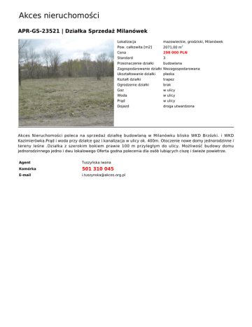 Akces nieruchomości APR-GS-23521 | Działka Sprzedaż Milanówek Lokalizacja mazowieckie, grodziski, Milanówek Pow. całkowita [m2] 2071,00 m2 Cena 298 000 PLN Standard 3 Przeznaczenie działki budowlana Zagospodarowanie działki Niezagospodarowana Ukształtowanie działki płaska Kształt działki trapez Ogrodzenie działki brak Gaz w ulicy Woda w ulicy Prąd w ulicy Dojazd droga utwardzona Akces Nieruchomości poleca na sprzedaż działkę budowlaną w Milanówku blisko WKD Brzózki. i WKD Kazimierówka.Prąd i woda przy działce gaz i kanalizacja w ulicy ok. 400m. Otoczenie nowe domy jednorodzinne i tereny leśne .Działka z szerokim bokiem prawie 100 m przyległym do ulicy. Możliwość budowy domu jednorodzinnego jedno i dwu lokalowego Oferta godna polecenia dla osób lubiących ciszę i świeże powietrze. Agent Tuszyńska Iwona Komórka 501 310 045 E-mail [email protected]