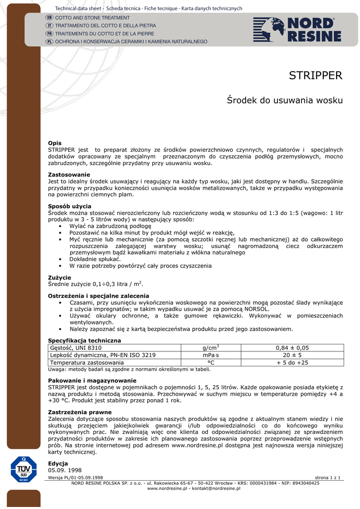 Technical data sheet - Scheda tecnica - Fiche tecnique - Karta danych technicznych COTTO AND STONE TREATMENT TRATTAMENTO DEL COTTO E DELLA PIETRA TRAITEMENTS DU COTTO ET DE LA PIERRE OCHRONA I KONSERWACJA CERAMIKI I KAMIENIA NATURALNEGO STRIPPER Środek do usuwania wosku Opis STRIPPER jest to preparat złożony ze środków powierzchniowo czynnych, regulatorów i specjalnych dodatków opracowany ze specjalnym przeznaczonym do czyszczenia podłóg przemysłowych, mocno zabrudzonych, szczególnie przydatny przy usuwaniu wosku. Zastosowanie Jest to idealny środek usuwający i reagujący na każdy typ wosku, jaki jest dostępny w handlu. Szczególnie przydatny w przypadku konieczności usunięcia wosków metalizowanych, także w przypadku występowania na powierzchni ciemnych plam. Sposób użycia Środek można stosować nierozcieńczony lub rozcieńczony wodą w stosunku od 1:3 do 1:5 (wagowo: 1 litr produktu w 3 - 5 litrów wody) w następujący sposób: • Wylać na zabrudzoną podłogę • Pozostawić na kilka minut by produkt mógł wejść w reakcję, • Myć ręcznie lub mechanicznie (za pomocą szczotki ręcznej lub mechanicznej) aż do całkowitego rozpuszczenia zalegającej warstwy wosku; usunąć nagromadzoną ciecz odkurzaczem przemysłowym bądź kawałkami materiału z włókna naturalnego • Dokładnie spłukać. • W razie potrzeby powtórzyć cały proces czyszczenia Zużycie Średnie zużycie 0,1÷0,3 litra / m2. Ostrzeżenia i specjalne zalecenia • Czasami, przy usunięciu wykończenia woskowego na powierzchni mogą pozostać ślady wynikające z użycia impregnatów; w takim wypadku usuwać je za pomocą NORSOL. • Używać okulary ochronne, a także gumowe rękawiczki. Wykonywać w pomieszczeniach wentylowanych. • Należy zapoznać się z kartą bezpieczeństwa produktu przed jego zastosowaniem. Specyfikacja techniczna Gęstość, UNI 8310 Lepkość dynamiczna, PN-EN ISO 3219 Temperatura zastosowania g/cm3 mPa⋅s °C 0,84 ± 0,05 20 ± 5 + 5 do +25 Uwaga: metody badań są zgodne z normami określonymi w tabeli. Pakowanie i magazynowanie STRIPPER jest dostępne w pojemnikach o pojemności 1, 5, 25 litrów. Każde opakowanie posiada etykietę z nazwą produktu i metodą stosowania. Przechowywać w suchym miejscu w temperaturze pomiędzy +4 a +30 °C. Produkt jest stabilny przez ponad 1 rok. Zastrzeżenia prawne Zalecenia dotyczące sposobu stosowania naszych produktów są zgodne z aktualnym stanem wiedzy i nie skutkują przejęciem jakiejkolwiek gwarancji i/lub odpowiedzialności co do końcowego wyniku wykonywanych prac. Nie zwalniają więc one klienta od odpowiedzialności związanej ze sprawdzeniem przydatności produktów w zakresie ich planowanego zastosowania poprzez przeprowadzenie wstępnych prób. Na stronie internetowej pod adresem www.nordresine.pl dostępna jest najnowsza wersja niniejszej karty technicznej. Edycja 05.09. 1998 Wersja PL/01-05.09.1998 strona 1 z 1 NORD RESINE POLSKA SP. z o.o. - ul. Rakowiecka 65-67 - 50-422 Wrocław - KRS: 0000431984 - NIP: 8943040425 www.nordresine.pl - [email protected]