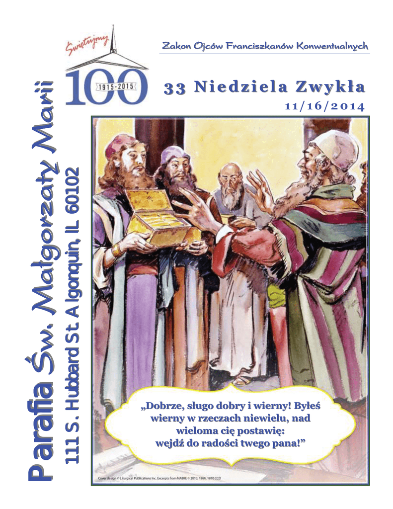 33 Niedziela Zwykła 11/16/2014 111 S. Hubbard St. Algonquin, lL 60102 Parafia Św. Małgorzaty Marii Zakon Ojców Franciszkanów Konwentualnych „Dobrze, sługo dobry i wierny! Byłeś wierny w rzeczach niewielu, nad wieloma cię postawię: wejdź do radości twego pana!” OD PROBOSZCZA „Jednemu dał pięć talentów, drugiemu dwa, trzeciemu jeden, każdemu według jego zdolności....” Drodzy Przyjaciele! W chwili wybuchu wojny polski śpiewak operowy Jan Kiepura znajdował się w Paryżu. Na wieść o wojnie chciał natychmiast wracać do ojczyzny, aby ratować swoich rodziców. Odradzono mu to, mówiąc: "Do Polski może dojedziesz, ale na pewno już nie wyjedziesz.” Wtedy Jan Kiepura wstąpił do formującej się we Francji Armii Polskiej. Przywdział mundur wojskowy i rozpoczął ćwiczenia polowe. Po dwóch tygodniach do jednostki przyjechał na inspekcję generał Sosnkowski i dowiedziawszy się, że wśród żołnierzy jest Jan Kiepura, wezwał go do siebie i powiedział: “Panie Janie, mamy tutaj wielu równie dobrze, jak pan, strzelających, ale ani jednego, który by lepiej od pana śpiewał. Niech pan zostawi mundur i karabin i jeździ z koncertami tam, gdzie można jeszcze dojechać. Dochód z tych koncertów proszę przekazywać do kasy naszej armii, formującej się na Zachodzie.” Kiepura występował w wielkich metropoliach, w mniejszych miastach i w szpitalach dla żołnierzy. Kiedy jednak Niemcy stanęli u wrót Paryża, wyjechał z Martą Eggerth ostatnim statkiem z Bordeaux do Nowego Jorku. W Ameryce występował na wielkich stadionach, które gromadziły dziesięć, dwadzieścia, trzydzieści tysięcy widzów. Koncerty zawsze zaczynał odśpiewaniem Hymnu Polskiego, a kończył ułożoną przez siebie do muzyki Chopina Modlitwą za Ojczyznę. Dochód z tych koncertów, przekraczający setki tysięcy dolarów, przekazywał na rzecz „Polskich Sił Zbrojnych” „To był Kiepura! Ale cóż ja?” - możemy powiedzieć. Jak czytamy w dzisiejszej Ewangelii, człowiek mający udać się w podróż dał talenty każdemu ze swoich sług, według ich zdolności. Osoba ta symbolizuje Boga, który każdemu z nas daje swoje talenty. Ale talent to coś więcej, niż tylko jakaś zdolność czy umiejętność. To nie tylko biegłość w czymś. Talent to coś więcej. Nasza wiara każe nam patrzeć na talent inaczej: szerzej. Talent to coś więcej. A co to takiego talent? Talent to wszystko to, co od Boga otrzymujemy. Wszystko – rzeczy radosne i rzeczy smutne, te budujące i te, które przeżywamy boleśnie. Przykłady? 1. Porażka, niepowodzenie duże i małe — to też talent. Gdy to niepowodzenie, tę porażkę przemyślimy, przemodlimy, to może dojdziemy do wniosków, które pomogą nam ulepszyć naszą przyszłość, unikać błędów w dalszym życiu. Porażka, niepowodzenie, to też talent. Może zaowocować wielkim dobrem w naszym życiu. Pozbywamy się złudzeń o naszej doskonałości. 2. Ból z powodu śmierci kogoś bliskiego. Tak, to też talent. To też Boży dar — dzięki niemu nabieramy dystansu do ziemskiego życia i wypatrujemy wieczności i nieraz uświadamiamy sobie, jak bardzo kochaliśmy tę osobę, ile jej zawdzięczamy – a to nas pobudza do czynnej miłości wobec tej zmarłej osoby: modlimy się za nią. 3. A gdy się zawiedziemy na kimś, to – choć jest to bardzo bolesne — też powinno być pojmowane jako talent, jako Boży dar. Może dzięki temu będziemy pamiętać, że w pełni należy ufać tylko Bogu i tylko w Nim w pełni pokładać nadzieję. 4. Gdy po raz kolejny popełnimy grzech, ten grzech, od którego tak uciekaliśmy, i może byliśmy pewni, że już jesteśmy od niego wolni: to też jest talent — będziemy może skromniej o sobie mniemać i opierać się nie na własnych siłach, ale na Bogu i Jego łasce. Odrzucimy iluzję o samowystarczalności. Talent więc, moi drodzy, to wszystko to, co daje nam Bóg, co On w naszym życiu dopuszcza: radosne i smutne; budujące i pozornie niszczące. Wszystko, bo Bóg prowadzi nas do siebie różnymi drogami. Pokój i Dobro, Fr. Peter Sarnicki, OFM, Conv. OGŁOSZENIA W poniedziałek 17 listopada zapraszamy na Mszę św. o 7 wieczorem i wypominki. We wtorek 18 listopada grupa modlitewna dla mam "Bliżej Świętej Rodziny" zaprasza na spotkanie o godz. 8:00 wieczorem w sali numer 2 budynku starej szkoły. Jest to okazja na pogłębienie lub odnowienie swojego życia duchowego, a także wspólna modlitwa w intencji naszych rodzin. Serdecznie Zapraszamy. Również we wtorek 18 listopada o godz. 7:00 wieczorem Msza św. dla dzieci specjalnej troski. Przypominamy o zapisywaniu się na sesje zdjęciowe portretów rodzinnych do naszej księgi pamiątkowej z okazji 100 – lecia Parafii. WYPOMINKI Karteczki z czytelnie napisanymi imionami zmarłych i ofiarami prosimy składać do skrzynki z napisem WYPOMINKI, która znajduje się na stoliku przy wyjściu z kościoła. BÓG ZAPŁAĆ Bardzo serdecznie dziękuję uczniom i nauczycielom Polskiej Szkoły, pod przewodnictwem Pana Tadeusza Młynka za przygotowanie i przedstawienie programu słowno-muzycznego z Okazji Święta Niepodległości. MYŚLI DNIA Jerzy Skolimowski wyznał, że dawniej roztrwaniał talent na sprawy popełniać tego błędu. nieistotne, teraz nie chce Samo nieumiarkowane pomnażanie talentów nie wystarcza, gdyż można wykorzystywać je także do złych celów. Ignacy Gogolowski twierdzi, że talenty powinny być w ręku człowieka latarniami oświecającymi siebie oraz innych. CUDOWNY ŚWIAT 80-TYCH LAT !!!! „Pamiętasz smak 80-tych lat, pamiętasz styl, który wtedy modny był…." Wróćmy pamięcią do cudownych lat 80-tych, gdzie królowały takie polskie przeboje jak "Nie płacz Ewka", "Jolka, Jolka Pamiętasz“ oraz zagraniczne utwory zespołów Bad Boys Blue, Modern Talking, Guns N’ Roses, Jennifer Rush i wiele, wiele innych. Zapraszamy na wspaniałą Zabawę Andrzejkową w stylu tych właśnie lat, g