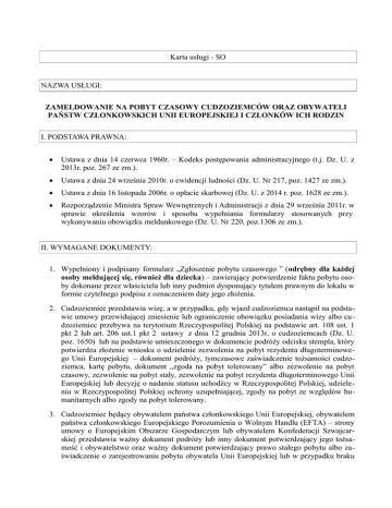 Karta usługi - SO NAZWA USŁUGI: ZAMELDOWANIE NA POBYT CZASOWY CUDZOZIEMCÓW ORAZ OBYWATELI PAŃSTW CZŁONKOWSKICH UNII EUROPEJSKIEJ I CZŁONKÓW ICH RODZIN I. PODSTAWA PRAWNA: Ustawa z dnia 14 czerwca 1960r. – Kodeks postępowania administracyjnego (t.j. Dz. U. z 2013r. poz. 267 ze zm.). Ustawa z dnia 24 września 2010r. o ewidencji ludności (Dz. U. Nr 217, poz. 1427 ze zm.). Ustawa z dnia 16 listopada 2006r. o opłacie skarbowej (Dz. U. z 2014 r. poz. 1628 ze zm.). Rozporządzenie Ministra Spraw Wewnętrznych i Administracji z dnia 29 września 2011r. w sprawie określenia wzorów i sposobu wypełniania formularzy stosowanych przy wykonywaniu obowiązku meldunkowego (Dz. U. Nr 220, poz.1306 ze zm.). II. WYMAGANE DOKUMENTY: 1. Wypełniony i podpisany formularz „Zgłoszenie pobytu czasowego ” (odrębny dla każdej osoby meldującej się, również dla dziecka) – zawierający potwierdzenie faktu pobytu osoby dokonane przez właściciela lub inny podmiot dysponujący tytułem prawnym do lokalu w formie czytelnego podpisu z oznaczeniem daty jego złożenia. 2. Cudzoziemiec przedstawia wizę, a w przypadku, gdy wjazd cudzoziemca nastąpił na podstawie umowy przewidującej zniesienie lub ograniczenie obowiązku posiadania wizy albo cudzoziemiec przebywa na terytorium Rzeczypospolitej Polskiej na podstawie art. 108 ust. 1 pkt 2 lub art. 206 ust.1 pkt 2 ustawy z dnia 12 grudnia 2013r. o cudzoziemcach (Dz. U. poz. 1650) lub na podstawie umieszczonego w dokumencie podróży odcisku stempla, który potwierdza złożenie wniosku o udzielenie zezwolenia na pobyt rezydenta długoterminowego Unii Europejskiej – dokument podróży, tymczasowe zaświadczenie tożsamości cudzoziemca, kartę pobytu, dokument „zgoda na pobyt tolerowany” albo zezwolenie na pobyt czasowy, zezwolenie na pobyt stały, zezwolenie na pobyt rezydenta długoterminowego Unii Europejskiej lub decyzję o nadaniu statusu uchodźcy w Rzeczypospolitej Polskiej, udzieleniu w Rzeczypospolitej Polskiej ochrony uzupełniającej, zgody na pobyt ze względów humanitarnych albo zgody na pobyt tolerowany. 3. Cudzoziemiec będący obywatelem państwa członkowskiego Unii Europejskiej, obywatelem państwa członkowskiego Europejskiego Porozumienia o Wolnym Handlu (EFTA) – strony umowy o Europejskim Obszarze Gospodarczym lub obywatelem Konfederacji Szwajcarskiej przedstawia ważny dokument podróży lub inny dokument potwierdzający jego tożsamość i obywatelstwo oraz ważny dokument potwierdzający prawo stałego pobytu albo zaświadczenie o zarejestrowaniu pobytu obywatela Unii Europejskiej lub w przypadku braku zaświadczenia, składa oświadczenie o zarejestrowaniu pobytu na terytorium Rzeczypospolitej Polskiej. 4. Członek rodziny obywatela będącego obywatelem państwa członkowskiego Unii Europejskiej, obywatelem państwa członkowskiego Europejskiego Porozumienia o Wolnym Handlu (EFTA) – strony umowy o Europejskim Obszarze Gospodarczym lub obywatelem Konfederacji Szwajcarskiej niebędący obywatelem ww. państw przedstawia ważny dokument podróży oraz ważną kartę stałego pobytu członka rodziny obywatela Unii Europejskiej lub ważną kartę pobytu członka rodziny obywatela Unii Europejskiej. 5. Dokument potwierdzający tytuł prawny do lokalu, którym może być umowa cywilno-prawna, wypis z księgi wieczystej, decyzja administracyjna, orzeczenie sądu lub inny dokument poświadczający tytuł prawny do lokalu – do wglądu (w oryginale). 6. W przypadku zgłoszenia zameldowania przez pełnomocnika dodatkowo: – pisemne pełnomocnictwo do zameldowania, – dowód osobisty pełnomocnika lub paszport. III. OPŁATY: Nie pobiera się opłat za dokonanie czynności dotyczących realizacji obowiązku meldunkowego. 17 zł – opłata skarbowa za wydanie zaświadczenia na wniosek osoby dokonującej zameldowania na pobyt czasowy lub jej pełnomocnika: przelewem, przekazem na rachunek bankowy Urzędu Gminy w Lubinie – Bank Spółdzielczy we Wschowie Oddział w Lubinie: 44 8669 0001 0311 6863 2000 0001 lub bezpośrednio w kasie Urzędu Gminy. 17 zł – opłata skarbowa za złożenie pełnomocnictwa (w przypadku, gdy wnioskodawca działa przez pełnomocnika). Opłatę skarbową za złożenie pełnomocnictwa wnosi się w kasie Urzędu Miejskiego w Lubinie, ul. Kilińskiego 10 albo bezpośrednio na następujący rachunek bankowy Urzędu Miejskiego w Lubinie w Lubinie: PeKaO S.A. 03 1240 3464 1111 0010 2751 1223 IV. TERMIN ZAŁATWIENIA SPRAWY: Bez zbędnej zwłoki. V. MIEJSCE ZŁOŻENIA DOKUMENTÓW: Formularze przyjmowane są w pok. 4 (parter) – Referat Organizacyjny i Spraw Obywatelskich – codziennie od poniedziałku do piątku w godz. 7.30-15.30 z wyjątkiem wtorku w godz. 8.00-16.00. Wszelkich informacji w sprawach jw. udziela pracownik Referatu Organizacyjnego i Spraw Obywatelskich pod numerem tel. 076/84-03-103, 076/84-03-104 lub 076/84-03-144. VI. TRYB ODWOŁAWCZY: Brak, czynność materialno-techniczna. VII. UWAGI: 1. Obywatel polski przebywający na terytorium Rzeczypospolitej Polskiej jest obowiązany zameldować się w miejscu pobytu czasowego najpóźniej w 30. dniu, licząc od dnia przybycia do tego miejsca. 2. Zgłoszenia zameldowania na pobyt czasowy dokonuje się w formie pisemnej, na formularzu „Zgłoszenie pobytu czasowego”. Przy zameldowaniu na pobyt czasowy należy wskazać deklarowany okres pobytu, przy czym pobyt czasowy jest rozumiany jako przebywanie poza miejscem pobytu stałego przez okres ponad 3 miesięcy. 3. Osoba zgłaszająca pobyt czasowy może otrzymać na własny wniosek zaświadczenie o zameldowaniu na własny wniosek. Zaświadczenie jest ważne do chwili zmiany miejsca zameldowania, jednak nie dłużej niż do upływu terminu zameldowania. 4. W przypadku zmiany miejsca pobytu czasowego nie jest wymagane wymeldowanie się z poprzedniego miejsca pobytu czasowego. Czynności tej można dokonać przy zgłoszeniu nowego miejsca pobytu czasowego. 5. Zameldowania na pobyt czasowy mo