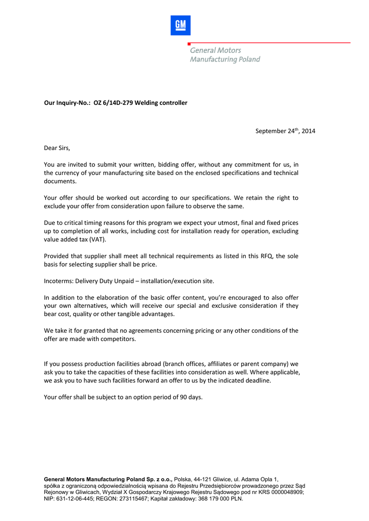 Our Inquiry-No.: OZ 6/14D-279 Welding controller September 24th, 2014 Dear Sirs, You are invited to submit your written, bidding offer, without any commitment for us, in the currency of your manufacturing site based on the enclosed specifications and technical documents. Your offer should be worked out according to our specifications. We retain the right to exclude your offer from consideration upon failure to observe the same. Due to critical timing reasons for this program we expect your utmost, final and fixed prices up to completion of all works, including cost for installation ready for operation, excluding value added tax (VAT). Provided that supplier shall meet all technical requirements as listed in this RFQ, the sole basis for selecting supplier shall be price. Incoterms: Delivery Duty Unpaid – installation/execution site. In addition to the elaboration of the basic offer content, you’re encouraged to also offer your own alternatives, which will receive our special and exclusive consideration if they bear cost, quality or other tangible advantages. We take it for granted that no agreements concerning pricing or any other conditions of the offer are made with competitors. If you possess production facilities abroad (branch offices, affiliates or parent company) we ask you to take the capacities of these facilities into consideration as well. Where applicable, we ask you to have such facilities forward an offer to us by the indicated deadline. Your offer shall be subject to an option period of 90 days. General Motors Manufacturing Poland Sp. z o.o., Polska, 44-121 Gliwice, ul. Adama Opla 1, spółka z ograniczoną odpowiedzialnością wpisana do Rejestru Przedsiębiorców prowadzonego przez Sąd Rejonowy w Gliwicach, Wydział X Gospodarczy Krajowego Rejestru Sądowego pod nr KRS 0000048909; NIP: 631-12-06-445; REGON: 273115467; Kapitał zakładowy: 368 179 000 PLN. Before working out your offer in detail, the technical scope has to be discussed with our technical department. For this purpose please contact: Mr. Marcin Cieszyński Tel.: +48 728 417 336 Email: [email protected] Terms of Payment: Basic Concept (AC) ( x ) nd nd The invoice will be paid 100 % on the 2 day of the 2 month, following receipt date/final acceptance. Payment will be net (including VAT if necessary). Delivery date/completion date: as defined in the specifications Deadline for submission of the offer: November 8th, 2014 We reserve the right to exclude from consideration any offers that are received later than the above mentioned time as well as offers that are corrected after-the-fact without having to specify our reasons for such exclusion. Please send your quotes only to General Motors Manufacturing Poland Sp. z o.o. as hardcopy (in duplicate) or E-Mail; do not use Fax. NOTE: ZIP-FILES AND MOST OF THE COMMONLY USED MEDIA-FILES (e. g. JPEG, GIF, WMV, …) DON’T PASS GM’S FIREWALL Please inform us whether you will submit the offer in due time. If you decline to quote, we ask you to indicate the reason(s) for declining in writing. Yours faithfully Joanna Jedryka General Motors Manufacturing Poland Sp. z o.o. General Motors Manufacturing Poland Sp. z o.o., Polska, 44-121 Gliwice, ul. Adama Opla 1, spółka z ograniczoną odpowiedzialnością wpisana do Rejestru Przedsiębiorców prowadzonego przez Sąd Rejonowy w Gliwicach, Wydział X Gospodarczy Krajowego Rejestru Sądowego pod nr KRS 0000048909; NIP: 631-12-06-445; REGON: 273115467; Kapitał zakładowy: 368 179 000 PLN. BASIS FOR ELABORATION OF THE OFFER General Terms and Conditions (as attached to the inquiry-package submitted together with this Inquiry-Letter). Complete data specified in the inquiry-package submitted together with this Inquiry-Letter. RIGHT TO AUDIT CLAUSE Seller shall grant to Buyer the right to audit and inspect at Seller's premises all documents directly or indirectly related to the business of the parties and grant access to his records and books to verify the correctness of the charges invoiced and their compliance with the contractual agreements. Seller shall comply with these obligations at all times during regular business hours. Seller shall guarantee that his subcontractors shall grant for "time and material" type contracts to Buyer the same right to audit their records and books at their premises. PENALTY CLAUSE Seller is liable - without prejudice to Buyer’s right to claim for damages in an unlimited amount - to pay a penalty of 0,5 % of the amount of the contract for every commenced week of late fulfillment, particularly delivery, commissioning completion of readiness for operation according to the agreed and guaranteed figures, up to the maximum rate of 5 % of the amount of the contract. Buyer reserves the right to claim the penalty for breach of the contract until the final invoice has been settled. SUB-CONTRACTOR INVOLVEMENT If Seller intends to pass on portions of this inquiry or the complete scope to (a) subcontractor(s) Seller is obliged to name the sub-contractor(s) within the offer. Buyer reserves the right to assess (the) nominated sub-contractor(s) and reject any without appropriate qualifications. In case of an order placement this applies during the execution, as well. ASTE DEPOSIT LIABILITY With the execution of any order it is Seller’s liability to only store, transport or recycle material, equipment, machinery etc. which has to be disassembled or assembled, if Seller doesn’t expect any environmental damages. Precaution measures (e.g. availability of containers, canvas covers, etc.) are to be taken by the Seller in time and to the necessary degree independently whether these are contractually Seller’s or Buyer’s obligation. In case Buyer would notice any improper waste deposit that Seller is responsible for, Buyer will immediately secure it in containers at Seller’s costs. General Motors Manufacturing Poland Sp. z o.o., Polska, 44-121 Gliwice, ul. Adama Opla 1, spółka z ograniczoną odpowiedzi
