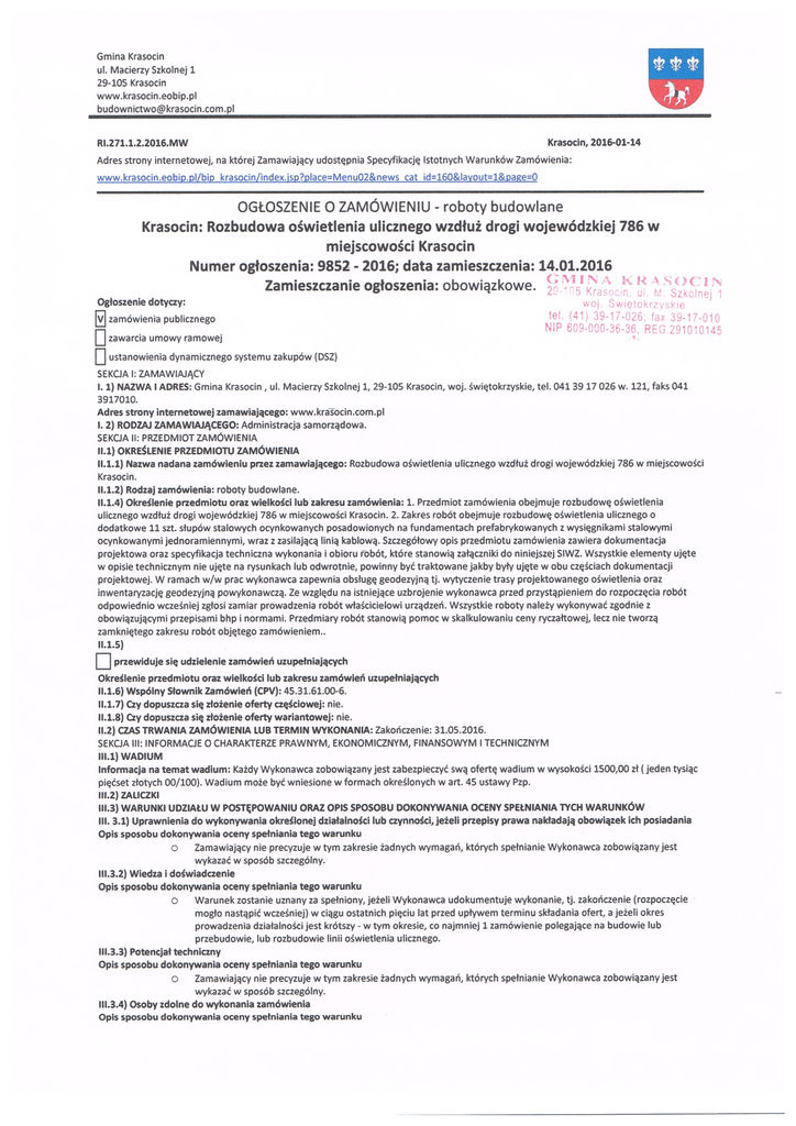 OGŁOSZENIE O ZAMÓWIENIU - roboty budowlane Krasocin