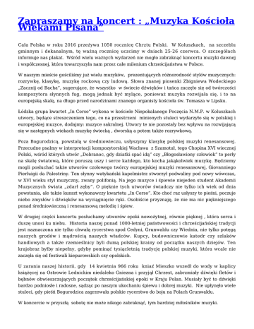 Zapraszamy na koncert : „Muzyka Kościoła Wiekami Pisana” Cała Polska w roku 2016 przeżywa 1050 rocznicę Chrztu Polski. W Koluszkach, na szczeblu gminnym i dekanalnym, tę ważną rocznicę uczcimy w dniach 25-26 czerwca. O szczegółach informuje nas plakat. Wśród wielu ważnych wydarzeń nie mogło zabraknąć koncertu muzyki dawnej i współczesnej, która towarzyszyła nam przez całe milenium chrześcijaństwa w Polsce. W naszym mieście gościliśmy już wielu muzyków, prezentujących różnorodność stylów muzycznych: rozrywkę, klasykę, muzykę rockową czy ludową. Słowa znanej piosenki Zbigniewa Wodeckiego „Zacznij od Bacha”, sugerujące, że wszystko w świecie dźwięków i tańca zaczęło się od twórczości kompozytora słynnych fug, mogą jednak być mylące, ponieważ muzyka rozwijała się, i to na europejską skalę, na długo przed narodzinami znanego organisty kościoła św. Tomasza w Lipsku. Łódzka grupa kwartet „In Corso” wykona w kościele Niepokalanego Poczęcia N.M.P. w Koluszkach utwory, będące streszczeniem tego, co na przestrzeni minionych stuleci wydarzyło się w polskiej i europejskiej muzyce, dodajmy: muzyce sakralnej. Utwory te nie pozostały bez wpływu na rozwijającą się w następnych wiekach muzykę świecką , dworską a potem także rozrywkową. Poza Bogurodzicą, powstałą w średniowieczu, usłyszymy klasykę polskiej muzyki renesansowej. Przecudne psalmy w interpretacji kompozytorskiej Wacława z Szamotuł, tego Chopina XVI wiecznej Polski, wśród których utwór „Dobranoc, gdy dziatki spać idą” czy „Błogosławiony człowiek” to perły na skalę światową, które poruszą uszy i serce każdego, kto kocha jakąkolwiek muzykę. Będziemy mogli posłuchać także utworów czołowego twórcy europejskiej muzyki renesansowej, Giovanniego Pierluigii da Palestriny. Ten słynny watykański kapelmistrz stworzył podwaliny pod nowy wówczas, w XVI wieku styl muzyczny, zwany polifonią. Na jego muzyce i śpiewie niejeden student Akademii Muzycznych świata „zdarł zęby”. O pięknie tych utworów świadczy nie tylko ich wiek od dnia powstania, ale także kunszt wykonawczy kwartetu „In Corso”. Kto choć raz usłyszy te pieśni, poczuje niebo zmysłów i dźwięków na wyciągnięcie ręki. Osobiście przyznaję, że nie ma nic piękniejszego ponad średniowieczną i renesansową melodię i śpiew. W drugiej części koncertu posłuchamy utworów epoki nowożytnej, równie pięknej , która serca i duszę unosi ku niebu. Historia naszej ponad 1000-letniej państwowości i chrześcijańskiej tradycji jest naznaczona nie tylko chwałą rycerstwa spod Cedyni, Grunwaldu czy Wiednia, nie tylko potęgą naszych grodów i mądrością naszych władców. Kupcy, budowniczowie katedr czy szlaków handlowych a także rzemieślnicy byli dumą polskiej krainy od początku naszych dziejów. Ten krajobraz byłby niepełny, gdyby pominąć tysiącletnią tradycję polskiej muzyki, która wcale nie zaczęła się od festiwali kiepurowskich czy opolskich. U zarania naszej historii, gdy 14 kwietnia 966 roku kniaź Mieszko wszedł do wody w kaplicy książęcej na Ostrowie Lednickim niedaleko Gniezna i przyjął Chrzest, zabrzmiały dźwięki fletów i bębnów obwieszczających początek chrześcijańskiej epoki w Kraju Polan. Musiały być to dźwięki bardzo podniosłe i radosne, sądząc po naszym ukochaniu śpiewu i dobrej muzyki. Nie upłynęło wiele stuleci, gdy pieśń Bogurodzica zagrzewała polskie rycerstwo do boju na Polach Grunwaldu. W koncercie w przyszłą sobotę nie może nikogo zabraknąć, tym bardziej miłośników muzyki. 25 czerwca 2016 roku, kościół Niepokalanego Poczęcia N.M.P. w Koluszkach , godz. 19.30. Zapraszamy!