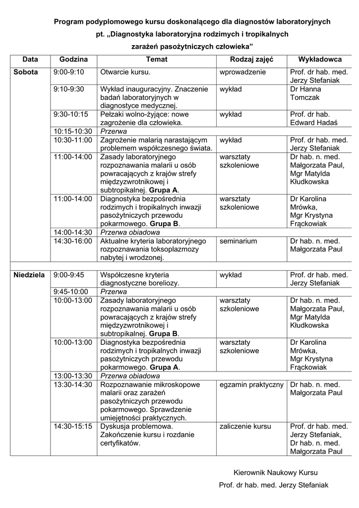 Program podyplomowego kursu doskonalącego dla diagnostów laboratoryjnych pt. „Diagnostyka laboratoryjna rodzimych i tropikalnych zarażeń pasożytniczych człowieka” Data Sobota Godzina Rodzaj zajęć 9:00-9:10 Otwarcie kursu. wprowadzenie 9:10-9:30 Wykład inauguracyjny. Znaczenie badań laboratoryjnych w diagnostyce medycznej. Pełzaki wolno-żyjące: nowe zagrożenie dla człowieka. Przerwa Zagrożenie malarią narastającym problemem współczesnego świata. Zasady laboratoryjnego rozpoznawania malarii u osób powracających z krajów strefy międzyzwrotnikowej i subtropikalnej. Grupa A. Diagnostyka bezpośrednia rodzimych i tropikalnych inwazji pasożytniczych przewodu pokarmowego. Grupa B. Przerwa obiadowa Aktualne kryteria laboratoryjnego rozpoznawania toksoplazmozy nabytej i wrodzonej. wykład Współczesne kryteria diagnostyczne boreliozy. Przerwa Zasady laboratoryjnego rozpoznawania malarii u osób powracających z krajów strefy międzyzwrotnikowej i subtropikalnej. Grupa B. Diagnostyka bezpośrednia rodzimych i tropikalnych inwazji pasożytniczych przewodu pokarmowego. Grupa A. Przerwa obiadowa Rozpoznawanie mikroskopowe malarii oraz zarażeń pasożytniczych przewodu pokarmowego. Sprawdzenie umiejętności praktycznych. Dyskusja problemowa. Zakończenie kursu i rozdanie certyfikatów. 9:30-10:15 10:15-10:30 10:30-11:00 11:00-14:00 11:00-14:00 14:00-14:30 14:30-16:00 Niedziela Temat 9:00-9:45 9:45-10:00 10:00-13:00 10:00-13:00 13:00-13:30 13:30-14:30 14:30-15:15 Wykładowca Prof. dr hab. med. Jerzy Stefaniak Dr Hanna Tomczak wykład Prof. dr hab. Edward Hadaś wykład Prof. dr hab. med. Jerzy Stefaniak Dr hab. n. med. Małgorzata Paul, Mgr Matylda Kłudkowska warsztaty szkoleniowe warsztaty szkoleniowe Dr Karolina Mrówka, Mgr Krystyna Frąckowiak seminarium Dr hab. n. med. Małgorzata Paul wykład Prof. dr hab. med. Jerzy Stefaniak warsztaty szkoleniowe Dr hab. n. med. Małgorzata Paul, Mgr Matylda Kłudkowska warsztaty szkoleniowe Dr Karolina Mrówka, Mgr Krystyna Frąckowiak egzamin praktyczny Dr hab. n. med. Małgorzata Paul zaliczenie kursu Prof. dr hab. med. Jerzy Stefaniak, Dr hab. n. med. Małgorzata Paul Kierownik Naukowy Kursu Prof. dr hab. med. Jerzy Stefaniak