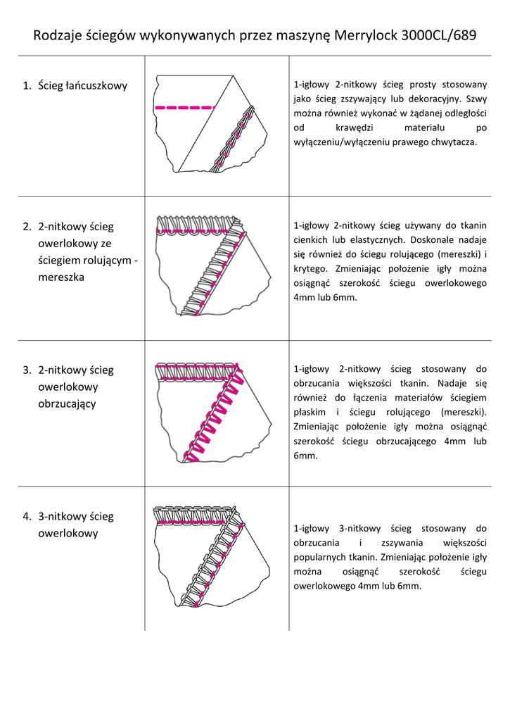 Rodzaje ściegów wykonywanych przez maszynę Merrylock 3000CL/689 1. Ścieg łańcuszkowy 1-igłowy 2-nitkowy ścieg prosty stosowany jako ścieg zszywający lub dekoracyjny. Szwy można również wykonać w żądanej odległości od krawędzi materiału po wyłączeniu/wyłączeniu prawego chwytacza. 2. 2-nitkowy ścieg owerlokowy ze ściegiem rolującym mereszka 1-igłowy 2-nitkowy ścieg używany do tkanin cienkich lub elastycznych. Doskonale nadaje się również do ściegu rolującego (mereszki) i krytego. Zmieniając położenie igły można osiągnąć szerokość ściegu owerlokowego 4mm lub 6mm. 3. 2-nitkowy ścieg owerlokowy obrzucający 1-igłowy 2-nitkowy ścieg stosowany do obrzucania większości tkanin. Nadaje się również do łączenia materiałów ściegiem płaskim i ściegu rolującego (mereszki). Zmieniając położenie igły można osiągnąć szerokość ściegu obrzucającego 4mm lub 6mm. 4. 3-nitkowy ścieg owerlokowy 1-igłowy 3-nitkowy ścieg stosowany do obrzucania i zszywania większości popularnych tkanin. Zmieniając położenie igły można osiągnąć szerokość ściegu owerlokowego 4mm lub 6mm. 5. 3-nitkowy płaski 1-igłowy 3-nitkowy ścieg używany do ściegów przylegających lub „na zakładkę” oraz do ozdabiania nićmi dekoracyjnymi. Zmieniając położenie igły można osiągnąć szerokość ściegu 4mm lub 6mm. 6. 3-nitkowy ścieg elastyczny wzmocniony 7. 4-nitkowy ścieg elastyczny wzmocniony 8. 4-nitkowy ścieg obrzucający z dodatkowym ściegiem łańcuszkowym 9. 5-nitkowy szeroki Ścieg obrzucający z dodatkowym ściegiem łańcuszkowym 2-igłowy 3-nitkowy ścieg doskonale nadaje się do cienkich i bardzo elastycznych tkanin (trykot, strecz, spandex). 2-igłowy 4-nitkowy ścieg doskonale nadaje się do większości elastycznych dzianin i tkanin . 2-igłowy 4-nitkowy ścieg będący połączeniem 2-nitkowego ściegu obrzucającego i ściegu zszywającego łańcuszkowego. 2-igłowy 5-nitkowy ścieg będący kombinacją 3-nitkowego ściegu obrzucającego i ściegu zszywającego łańcuszkowego. Szew jest szeroki dzięki użyciu lewej igły. Ścieg ten pozwalana na jednoczesne obrzucanie i szycie. Stosuje się do tkanin nieelastycznych. 10. 5-nitkowy wąski Ścieg obrzucający z dodatkowym ściegiem łańcuszkowym 11. Wąski ścieg drabinkowy (2,8mm) 2-igłowy 5-nitkowy ścieg będący kombinacją -nitkowego ściegu obrzucającego i ściegu zszywającego łańcuszkowego. Szew jest szeroki dzięki użyciu prawej igły Ścieg ten pozwalana na jednoczesne obrzucanie i szycie. Stosuje się do tkanin nieelastycznych. 2-igłowy 3-nitkowy ścieg drabinkowy nadający się do tkanin elastycznych i dzianin. Szew jest wąski i środkowej igły. 12. Szeroki ścieg drabinkowy (5,6mm) dzięki użyciu lewej 2-igłowy 3-nitkowy ścieg drabinkowy nadający się do tkanin elastycznych i dzianin. Szew jest szeroki dzięki użyciu skrajnych igieł (lewej i prawej ). 13. Potrójny ścieg drabinkowy (5,6mm) 3-igłowy 4-nitkowy ścieg drabinkowy, który jest przeznaczony do szycia tkanin elastycznych i dzianin. Potrójny szew powstaje przy użyciu lewej, środkowej oraz prawej igły. 14. 3-nitkowy ścieg rolujący 1-iłgowy 3-nitkowy ścieg używany do szycia ściegiem rolującego (mereszką).