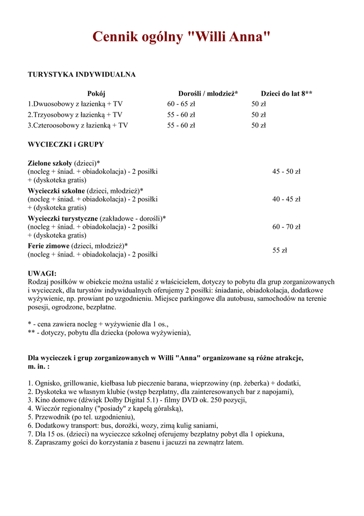 7. Dla 15 os. (dzieci) na wycieczce szkolnej oferujemy bezpłatny pobyt dla 1 opiekuna,
