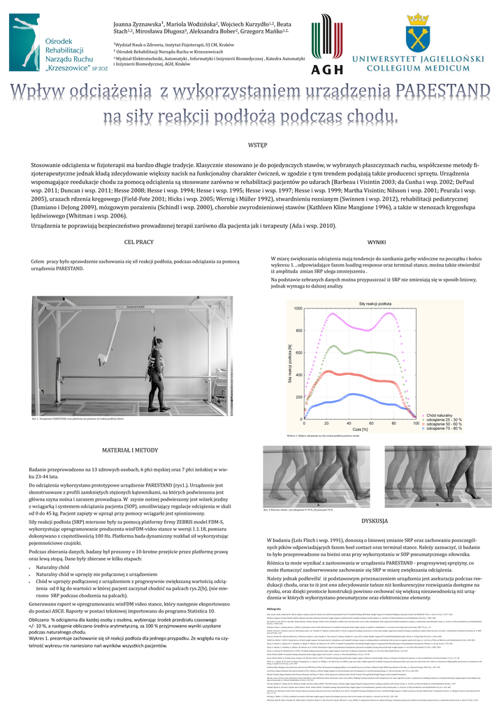 Joanna Zyznawska¹, Mariola Wodzinska2, Wojciech Kurzydło1,2, Beata Stach1,2, Mirosława Długosz3, Aleksandra Bober2, Grzegorz Manko1,2, ¹Wydział Nauk o Zdrowiu, Instytut Fizjoterapii, UJ CM, Krakow ² Osrodek Rehabilitacji Narządu Ruchu w Krzeszowicach 3 Wydział Elektrotechniki, Automatyki , Informatyki i Inzynierii Biomedycznej , Katedra Automatyki i Inzynierii Biomedycznej, AGH, Krakow WSTĘP Stosowanie odciązenia w fizjoterapii ma bardzo długie tradycje. Klasycznie stosowano je do pojedynczych stawow, w wybranych płaszczyznach ruchu, wspołczesne metody fizjoterapeutyczne jednak kładą zdecydowanie większy nacisk na funkcjonalny charakter cwiczen, w zgodzie z tym trendem podązają takze producenci sprzętu. Urządzenia wspomagające reedukacje chodu za pomocą odciązenia są stosowane zarowno w rehabilitacji pacjentow po udarach (Barbeau i Visintin 2003; da Cunha i wsp. 2002; DePaul wsp. 2011; Duncan i wsp. 2011; Hesse 2008; Hesse i wsp. 1994; Hesse i wsp. 1995; Hesse i wsp. 1997; Hesse i wsp. 1999; Martha Visintin; Nilsson i wsp. 2001; Peurala i wsp. 2005), urazach rdzenia kręgowego (Field-Fote 2001; Hicks i wsp. 2005; Wernig i Muller 1992), stwardnieniu rozsianym (Swinnen i wsp. 2012), rehabilitacji pediatrycznej (Damiano i DeJong 2009), mozgowym porazeniu (Schindl i wsp. 2000), chorobie zwyrodnieniowej stawow (Kathleen Kline Mangione 1996), a takze w stenozach kręgosłupa lędzwiowego (Whitman i wsp. 2006). Urządzenia te poprawiają bezpieczenstwo prowadzonej terapii zarowno dla pacjenta jak i terapeuty (Ada i wsp. 2010). CEL PRACY Celem pracy było sprawdzenie zachowania się sił reakcji podłoza, podczas odciązania za pomocą urządzenia PARESTAND. WYNIKI W miarę zwiększania odciązenia mają tendencje do zanikania garby widoczne na początku i koncu wykresu 1. , odpowiadające fazom loading response oraz terminal stance, mozna takze stwierdzic iz amplituda zmian SRP ulega zmniejszeniu . Na podstawie zebranych danych mozna przypuszczac iz SRP nie zmieniają się w sposob liniowy, jednak wymaga to dalszej analizy. Rys 1. Urządzenie PARESTAND, oraz platforma do pomiaru sił reakcji podłoza Zebris Wykres 1. Wpływ odciązenia na siły reakcji podłoza podczas chodu MATERIAŁ I METODY Badanie przeprowadzono na 13 zdrowych osobach, 6 płci męskiej oraz 7 płci zenskiej w wieku 23-44 lata. Do odciązenia wykorzystano prototypowe urządzenie PARESTAND (rys1.). Urządzenie jest skonstruowane z profili zamkniętych stęzonych kątownikami, na ktorych podwieszona jest głowna szyna nosna i zarazem prowadząca. W szynie nosnej podwieszony jest wozek jezdny z wciągarką i systemem odciązania pacjenta (SOP), umozliwiający regulacje odciązenia w skali od 0 do 45 kg. Pacjent zapięty w uprząz przy pomocy wciągarki jest spionizowany. Siły reakcji podłoza (SRP) mierzone były za pomocą platformy firmy ZEBRIS model FDM-S, wykorzystując oprogramowanie producenta winFDM-video stance w wersji 1.1.18, pomiaru dokonywano z częstotliwoscią 100 Hz. Platforma bada dynamiczny rozkład sił wykorzystując pojemnosciowe czujniki. Podczas zbierania danych, badany był proszony o 10-krotne przejscie przez platformę prawą oraz lewą stopą. Dane były zbierane w kilku etapach: Naturalny chod Naturalny chod w uprzęzy nie połączonej z urządzeniem Chod w uprzęzy podłączonej z urządzeniem z progresywnie zwiększaną wartoscią odciązenia od 0 kg do wartosci w ktorej pacjent zaczynał chodzic na palcach rys.2(b), (nie mierzono SRP podczas chodzenia na palcach). Generowano raport w oprogramowaniu winFDM video stance, ktory następnie eksportowano do postaci ASCII. Raporty w postaci tekstowej importowano do programu Statistica 10. Obliczano % odciążenia dla każdej osoby z osobna, wybierając środek przedziału czasowego +/- 10 %, a następnie obliczano średnia arytmetyczną, za 100 % przyjmowano wyniki uzyskane podczas naturalnego chodu. Wykres 1. prezentuje zachowanie się sił reakcji podłoża dla jednego przypadku. Ze względu na czytelność wykresu nie naniesiono nań wyników wszystkich pacjentów. a. b. Rys. 2 Wzorzec chodu : (a) odciązenie 0-70 %, (b) powyzej 70 % DYSKUSJA W badaniu (Lols Flnch i wsp. 1991), donoszą o liniowej zmianie SRP oraz zachowaniu poszczegolnych pikow odpowiadających fazom heel contact oraz terminal stance. Nalezy zaznaczyc, iz badanie to było przeprowadzone na biezni oraz przy wykorzystaniu w SOP pneumatycznego siłownika. Roznica ta moze wynikac z zastosowania w urządzeniu PARESTAND - progresywnej spręzyny, co moze tłumaczyc zaobserwowane zachowanie się SRP w miarę zwiększania odciązenia. Nalezy jednak podkreslic iz podstawowym przeznaczeniem urządzenia jest asekuracja podczas reedukacji chodu, oraz to iz jest ono zdecydowanie tansze niz konkurencyjne rozwiązania dostępne na rynku, oraz dzięki prostocie konstrukcji powinno cechowac się większą niezawodnoscią niz urządzenia w ktorych wykorzystano pneumatyczne oraz elektroniczne elementy. Bibliografia Ada, Louise; Dean, Catherine M.; Morris, Meg E.; Simpson, Judy M.; Katrak, Pesi (2010): Randomized Trial of Treadmill Walking With Body Weight Support to Establish Walking in Subacute Stroke The MOBILISE Trial. w: Stroke 41 (6), s. 1237–1242. Barbeau, Hugues; Visintin, Martha (2003): Optimal outcomes obtained with body-weight support combined with treadmill training in stroke subjects. w: Archives of Physical Medicine and Rehabilitation 84 (10), s. 1458–1465. da Cunha, In; Lim, Peter A.; Qureshy, Huma; Henson, Helene; Monga, Trilok; Protas, Elizabeth J. (2002): Gait outcomes after acute stroke rehabilitation with supported treadmill ambulation training: a randomized controlled pilot study. w: Archives of Physical Medicine and Rehabilitation 83 (9), s. 1258–1265. Damiano, Diane L.; DeJong, Stacey L. (2009): A systematic review of the effectiveness of treadmill training and body weight support in pediatric rehabilitation. w: Journal of neurologic physical therapy: