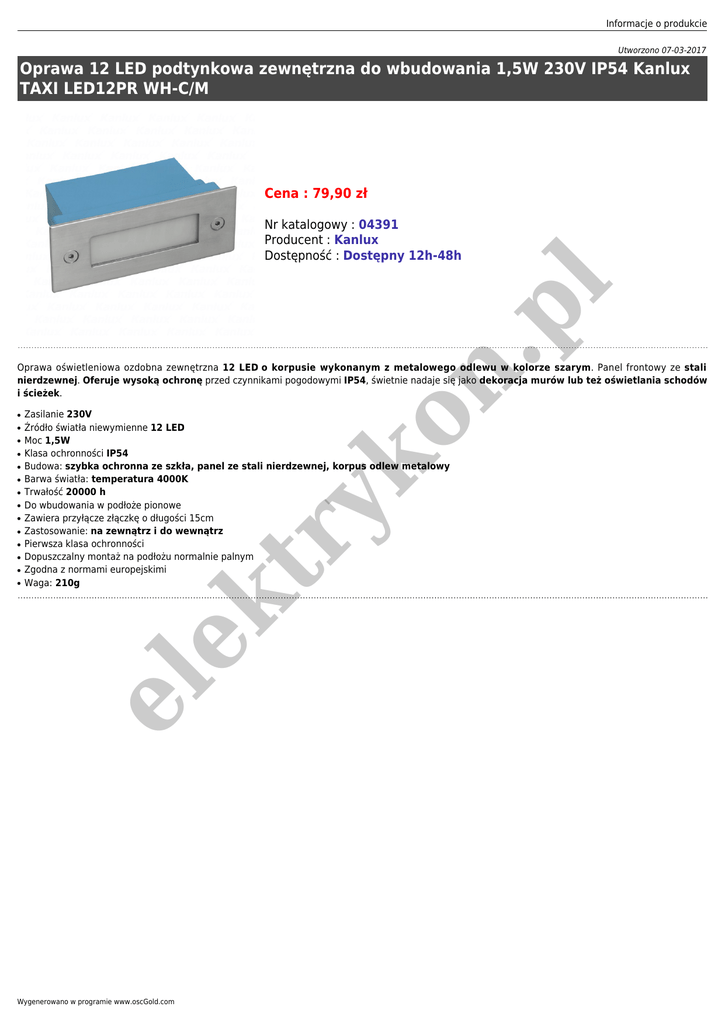 Informacje o produkcie Utworzono 07-03-2017 Oprawa 12 LED podtynkowa zewnętrzna do wbudowania 1,5W 230V IP54 Kanlux TAXI LED12PR WH-C/M Cena : 79,90 zł on . pl Nr katalogowy : 04391 Producent : Kanlux Dostępność : Dostępny 12h-48h Oprawa oświetleniowa ozdobna zewnętrzna 12 LED o korpusie wykonanym z metalowego odlewu w kolorze szarym. Panel frontowy ze stali nierdzewnej. Oferuje wysoką ochronę przed czynnikami pogodowymi IP54, świetnie nadaje się jako dekoracja murów lub też oświetlania schodów i ścieżek. ● ● ● ● ● ● ● ● ● ● ● el ek ● Zasilanie 230V Źródło światła niewymienne 12 LED Moc 1,5W Klasa ochronności IP54 Budowa: szybka ochronna ze szkła, panel ze stali nierdzewnej, korpus odlew metalowy Barwa światła: temperatura 4000K Trwałość 20000 h Do wbudowania w podłoże pionowe Zawiera przyłącze złączkę o długości 15cm Zastosowanie: na zewnątrz i do wewnątrz Pierwsza klasa ochronności Dopuszczalny montaż na podłożu normalnie palnym Zgodna z normami europejskimi Waga: 210g yk ● tr ● Wygenerowano w programie www.oscGold.com