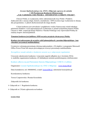 Liceum Ogólnokształcące im. ONZ w Biłgoraju zaprasza do udziału w III Powiatowym Konkursie Historycznym „TAK NARODZIŁA SIĘ POLSKA. 1050 ROCZNICA CHRZTU POLSKI”. Chrzest Polski, to wydarzenie, które zdeterminowało losy Polski i Polaków. Zadecydowało o naszej religii, historii, mentalności. 1050 rocznica tego wydarzenia to okazja, aby przypomnieć, w jakich okolicznościach do niego doszło. Celem konkursu jest utrwalenie i pogłębienie wiedzy historycznej wśród młodego pokolenia Polaków o tym najważniejszym wydarzeniu w ponad tysiącletniej historii Polski. Chrzest w 966r. rozpoczął dzieje Państwa i Narodu Polskiego oraz wprowadził Polskę do rodziny krajów chrześcijańskich. Tematem konkursu jest jubileusz 1050 rocznicy przyjęcia chrztu przez Polskę. Konkurs jest adresowany do uczniów szkół gimnazjalnych z powiatu biłgorajskiego i ma charakter prezentacji multimedialnej. Uczniowie wykonują prezentację złożoną maksymalnie z 20 slajdów w programie Microsoft Office Power Point lub innym pozwalającym tworzyć prezentacje multimedialne. Szczegółowe zasady udziału w konkursie zawarte są w załączonym regulaminie. Uroczyste zakończenie konkursu i wręczenie nagród odbędzie się w kwietniu 2016r. w siedzibie organizatora konkursu. (O dokładnym terminie poinformujemy telefonicznie) Konkurs odbywa się pod Patronatem Starosty Biłgorajskiego i UMCS w Lublinie. Organizator: Liceum Ogólnokształcące im. ONZ w Biłgoraju www.loonz.lbl.pl Dane kontaktowe; tel. 846860442, e-mail: [email protected], [email protected] Koordynatorzy konkursu: Teresa Czaporowska i Renata Krzesińska Załączniki do konkursu: Załącznik nr 1 Regulamin konkursu Załącznik nr 2 Karta zgłoszenia na konkurs (czytaj niżej) REGULAMIN KONKURSU I. Organizator konkursu: Liceum Ogólnokształcące im. ONZ w Biłgoraju ul. Kościuszki 41/43 we współpracy ze Starostwem Powiatowym w Biłgoraju i Uniwersytetem im. Marii Curie Skłodowskiej w Lublinie. II. Adresat konkursu: Uczniowie szkół gimnazjalnych powiatu biłgorajskiego III. Cele konkursu: - pogłębienie i utrwalenie wiedzy historycznej - promocja edukacji historycznej - budzenie szacunku dla dokonań przeszłych pokoleń - kształtowanie postaw patriotycznych wśród młodzieży - rozwijanie umiejętności wyszukiwania i korzystania z informacji zawartych w różnych źródłach oraz wykorzystania multimediów IV. Zakres tematyczny: 1. Przedmiotem konkursu jest przygotowanie prezentacji multimedialnej poświęconej 1050 rocznicy chrztu Polski. W prezentacji mogą być zawarte: krótkie informacje tekstowe, obrazy, zdjęcia, można wzbogacić o: film, dźwięk, muzykę, piosenkę. V. Wymogi formalne: 1. Prezentację uczniowie przygotowują indywidualnie lub w zespołach dwuosobowych. 2. Zapis prezentacji (na płycie CD w programie Microsoft Office Power Point lub innym pozwalającym tworzyć prezentacje multimedialne) powinien zawierać dane osobowe autora/autorów (imię i nazwisko, wiek, klasa, nazwa szkoły) 3. Czas trwania prezentacji nie może przekroczyć 8 minut, slajdy (max 20) powinny być prezentowane automatycznie. 4. Praca nadesłana na konkurs musi być pracą własną, przygotowaną specjalnie na konkurs, wcześniej niepublikowaną. 5. Oceny nadesłanych prac dokona Komisja Konkursowa powołana przez organizatorów konkursu. 6. Prace nadesłane na konkurs nie będą zwracane. 7. Do płyty należy dołączyć kartę zgłoszenia na konkurs. VI. Kryteria oceny prac: - zgodność z tematem konkursu - poprawność merytoryczna - ocena pomysłowości i przekazu treści VII. Termin nadsyłania prac konkursowych: Prace należy dostarczyć do 7 kwietnia 2016r. na adres: LO im. ONZ ul. Kościuszki 41/43, 23 – 400 Biłgoraj (z dopiskiem „Tak narodziła się Polska. 1050 rocznica chrztu Polski”) VIII. Rozstrzygnięcie konkursu: 1. Komisja Konkursowa wybierze spośród nadesłanych prezentacji 6 najlepszych, które zakwalifikowane zostaną do finału konkursu. 2. Opiekunowie uczniów, których prace zostały zakwalifikowane do finału zostaną poinformowani o tym fakcie telefonicznie 3. Spośród finalistów Komisja Konkursowa wybierze trzech laureatów: zdobywców I, II i III miejsca. 4. Uroczyste podsumowanie konkursu oraz wręczenie nagród i dyplomów wyróżnionym uczniom i nauczycielom odbędzie się kwietniu 2016 r. 5. O dokładnym terminie wręczenia nagród poinformujemy telefonicznie. IX. Nagrody: Wszyscy uczestnicy otrzymają dyplomy za udział. Finaliści i laureaci otrzymają nagrody rzeczowe i książkowe. Dane kontaktowe: Tel./fax. 84 686 04 42 e-mail [email protected], [email protected] (czytaj niżej) KARTA ZGŁOSZENIOWA DO III POWIATOWEGO KONKURSU HISTORYCZNEGO „TAK NARODZIŁA SIĘ POLSKA. 1050 ROCZNICA CHRZTU POLSKI” Imię i nazwisko ucznia …………………………………………………………………………………… Klasa ………………………………………………. Nazwa, adres pocztowy oraz e-mail szkoły: ……………………………………………………… ………………………………………………………………………………………………………………………. Imię i nazwisko nauczyciela przygotowującego ucznia do konkursu: ……………… ………………………………………………………………………………………………………………………. Telefon oraz e- mail nauczyciela: ……………………………................................... Pieczęć szkoły, podpis dyrektora lub nauczyciela