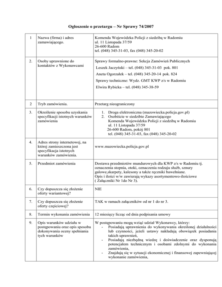 Ogłoszenie o przetargu – Nr Sprawy 74/2007 1 Nazwa (firma) i adres zamawiającego. Komenda Wojewódzka Policji z siedzibą w Radomiu ul. 11 Listopada 37/59 26-600 Radom tel. (048) 345-31-03, fax (048) 345-20-02 2. Osoby uprawnione do kontaktów z Wykonawcami Sprawy formalno-prawne: Sekcja Zamówień Publicznych Leszek Jaczyński – tel. (048) 345-31-03 pok. 801 Aneta Ogorzałek – tel. (048) 345-20-14 pok. 824 Sprawy techniczne: Wydz. GMT KWP z/s w Radomiu Elwira Rybicka – tel. (048) 345-38-59 2 Tryb zamówienia. 3. Określenie sposobu uzyskania specyfikacji istotnych warunków zamówienia 4. Adres strony internetowej, na której zamieszczona jest specyfikacja istotnych warunków zamówienia. Przetarg nieograniczony 1. Droga elektroniczna (mazowiecka.policja.gov.pl) 2. Osobiście w siedzibie Zamawiającego Komenda Wojewódzka Policji z siedzibą w Radomiu ul. 11 Listopada 37/59 26-600 Radom, pokój 801 tel. (048) 345-31-03, fax (048) 345-20-02 www.mazowiecka.policja.gov.pl 5. Przedmiot zamówienia Dostawa przedmiotów mundurowych dla KWP z/s w Radomiu tj. oznaczenia stopnia, otoki, oznaczenia rodzaju słuŜb, sznury galowe,skarpety, kalesony a takŜe ręczniki bawełniane. Opis i ilości w/w zawierają wykazy asortymentowo-ilościowe ( Załączniki Nr 1do Nr 3). 6. Czy dopuszcza się złoŜenie oferty wariantowej? NIE 7. Czy dopuszcza się złoŜenie oferty częściowej? TAK w ramach załączników od nr 1 do nr 3. 8. Termin wykonania zamówienia 12 miesięcy licząc od dnia podpisania umowy 9. Opis warunków udziału w W postępowaniu mogą wziąć udział Wykonawcy, którzy: postępowaniu oraz opis sposobu - Posiadają uprawnienia do wykonywania określonej działalności dokonywania oceny spełniania lub czynności, jeŜeli ustawy nakładają obowiązek posiadania tych warunków takich uprawnień, - Posiadają niezbędną wiedzę i doświadczenie oraz dysponują potencjałem technicznym i osobami zdolnymi do wykonania zamówienia, - Znajdują się w sytuacji ekonomicznej i finansowej zapewniającej wykonanie zamówienia, - Nie podlegają wykluczeniu z postępowania o udzielenie zamówienia Na potwierdzenie udziału w postępowaniu Zamawiający Ŝąda następujących dokumentów: GRUPA I Dokument stwierdzający uprawnienie do występowania w obrocie prawnym w zakresie obejmującym przedmiot zamówienia tj. aktualny odpis z właściwego rejestru albo zaświadczenie o wpisie do ewidencji działalności gospodarczej, jeŜeli odrębne przepisy wymagają wpisu do rejestru lub zgłoszenia do ewidencji działalności gospodarczej a w przypadku spółki cywilnej - kopia umowy spółki lub uchwała określająca osoby i sposób reprezentowania spółki oraz zaświadczenie o wpisie do ewidencji działalności gospodarczej wszystkich wspólników (wystawiony nie wcześniej niŜ 6 miesięcy przed upływem terminu składania ofert) – a w przypadku kserokopii potwierdzony za zgodność z oryginałem przez osoby wymienione w/w dokumentach, upowaŜnione do reprezentowania Wykonawcy. Oświadczenie o nie podleganiu przez Wykonawcę wykluczeniu z postępowania na mocy art. 24 Ustawy - Prawo zamówień publicznych i spełnieniu warunków art. 22 ust. 1 cyt. Ustawy (wzór stanowi Załącznik Nr 4). Wykonawca który będzie składał ofertę na asortyment wyszczególniony w Załączniku Nr 1 zobowiązany jest dołączyć do oferty Deklarację Zgodności z PN na niŜej wymieniony asortyment: -ręcznik frotte, ręcznik bawełniany, skarpety letnie, skarpety zimowe, kalesony letnie; PowyŜsze dokumenty muszą być złoŜone w formie oryginałów lub kserokopii potwierdzonych formułą „za zgodność z oryginałem” przez osobę (osoby) upowaŜnione do reprezentowania Wykonawcy. GRUPA II Parafowany przez upowaŜnionego przedstawiciela Wykonawcy wzór Umowy – Załącznik Nr 5. Wypełnione Wykaz asortymentowo-ilościowe- Załącznik Nr 1 – Nr 3, opatrzone pieczęcią i podpisem osoby lub osób upowaŜnionych do reprezentowania wykonawcy. Dokumenty z GRUPY II muszą być podpisane przez osobę upowaŜnioną do reprezentacji wykonawcy za wyjątkiem umowy, która moŜe być jedynie parafowana. JeŜeli z dokumentów określonych w GRUPIE I nie będzie wynikać fakt spełniania warunków udziału w postępowaniu, zgodnie z wymogami określonymi w art. 24 ustawy – Prawo zamówień publicznych, powodować to będzie wykluczenie Wykonawcy z postępowania oraz odrzucenie jego oferty. Ocena dokonywana będzie na podstawie oferty i znajdujących się w niej dokumentów. 10. Wadium. Zamawiający nie Ŝąda wniesienia wadium 11. Kryteria oceny ofert i ich znaczenie. Cena – 100% Jedyne kryterium oceny ofert stanowi cena. Zamawiający udzieli zamówienia Wykonawcy, który przedłoŜy waŜną ofertę (niepodlegającą odrzuceniu) zawierającą najniŜszą łączną cenę brutto (wartość brutto ogółem) spośród wszystkich waŜnych złoŜonych w postępowaniu ofert. Wykonawca zobowiązany jest obliczyć cenę wypełniając formularz cenowy tj. załącznik -/ki od nr 1-3. Ceny podane w ofercie obowiązywać będą przez cały okres trwania umowy. 12. Miejsce i termin składania ofert Komenda Wojewódzka z siedzibą w Radomiu ul. 11 Listopada 37/59 26 – 600 Radom pokój 801 (8 piętro) 26. 07. 2007 r. o godz. 10. 00 13. Miejsce i termin otwarcia ofert Komenda Wojewódzka z siedzibą w Radomiu ul. 11 Listopada 37/59 26 – 600 Radom 26.07. 2007 r. godz. 10. 30 pokój 203 II piętro 14. Termin związania ofertą 30 dni – bieg terminu związania ofertą rozpoczyna się wraz z upływem terminu składania ofert 15. Informacja o zamiarze zawarcia umowy ramowej. nie dotyczy 16. Informacje o zamiarze ustanowienia dynamicznego systemu zakupów. nie dotyczy 17. Informacja o przewidywanym wyborze najkorzystniejszej oferty z zastosowanie m aukcji elektronicznej. nie dotyczy Ogłoszenie przekazano do publikacji na portalu UZP w dniu 06.07.2007 r.