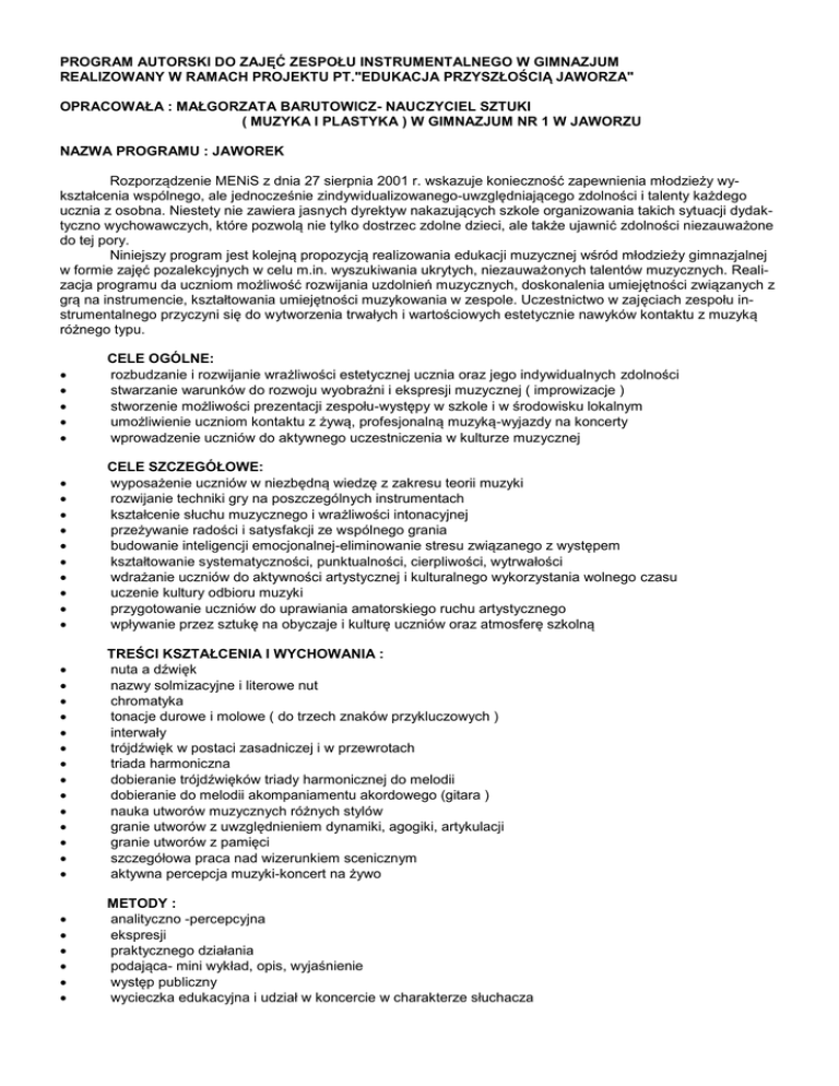 PROGRAM AUTORSKI DO ZAJĘĆ ZESPOŁU INSTRUMENTALNEGO W GIMNAZJUM REALIZOWANY W RAMACH PROJEKTU PT."EDUKACJA PRZYSZŁOŚCIĄ JAWORZA" OPRACOWAŁA : MAŁGORZATA BARUTOWICZ- NAUCZYCIEL SZTUKI ( MUZYKA I PLASTYKA ) W GIMNAZJUM NR 1 W JAWORZU NAZWA PROGRAMU : JAWOREK Rozporządzenie MENiS z dnia 27 sierpnia 2001 r. wskazuje konieczność zapewnienia młodzieży wykształcenia wspólnego, ale jednocześnie zindywidualizowanego-uwzględniającego zdolności i talenty każdego ucznia z osobna. Niestety nie zawiera jasnych dyrektyw nakazujących szkole organizowania takich sytuacji dydaktyczno wychowawczych, które pozwolą nie tylko dostrzec zdolne dzieci, ale także ujawnić zdolności niezauważone do tej pory. Niniejszy program jest kolejną propozycją realizowania edukacji muzycznej wśród młodzieży gimnazjalnej w formie zajęć pozalekcyjnych w celu m.in. wyszukiwania ukrytych, niezauważonych talentów muzycznych. Realizacja programu da uczniom możliwość rozwijania uzdolnień muzycznych, doskonalenia umiejętności związanych z grą na instrumencie, kształtowania umiejętności muzykowania w zespole. Uczestnictwo w zajęciach zespołu instrumentalnego przyczyni się do wytworzenia trwałych i wartościowych estetycznie nawyków kontaktu z muzyką różnego typu. CELE OGÓLNE: rozbudzanie i rozwijanie wrażliwości estetycznej ucznia oraz jego indywidualnych zdolności stwarzanie warunków do rozwoju wyobraźni i ekspresji muzycznej ( improwizacje ) stworzenie możliwości prezentacji zespołu-występy w szkole i w środowisku lokalnym umożliwienie uczniom kontaktu z żywą, profesjonalną muzyką-wyjazdy na koncerty wprowadzenie uczniów do aktywnego uczestniczenia w kulturze muzycznej CELE SZCZEGÓŁOWE: wyposażenie uczniów w niezbędną wiedzę z zakresu teorii muzyki rozwijanie techniki gry na poszczególnych instrumentach kształcenie słuchu muzycznego i wrażliwości intonacyjnej przeżywanie radości i satysfakcji ze wspólnego grania budowanie inteligencji emocjonalnej-eliminowanie stresu związanego z występem kształtowanie systematyczności, punktualności, cierpliwości, wytrwałości wdrażanie uczniów do aktywności artystycznej i kulturalnego wykorzystania wolnego czasu uczenie kultury odbioru muzyki przygotowanie uczniów do uprawiania amatorskiego ruchu artystycznego wpływanie przez sztukę na obyczaje i kulturę uczniów oraz atmosferę szkolną TREŚCI KSZTAŁCENIA I WYCHOWANIA : nuta a dźwięk nazwy solmizacyjne i literowe nut chromatyka tonacje durowe i molowe ( do trzech znaków przykluczowych ) interwały trójdźwięk w postaci zasadniczej i w przewrotach triada harmoniczna dobieranie trójdźwięków triady harmonicznej do melodii dobieranie do melodii akompaniamentu akordowego (gitara ) nauka utworów muzycznych różnych stylów granie utworów z uwzględnieniem dynamiki, agogiki, artykulacji granie utworów z pamięci szczegółowa praca nad wizerunkiem scenicznym aktywna percepcja muzyki-koncert na żywo METODY : analityczno -percepcyjna ekspresji praktycznego działania podająca- mini wykład, opis, wyjaśnienie występ publiczny wycieczka edukacyjna i udział w koncercie w charakterze słuchacza FORMY: indywidualna grupowa zespołowa ŚRODKI DYDAKTYCZNE : pianino instrument klawiszowy gitara skrzypce ksylofon, metalofon dzwonki środki pieniężne na zakup biletów i przejazd na koncerty REFLEKSJA NAUCZYCIELA Szkoła, jako jeden z nadrzędnych celów swojego działania, stawia za zadanie wykształcenie człowieka wszechstronnego, któremu należy stworzyć warunki do wielopłaszczyznowego rozwoju jego zainteresowań i uzdolnień. Dowiedziono naukowo, iż gra na instrumencie uczy wytrwałości w dążeniu do celu. Dzieci, które grają mają lepszą pamięć, szybciej wpadają im w ucho języki obce, a przede wszystkim stają się wrażliwe na otoczenie. Ufam, że realizacja programu ma szansę powodzenia i że będzie to inicjatywa wartościowa, potrzebna. Wszak "muzyka łagodzi obyczaje "; muzyka rozluźnia napięcia i zahamowania, sprzyja pozytywnemu nastawieniu do świata. Nie każdy musi zostać solistą wirtuozem, czy też "filharmonikiem wiedeńskim ",ale każdy dzięki rozwijaniu swojego talentu, wytrwałej i cierpliwej pracy może osiągnąć swoiste mistrzostwo w grze na instrumencie, sprawiając satysfakcję samemu sobie, ale także wielką radość tym, którzy go słuchają. Współczesna szkoła dostrzegając zdolnych uczniów, musi wychodzić im naprzeciw, podejmując takie działania, które pozwolą rozwijać i pielęgnować ich talenty. Pamiętajmy, że nie zawsze uczeń zdolny muzycznie ,musi osiągać sukcesy w nauce innych przedmiotów. Dlatego tak ważne jest właściwe rozpoznanie indywidualnych możliwości każdego ucznia, a być może odkrycie drzemiących w nim, a do tej pory nieujawnionych talentów. W tym zakresie nikt tak naprawdę nie zastąpi nauczyciela-to jego pierwsze, bardzo ważne zadanie. Kolejnym będzie tworzenie optymalnych warunków do osiągania sukcesu na miarę prezentowanego przez ucznia poziomu i rodzaju uzdolnień.