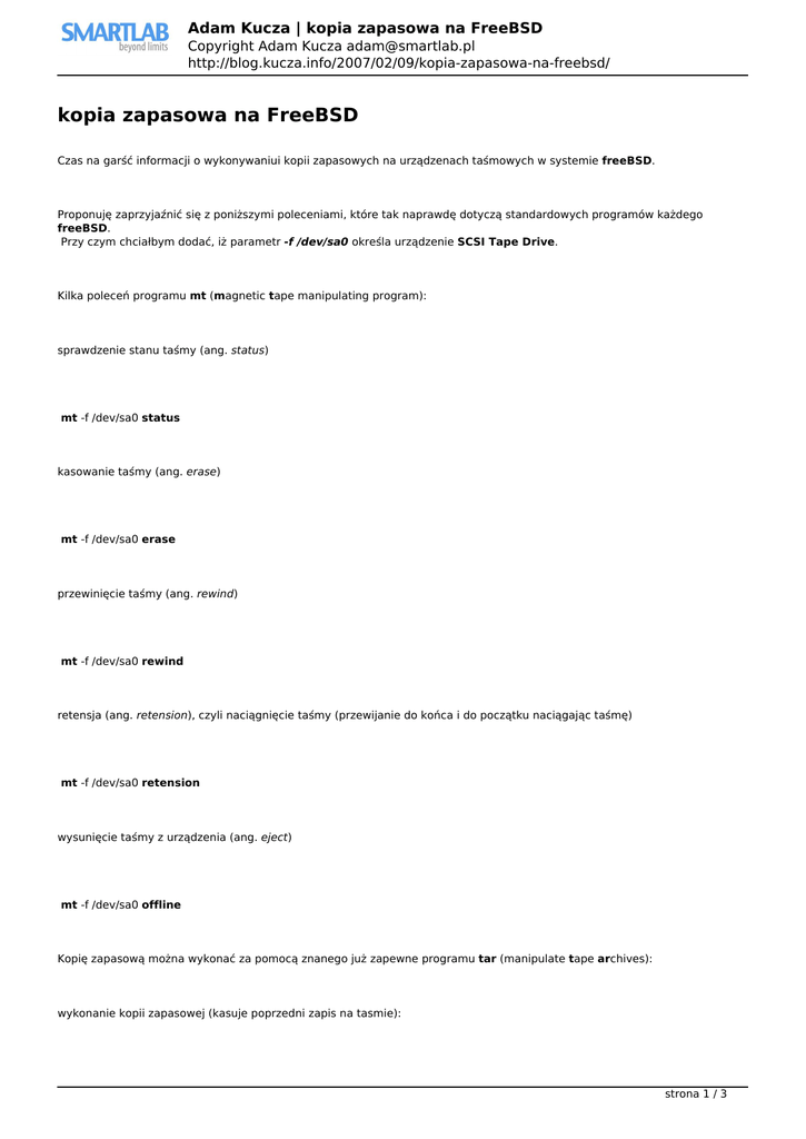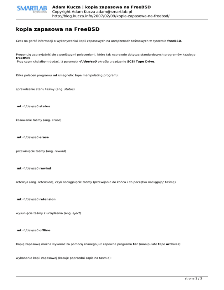 Adam Kucza | kopia zapasowa na FreeBSD Copyright Adam Kucza [email protected] http://blog.kucza.info/2007/02/09/kopia-zapasowa-na-freebsd/ kopia zapasowa na FreeBSD Czas na garść informacji o wykonywaniui kopii zapasowych na urządzenach taśmowych w systemie freeBSD. Proponuję zaprzyjaźnić się z poniższymi poleceniami, które tak naprawdę dotyczą standardowych programów każdego freeBSD. Przy czym chciałbym dodać, iż parametr -f /dev/sa0 określa urządzenie SCSI Tape Drive. Kilka poleceń programu mt (magnetic tape manipulating program): sprawdzenie stanu taśmy (ang. status) mt -f /dev/sa0 status kasowanie taśmy (ang. erase) mt -f /dev/sa0 erase przewinięcie taśmy (ang. rewind) mt -f /dev/sa0 rewind retensja (ang. retension), czyli naciągnięcie taśmy (przewijanie do końca i do początku naciągając taśmę) mt -f /dev/sa0 retension wysunięcie taśmy z urządzenia (ang. eject) mt -f /dev/sa0 offline Kopię zapasową można wykonać za pomocą znanego już zapewne programu tar (manipulate tape archives): wykonanie kopii zapasowej (kasuje poprzedni zapis na tasmie): strona 1 / 3 Adam Kucza | kopia zapasowa na FreeBSD Copyright Adam Kucza [email protected] http://blog.kucza.info/2007/02/09/kopia-zapasowa-na-freebsd/ tar -cv /usr/data/dir tar -cv /usr/data/dir /usr/data/test po parametrze -cv, wypisujemy katalogi bądź pliki, które chcemy zarchiwizować wylistowanie zawartości taśmy tar -tv odzyskanie danych z taśmy: tar -xv tar -xv usr/data/test/filename.ext po parametrze -xv, wypisujemy katalogi bądź pliki, które chcemy odzyskać Dodatkowe informacje Gdy nię będziemy zalogowani w systemie jako root, wykonując jakiekolwiek operacje na urządzeniu taśmowym dostaniemy komunikat: mt: /dev/nsa0: Permission denied Jeśli urządzenie taśmowe będzie puste (bez taśmy wewnątrz), to dostaniemy komunikat: mt: /dev/nsa0: Device not configured W przypadku, gdy urządzenie taśmowe będzie wykonywało jakąkolwiek operację na taśmie, a my będziemy chcieli zrobić z nią cokolwiek, dostaniemy następujący komunikat: mt: /dev/nsa0: Device busy Natomiast jeśli urządzenie będzie wolne od zadań, po wykonaniu polecenia mt status dostaniemy coś takiego: strona 2 / 3 Adam Kucza | kopia zapasowa na FreeBSD Copyright Adam Kucza [email protected] http://blog.kucza.info/2007/02/09/kopia-zapasowa-na-freebsd/ Mode Density Blocksize Current: 0x25:DDS-3 variable ---------available modes--------0: 0x25:DDS-3 variable 1: 0x25:DDS-3 variable 2: 0x25:DDS-3 variable 3: 0x25:DDS-3 variable --------------------------------Current Driver State: at rest. --------------------------------File Number: 0 Record Number: 0 bpi Compression 97000 DCLZ 97000 97000 97000 97000 DCLZ DCLZ DCLZ DCLZ Residual Count 0 Jeśli użyjemy polecenia tar -tv a taśma nie będzie sformatowana, uzyskamy komunikat: tar: Unrecognized archive format: Inappropriate file type or format Jeśli skorzystamy z polecenia tar -tv, a taśma będzie czysta zobaczymy coś takiego: tar: Error opening archive: Error reading "/dev/sa0": Input/output error Myślę, że powyższy FAQ przybliży nieco archiwizowanie danych na tasiemkach. strona 3 / 3