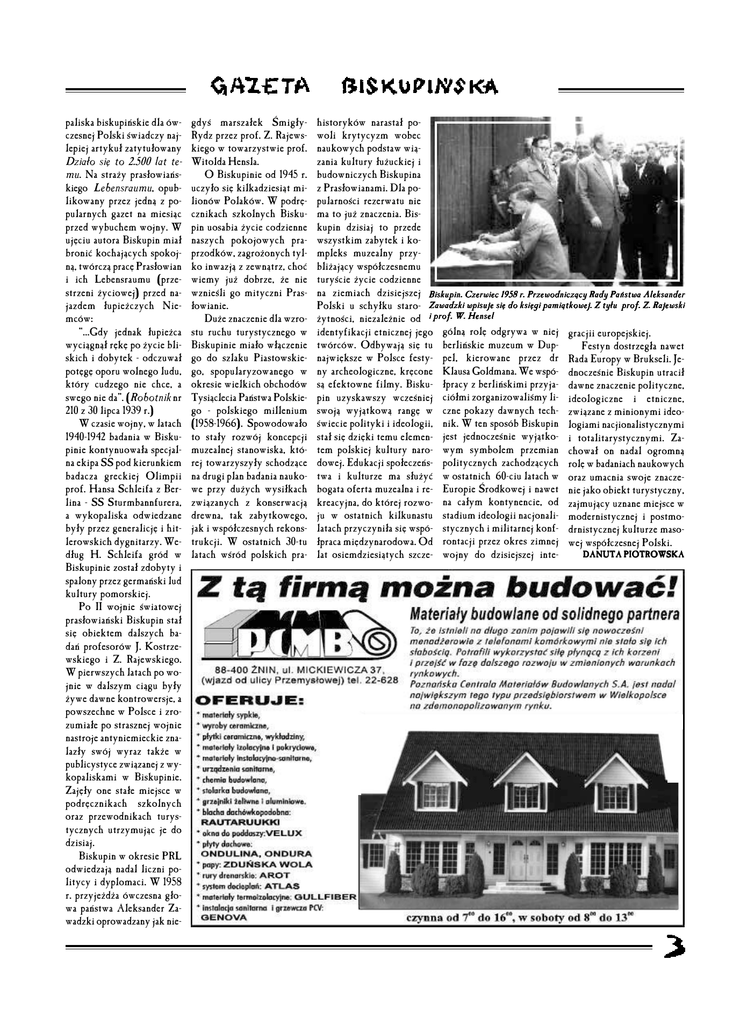 paliska biskupińskie dla ów− czesnej Polski świadczy naj− lepiej artykuł zatytułowany Działo się to 2.500 lat te− mu. Na straży prasłowiańs− kiego Lebensraumu, opub− likowany przez jedną z po− pularnych gazet na miesiąc przed wybuchem wojny. W ujęciu autora Biskupin miał bronić kochających spokoj− ną, twórczą pracę Prasłowian i ich Lebensraumu (prze− strzeni życiowej) przed na− jazdem łupieżczych Nie− mców: “...Gdy jednak łupieżca wyciągnął rękę po życie bli− skich i dobytek − odczuwał potęgę oporu wolnego ludu, który cudzego nie chce, a swego nie da”. (Robotnik nr 210 z 30 lipca 1939 r.) W czasie wojny, w latach 1940−1942 badania w Bisku− pinie kontynuowała specjal− na ekipa SS pod kierunkiem badacza greckiej Olimpii prof. Hansa Schleifa z Ber− lina − SS Sturmbannfurera, a wykopaliska odwiedzane były przez generalicję i hit− lerowskich dygnitarzy. We− dług H. Schleifa gród w Biskupinie został zdobyty i spalony przez germański lud kultury pomorskiej. Po II wojnie światowej prasłowiański Biskupin stał się obiektem dalszych ba− dań profesorów J. Kostrze− wskiego i Z. Rajewskiego. W pierwszych latach po wo− jnie w dalszym ciągu były żywe dawne kontrowersje, a powszechne w Polsce i zro− zumiałe po strasznej wojnie nastroje antyniemieckie zna− lazły swój wyraz także w publicystyce związanej z wy− kopaliskami w Biskupinie. Zajęły one stałe miejsce w podręcznikach szkolnych oraz przewodnikach turys− tycznych utrzymując je do dzisiaj. Biskupin w okresie PRL odwiedzają nadal liczni po− litycy i dyplomaci. W 1958 r. przyjeżdża ówczesna gło− wa państwa Aleksander Za− wadzki oprowadzany jak nie− gdyś marszałek Śmigły− Rydz przez prof. Z. Rajews− kiego w towarzystwie prof. Witolda Hensla. O Biskupinie od 1945 r. uczyło się kilkadziesiąt mi− lionów Polaków. W podrę− cznikach szkolnych Bisku− pin uosabia życie codzienne naszych pokojowych pra− przodków, zagrożonych tyl− ko inwazją z zewnątrz, choć wiemy już dobrze, że nie wznieśli go mityczni Pras− łowianie. Duże znaczenie dla wzro− stu ruchu turystycznego w Biskupinie miało włączenie go do szlaku Piastowskie− go, spopularyzowanego w okresie wielkich obchodów Tysiąclecia Państwa Polskie− go − polskiego millenium (1958−1966). Spowodowało to stały rozwój koncepcji muzealnej stanowiska, któ− rej towarzyszyły schodzące na drugi plan badania nauko− we przy dużych wysiłkach związanych z konserwacją drewna, tak zabytkowego, jak i współczesnych rekons− trukcji. W ostatnich 30−tu latach wśród polskich pra− historyków narastał po− woli krytycyzm wobec naukowych podstaw wią− zania kultury łużuckiej i budowniczych Biskupina z Prasłowianami. Dla po− pularności rezerwatu nie ma to już znaczenia. Bis− kupin dzisiaj to przede wszystkim zabytek i ko− mpleks muzealny przy− bliżający współczesnemu turyście życie codzienne na ziemiach dzisiejszej Biskupin. Czerwiec 1958 r. Przewodniczący Rady Państwa Aleksander Polski u schyłku staro− Zawadzki wpisuje się do księgi pamiątkowej. Z tyłu prof. Z. Rajewski żytności, niezależnie od i prof. W. Hensel identyfikacji etnicznej jego gólną rolę odgrywa w niej gracjii europejskiej. twórców. Odbywają się tu berlińskie muzeum w Dup− Festyn dostrzegła nawet największe w Polsce festy− pel, kierowane przez dr Rada Europy w Brukseli. Je− ny archeologiczne, kręcone Klausa Goldmana. We wspó− dnocześnie Biskupin utracił są efektowne filmy. Bisku− łpracy z berlińskimi przyja− dawne znaczenie polityczne, pin uzyskawszy wcześniej ciółmi zorganizowaliśmy li− ideologiczne i etniczne, swoją wyjątkową rangę w czne pokazy dawnych tech− związane z minionymi ideo− świecie polityki i ideologii, nik. W ten sposób Biskupin logiami nacjionalistycznymi stał się dzięki temu elemen− jest jednocześnie wyjątko− i totalitarystycznymi. Za− tem polskiej kultury naro− wym symbolem przemian chował on nadal ogromną dowej. Edukacji społeczeńs− politycznych zachodzących rolę w badaniach naukowych twa i kulturze ma służyć w ostatnich 60−ciu latach w oraz umacnia swoje znacze− bogata oferta muzealna i re− Europie Środkowej i nawet nie jako obiekt turystyczny, kreacyjna, do której rozwo− na całym kontynencie, od zajmujący uznane miejsce w ju w ostatnich kilkunastu stadium ideologii nacjonali− modernistycznej i postmo− latach przyczyniła się wspó− stycznych i militarnej konf− drnistycznej kulturze maso− łpraca międzynarodowa. Od rontacji przez okres zimnej wej współczesnej Polski. DANUTA PIOTROWSKA lat osiemdziesiątych szcze− wojny do dzisiejszej inte−