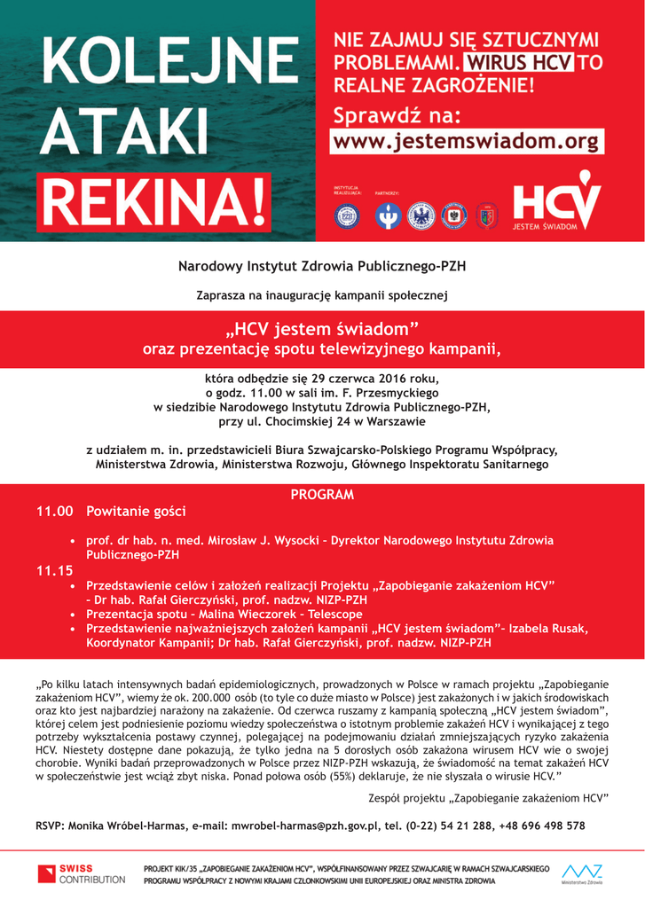 Narodowy Instytut Zdrowia Publicznego-PZH Zaprasza na inaugurację kampanii społecznej „HCV jestem świadom” oraz prezentację spotu telewizyjnego kampanii, która odbędzie się 29 czerwca 2016 roku, o godz. 11.00 w sali im. F. Przesmyckiego w siedzibie Narodowego Instytutu Zdrowia Publicznego-PZH, przy ul. Chocimskiej 24 w Warszawie z udziałem m. in. przedstawicieli Biura Szwajcarsko-Polskiego Programu Współpracy, Ministerstwa Zdrowia, Ministerstwa Rozwoju, Głównego Inspektoratu Sanitarnego 11.00 Powitanie gości PROGRAM •prof. dr hab. n. med. Mirosław J. Wysocki – Dyrektor Narodowego Instytutu Zdrowia Publicznego-PZH 11.15 •Przedstawienie celów i założeń realizacji Projektu „Zapobieganie zakażeniom HCV” – Dr hab. Rafał Gierczyński, prof. nadzw. NIZP-PZH •Prezentacja spotu – Malina Wieczorek – Telescope •Przedstawienie najważniejszych założeń kampanii „HCV jestem świadom”– Izabela Rusak, Koordynator Kampanii; Dr hab. Rafał Gierczyński, prof. nadzw. NIZP-PZH „Po kilku latach intensywnych badań epidemiologicznych, prowadzonych w Polsce w ramach projektu „Zapobieganie zakażeniom HCV”, wiemy że ok. 200.000 osób (to tyle co duże miasto w Polsce) jest zakażonych i w jakich środowiskach oraz kto jest najbardziej narażony na zakażenie. Od czerwca ruszamy z kampanią społeczną „HCV jestem świadom”, której celem jest podniesienie poziomu wiedzy społeczeństwa o istotnym problemie zakażeń HCV i wynikającej z tego potrzeby wykształcenia postawy czynnej, polegającej na podejmowaniu działań zmniejszających ryzyko zakażenia HCV. Niestety dostępne dane pokazują, że tylko jedna na 5 dorosłych osób zakażona wirusem HCV wie o swojej chorobie. Wyniki badań przeprowadzonych w Polsce przez NIZP-PZH wskazują, że świadomość na temat zakażeń HCV w społeczeństwie jest wciąż zbyt niska. Ponad połowa osób (55%) deklaruje, że nie słyszała o wirusie HCV.” Zespół projektu „Zapobieganie zakażeniom HCV” RSVP: Monika Wróbel-Harmas, e-mail: [email protected], tel. (0-22) 54 21 288, +48 696 498 578