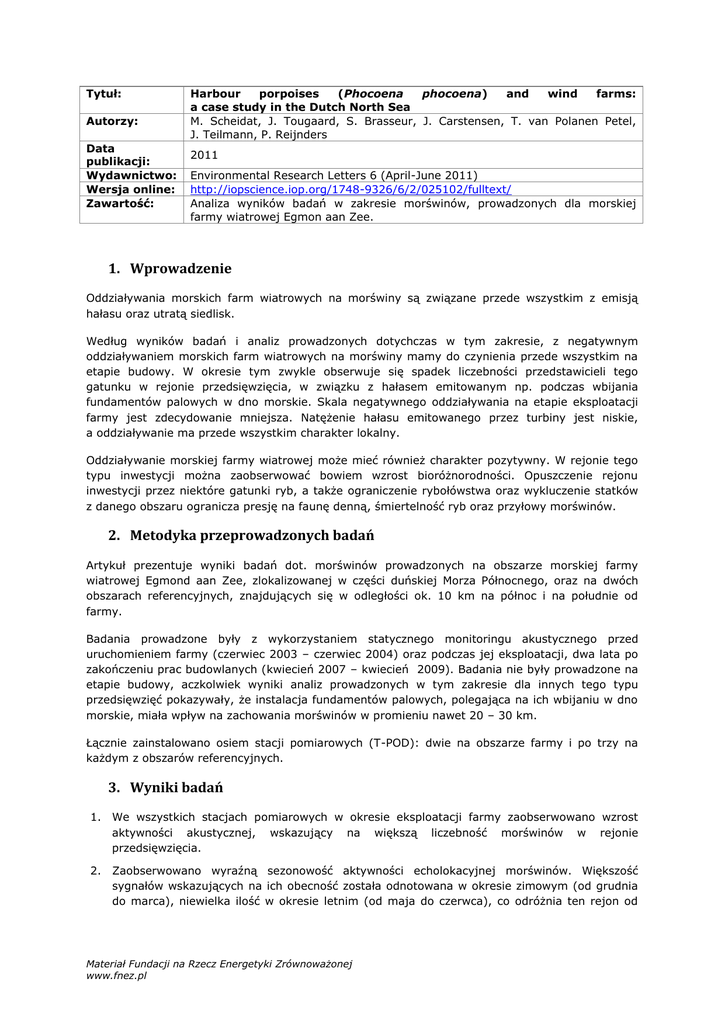 Tytuł: Autorzy: Data publikacji: Wydawnictwo: Wersja online: Zawartość: Harbour porpoises (Phocoena phocoena) and wind farms: a case study in the Dutch North Sea M. Scheidat, J. Tougaard, S. Brasseur, J. Carstensen, T. van Polanen Petel, J. Teilmann, P. Reijnders 2011 Environmental Research Letters 6 (April-June 2011) http://iopscience.iop.org/1748-9326/6/2/025102/fulltext/ Analiza wyników badań w zakresie morświnów, prowadzonych dla morskiej farmy wiatrowej Egmon aan Zee. 1. Wprowadzenie Oddziaływania morskich farm wiatrowych na morświny są związane przede wszystkim z emisją hałasu oraz utratą siedlisk. Według wyników badań i analiz prowadzonych dotychczas w tym zakresie, z negatywnym oddziaływaniem morskich farm wiatrowych na morświny mamy do czynienia przede wszystkim na etapie budowy. W okresie tym zwykle obserwuje się spadek liczebności przedstawicieli tego gatunku w rejonie przedsięwzięcia, w związku z hałasem emitowanym np. podczas wbijania fundamentów palowych w dno morskie. Skala negatywnego oddziaływania na etapie eksploatacji farmy jest zdecydowanie mniejsza. Natężenie hałasu emitowanego przez turbiny jest niskie, a oddziaływanie ma przede wszystkim charakter lokalny. Oddziaływanie morskiej farmy wiatrowej może mieć również charakter pozytywny. W rejonie tego typu inwestycji można zaobserwować bowiem wzrost bioróżnorodności. Opuszczenie rejonu inwestycji przez niektóre gatunki ryb, a także ograniczenie rybołówstwa oraz wykluczenie statków z danego obszaru ogranicza presję na faunę denną, śmiertelność ryb oraz przyłowy morświnów. 2. Metodyka przeprowadzonych badań Artykuł prezentuje wyniki badań dot. morświnów prowadzonych na obszarze morskiej farmy wiatrowej Egmond aan Zee, zlokalizowanej w części duńskiej Morza Północnego, oraz na dwóch obszarach referencyjnych, znajdujących się w odległości ok. 10 km na północ i na południe od farmy. Badania prowadzone były z wykorzystaniem statycznego monitoringu akustycznego przed uruchomieniem farmy (czerwiec 2003 – czerwiec 2004) oraz podczas jej eksploatacji, dwa lata po zakończeniu prac budowlanych (kwiecień 2007 – kwiecień 2009). Badania nie były prowadzone na etapie budowy, aczkolwiek wyniki analiz prowadzonych w tym zakresie dla innych tego typu przedsięwzięć pokazywały, że instalacja fundamentów palowych, polegająca na ich wbijaniu w dno morskie, miała wpływ na zachowania morświnów w promieniu nawet 20 – 30 km. Łącznie zainstalowano osiem stacji pomiarowych (T-POD): dwie na obszarze farmy i po trzy na każdym z obszarów referencyjnych. 3. Wyniki badań 1. We wszystkich stacjach pomiarowych w okresie eksploatacji farmy zaobserwowano wzrost aktywności akustycznej, wskazujący na większą liczebność morświnów w rejonie przedsięwzięcia. 2. Zaobserwowano wyraźną sezonowość aktywności echolokacyjnej morświnów. Większość sygnałów wskazujących na ich obecność została odnotowana w okresie zimowym (od grudnia do marca), niewielka ilość w okresie letnim (od maja do czerwca), co odróżnia ten rejon od Materiał Fundacji na Rzecz Energetyki Zrównoważonej www.fnez.pl obszarów Morza Północnego położonych bardziej na północ, dla których największą aktywność odnotowuje się w miesiącach letnich. 3. Zaobserwowano wyraźny wzrost aktywności akustycznej morświnów na obszarze farmy podczas jej eksploatacji, co tłumaczy się przede wszystkim na dwa sposoby, jako: efekt rafy (wzrost bioróżnorodności na obszarze farmy), efekt schronienia (na obszarze farmy wiatrowej podczas jej eksploatacji zmniejsza się skala zakłóceń, co wynika z ograniczenia działalności rybackiej oraz całkowitego wyeliminowania ruchu statków nie tylko z obszaru farmy, ale również ze strefy buforowej o szerokości 500 m wokół przedsięwzięcia). 4. Wnioski Wyniki badań przeprowadzonych na obszarze farmy wiatrowej Egmond aan Zee odbiegają od wyników badań prowadzonych dla innych tego typu przedsięwzięć. Na przykład w przypadku morskiej farmy wiatrowej Nysted aktywność morświnów w rejonie farmy była wyraźnie ograniczona nawet dwa lata po jej uruchomieniu. Biorąc pod uwagę powyższe należy pamiętać, że badania środowiskowe prowadzone dla morskich farm wiatrowych mają charakter indywidualny a ich wyniki mają odniesienie tylko i wyłącznie do danej inwestycji. Na oddziaływanie morskiej farmy wiatrowej składają się zarówno czynniki pozytywne jak i negatywne a zależności między nimi są ściśle uzależnione od uwarunkowań danego obszaru i charakterystyki projektu. Wzrost liczebności morświnów w rejonie farmy wiatrowej Egmond aan Zee może być również związany z pracami prowadzonymi w ramach budowy morskiej farmy wiatrowej Princess Amalia, oddalonej o ok. 10 km. Opracowała: Justyna Biegaj Materiał Fundacji na Rzecz Energetyki Zrównoważonej www.fnez.pl