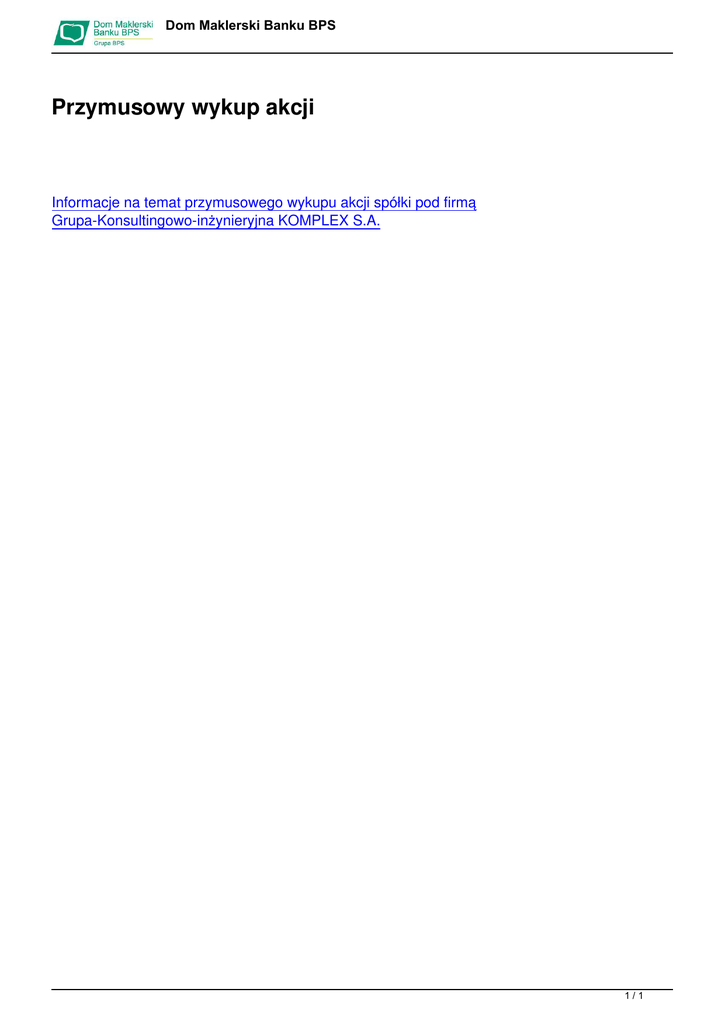 Dom Maklerski Banku BPS Przymusowy wykup akcji Informacje na temat przymusowego wykupu akcji spółki pod firmą Grupa-Konsultingowo-inżynieryjna KOMPLEX S.A. 1/1
