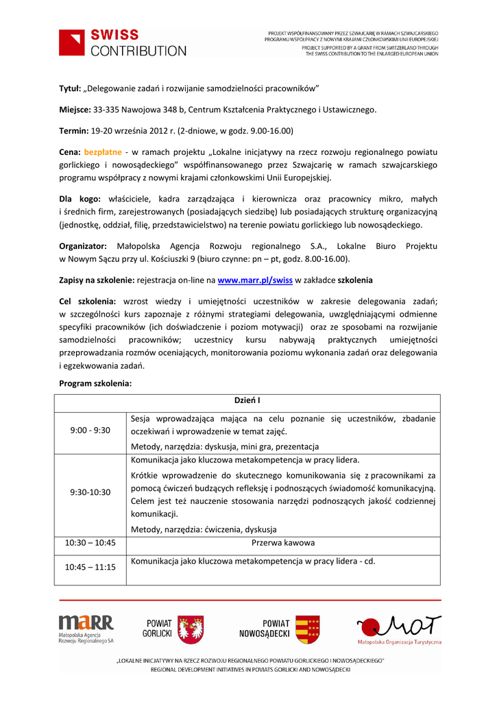 Tytuł: „Delegowanie zadań i rozwijanie samodzielności pracowników” Miejsce: 33-335 Nawojowa 348 b, Centrum Kształcenia Praktycznego i Ustawicznego. Termin: 19-20 września 2012 r. (2-dniowe, w godz. 9.00-16.00) Cena: bezpłatne - w ramach projektu „Lokalne inicjatywy na rzecz rozwoju regionalnego powiatu gorlickiego i nowosądeckiego” współfinansowanego przez Szwajcarię w ramach szwajcarskiego programu współpracy z nowymi krajami członkowskimi Unii Europejskiej. Dla kogo: właściciele, kadra zarządzająca i kierownicza oraz pracownicy mikro, małych i średnich firm, zarejestrowanych (posiadających siedzibę) lub posiadających strukturę organizacyjną (jednostkę, oddział, filię, przedstawicielstwo) na terenie powiatu gorlickiego lub nowosądeckiego. Organizator: Małopolska Agencja Rozwoju regionalnego S.A., Lokalne w Nowym Sączu przy ul. Kościuszki 9 (biuro czynne: pn – pt, godz. 8.00-16.00). Biuro Projektu Zapisy na szkolenie: rejestracja on-line na www.marr.pl/swiss w zakładce szkolenia Cel szkolenia: wzrost wiedzy i umiejętności uczestników w zakresie delegowania zadań; w szczególności kurs zapoznaje z różnymi strategiami delegowania, uwzględniającymi odmienne specyfiki pracowników (ich doświadczenie i poziom motywacji) oraz ze sposobami na rozwijanie samodzielności pracowników; uczestnicy kursu nabywają praktycznych umiejętności przeprowadzania rozmów oceniających, monitorowania poziomu wykonania zadań oraz delegowania i egzekwowania zadań. Program szkolenia: Dzień I 9:00 - 9:30 Sesja wprowadzająca mająca na celu poznanie się uczestników, zbadanie oczekiwań i wprowadzenie w temat zajęć. Metody, narzędzia: dyskusja, mini gra, prezentacja Komunikacja jako kluczowa metakompetencja w pracy lidera. 9:30-10:30 10:30 – 10:45 10:45 – 11:15 Krótkie wprowadzenie do skutecznego komunikowania się z pracownikami za pomocą ćwiczeń budzących refleksję i podnoszących świadomość komunikacyjną. Celem jest też nauczenie stosowania narzędzi podnoszących jakość codziennej komunikacji. Metody, narzędzia: ćwiczenia, dyskusja Przerwa kawowa Komunikacja jako kluczowa metakompetencja w pracy lidera - cd. Narzędzia do skutecznego delegowania zadań. 11:15- 12:15 12:15 – 12:45 W tej części Uczestnicy poznają sposoby prowadzenia rozmowy, a następnie przećwiczą nowopoznane umiejętności na rzeczywistych sytuacjach. Metody, narzędzia: dyskusja moderowana, symulacje, ćwiczenia Lunch Sztuka efektywnego delegowania zadań. 12:45 – 14:15 14:15 – 14:30 Uczestnicy poznają zasady efektywnego delegowania i od razu uczą się je stosować w odgrywanych scenkach typu role-play. Rezultaty są wspólnie omawiane. Na podstawie bieżących doświadczeń uczą się jak unikać najczęstszych błędów w tym obszarze i podnosić swoje kompetencje. Metody, narzędzia: symulacje rozmowy, mini wykład, dyskusja Przerwa kawowa Coaching narzędziowy. 14:30 – 16:00 Przedstawienie narzędzia do efektywnego delegowania i bieżącego oceniania pracowników. Uczestnicy pracują ze specjalnie przygotowanymi kartami do coachingu, które są ich przewodnikiem podczas symulacji rozmów z pracownikami. Jest to też narzędzie do stymulacji ciągłego podnoszenia kwalifikacji pracowników. Uczestnicy posługują się gotowym i sprawdzonym w różnych firmach narzędziem, które będą mogli wykorzystywać w swojej pracy. Metody, narzędzia: symulacje, dyskusja, karty pracy Dzień II Coaching narzędziowy – ćwiczenia przy użyciu kamery 9:00 -10:30 Ćwiczenia z prowadzenia rozmów oceniających przy użyciu kamery. Uczestnicy pracują w parach, ćwicząc prowadzenie rozmowy oceniającej zgodnie z wcześniej poznaną procedurą. Po nagraniu scenki są omawiane i oceniane. 10:30 – 10:45 Metody, narzędzia: praca z kamerą, dyskusja moderowana, praca w grupach Przerwa kawowa 10:45 – 12:15 Coaching narzędziowy – ćwiczenia przy użyciu kamery – cd. 12:15 – 12:45 Lunch Motywowanie jako niezbędny element delegowania 12:45 – 14:15 Nauka skutecznego motywowania pracownika, czyli rzecz o chwaleniu, które dodaje energii i karaniu, które otwiera dialog. Zapoznanie z „dylematem lizusa”, „belfrem” i innymi pułapkami pozytywnej i negatywnej informacji zwrotnej. 14:15 – 14:30 Metody, narzędzia: ćwiczenia, dyskusja Przerwa kawowa Budzenie odpowiedzialności pracowników. Zamknięcie warsztatu. 14:30 – 16:00 Przekazanie wiedzy na temat partycypacji pracowników. Pokazanie mechanizmów brania odpowiedzialności pracowników za wykonywane zadania i kondycję firmy. Podsumowanie i weryfikacja oczekiwań. Metody, narzędzia: ćwiczenia, dyskusja W ramach szkolenia MARR S.A. zapewnia materiały szkoleniowe, zaświadczenia o ukończeniu szkolenia, zaświadczenia o uzyskanej pomocy de minimis oraz catering. TRENER: Izabela Krzyszycha Trener z wieloletnim stażem w prowadzeniu szkoleń, doradztwa i mentoringu. Szkolenia prowadzi głównie w oparciu o metodę warsztatową – poznawana przez uczestników wiedza natychmiast transferowana jest na doświadczenia z życia. Zajęcia w głównej mierze składają się z ćwiczeń i symulacji, uzupełnieniem których jest wykład. Szkolenie z zakresu delegowania zadań i rozwijania samodzielności pracowników prowadziła m.in. dla tak uznanych marek jak ArcelorMittal Poland S.A. Oddział w Krakowie (d. Huta im. T. Sendzimira), Grupa Saint-Gobain w Polsce. Regularnie uzyskuje najwyższe oceny zarówno odnośnie merytoryki przekazywanej na szkoleniach, jak i atmosfery którą potrafi stworzyć w trakcie swoich zajęć. Posiada wieloletnie doświadczenie w pracy na stanowisku menadżerskim, a obecnie współprowadzi firmę szkoleniową. Liczba miejsc ograniczona, decyduje kolejność zgłoszeń! Pytania? Tel. 18 262 12 76 Zapisz się już dziś www.marr.pl/swiss
