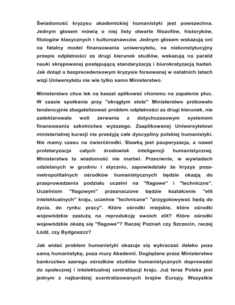 Świadomość kryzysu akademickiej humanistyki jest powszechna. Jednym głosem mówią o niej listy otwarte filozofów, historyków, filologów klasycznych i kulturoznawców. Jednym głosem wskazują oni na fatalny model finansowania uniwersytetu, na niekonstytucyjny przepis odpłatności za drugi kierunek studiów, wskazują na paraliŜ nauki skrępowanej postępującą standaryzacją i biurokratyzacją badań. Jak dotąd o bezprecedensowym kryzysie forsowanej w ostatnich latach wizji Uniwersytetu nie wie tylko samo Ministerstwo. Ministerstwo chce lek na kaszel aplikować choremu na zapalenie płuc. W czasie spotkania przy "okrągłym stole" Ministerstwo próbowało tendencyjnie zbagatelizować problem odpłatności za drugi kierunek, nie zadeklarowało woli zerwania z dotychczasowym systemem finansowania szkolnictwa wyŜszego. Zaaplikowanej Uniwersytetowi ministerialnej kuracji nie przeŜyją całe dyscypliny polskiej humanistyki. Nie mamy czasu na ćwierćśrodki. Stawką jest pauperyzacja, a nawet proletaryzacja całych środowisk inteligencji humanistycznej. Ministerstwa ta wiadomość nie martwi. Przeciwnie, w wywiadach udzielanych w grudniu i styczniu, zapowiedziało Ŝe kryzys pozametropolitalnych ośrodków przeprowadzenia podziału Uczelniom "flagowym" humanistycznych uczelni na przeznaczone będzie "flagowe" będzie i okazją do "techniczne". kształcenie "elit intelektualnych" kraju, uczelnie "techniczne" "przygotowywać będą do Ŝycia, do rynku pracy". Które ośrodki miejskie, które ośrodki wojewódzkie zasłuŜą na reprodukcję swoich elit? Które ośrodki wojewódzkie okaŜą się "flagowe"? Raczej Poznań czy Szczecin, raczej Łódź, czy Bydgoszcz? Jak widać problem humanistyki okazuje się wykraczać daleko poza samą humanistykę, poza mury Akademii. Doglądane przez Ministerstwo bankructwo szeregu ośrodków studiów humanistycznych doprowadzi do społecznej i intelektualnej centralizacji kraju. JuŜ teraz Polska jest jednym z najbardziej scentralizowanych krajów Europy. Wszystkie urzędy (poza NCNem), większość mediów (poza Tygodnikiem Powszechnym) mieści się w Warszawie. Pytanie, czy chcemy drenaŜu intelektualnego metropolii większości jest miast pytaniem wojewódzkich strategicznym, na pytaniem rzecz paru politycznym, pytaniem cywilizacyjnym. My, Komitet Kryzysowy Humanistyki Polskiej odpowiadamy, Ŝe takiego modelu rozwoju nie chcemy. Ministerstwo Nauki i Szkolnictwa WyŜszego nie potrafi i nie chce słuchać świata nauki. Przyjmuje perspektywę wobec Uniwersytetu zewnętrzną. Pani Minister mówi i myśli o Akademii jak o przedsiębiorstwie, działającym w krótkoterminowej perspektywie. Mówi i myśli o nim jak o ośrodku staŜowym, który ma dawać fach, produkować pracowników dla naszego peryferyjnego, nieinnowacyjnego rynku pracy. Widać, Ŝe dla Ministerstwa Uniwersytet jest tylko kłopotem. Zarządzający szkolnictwem wyŜszym nie potrafią odpowiedzieć sobie na pytanie: po co w ogóle Polsce potrzebny jest Uniwersytet? Perspektywa społecznego, zapewniającego Uniwersytetu formację jako intelektualną, laboratorium oferującego wykształcenie w miejsce wąskiego fachu jest Ministerstwu obca. Dlatego trzeba mu dopomóc. Wpływ na kształt uczelni powinni mieć nie tylko urzędnicy i biurokraci lecz przede wszystkim uczeni i obywatele. Trzeba, aby sam świat nauki, aby sam Uniwersytet przejął odpowiedzialność programową za swój kształt i przyszłość. W obliczu bezprecedensowego kryzysu Uniwersytet musi powiedzieć "nic o nas bez nas". Czas na Stany Generalne nauki polskiej – oddolne społeczne konsultacje otwarte dla wszystkich zainteresowanych. Dlatego zwrócimy się do największych, niekwestionowanych autorytetów polskiej nauki, aby pomogli nam przygotować Ankietę Generalną nauki polskiej. Zapowiedzieli pomoc przy projekcie m.in Henryk Samsonowicz, Andrzej Walicki, Ewa Wipszycka, Jan Woleński. Przy inicjatywie współpracować będą z nami przedstawiciele środowisk intelektualnych polskiej lewicy - Krytyka Polityczna, prawicy – Pressje i liberalnego centrum - Res Publika Nowa. Od początku współpracują z nami redaktorzy najambitniejszych intelektualnie pism młodego pokolenia. Z opublikowaną w internecie Ankietą będziemy chcieli dotrzeć do kaŜdego polskiego naukowca, do kaŜdego polskiego instytutu naukowego. obywatelskiego Uzyskane projektu wyniki ustawy o staną się szkolnictwie podstawą wyŜszym, uniwersyteckiego głosu o Uniwersytecie. MoŜna było Ŝywić duŜe nadzieje związane z ostatnimi reformami. Nie jesteśmy zakochani w Uniwersytecie sprzed 2011 roku. Był on miejscem w którym koneksje towarzyskie, para-feudalne zaleŜności odgrywały często waŜniejszą rolę niŜ merytoryczne zalety pracowników. Takim miejscem pozostał do dzisiaj. Reformy minister Kudryckiej nie naruszyły tej struktury, nie odblokowały moŜliwości młodym naukowcom, nie zmieniły procedur konkursowych, nie przyczyniły się do demokratyzacji Ŝycia akademickiego. Tym wyraźniej więc widać, Ŝe reforma Uniwersytetu musi wyjść z samego Uniwersytetu. Pytania o jej moŜliwy kształt zawrzemy w naszej ankiecie. Wprowadzenie pewnych rozwiązań prawnych, o których mówią postulaty Komitetu niezbędne jest juŜ teraz. Podczas "okrągłego stołu" przedstawiliśmy Pani Minister Kolarskiej-Bobińskiej zestaw postulatów, ale Ŝadnej konkretnej odpowiedzi nie uzyskaliśmy, co charakterystyczne i rozczarowujące. Aby nastawienia, planujemy nakłonić Ministerstwo organizację do równieŜ zmiany innych swojego form uniwersyteckiego oporu. Wszystkich zainteresowanych zapraszamy do zapoznania się z naszymi postulatami. Komitet Kryzysowy Humanistyki Polskiej