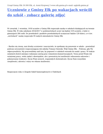 Urząd Gminy Ełk 19-300 Ełk, ul. Armii Krajowej 3 www.elk.gmina.pl e-mail: [email protected] Uczniowie z Gminy Ełk po wakacjach wrócili do szkół - zobacz galerię zdjęć W czwartek, 1 września, 1018 uczniów z Gminy Ełk rozpoczęło naukę w szkołach działających na terenie Gminy Ełk. W roku szkolnym 2016/2017 w podstawówkach uczyć się będzie 519 uczniów, z kolei w gimnazjach 284 osób. Do przedszkoli i punktów przedszkolnych uczęszczać będzie 120 dzieci, a w tzw. „zerówkach” naukę rozpoczęło 95 małych mieszkańców Gminy Ełk. – Bardzo się cieszę, nasi drodzy uczniowie i nauczyciele, że spotkamy się ponownie w szkole – powiedział podczas uroczystości rozpoczynającej rok szkolny Tomasz Osewski, Wójt Gminy Ełk. – Podczas, gdy Wy odpoczywaliście, My pracowaliśmy nad tym, by poprawić w szkołach warunki do nauki i pracy. W trakcie ostatnich dwóch miesięcy wykonano szereg prac remontowo-konserwacyjnych. Teraz przed Wami rok wytężonej pracy, wielu zadań i obowiązków, ale z pewnością też możliwości odnoszenia sukcesów i pokonywania trudności. Życzę Wam nowych, wspaniałych doświadczeń. Życzę Nam wszystkim cierpliwości, zdrowia i wiary we własne możliwości. Rozpoczęcie roku w Zespole Szkół Samorządowych w Chełchach Urząd Gminy Ełk 19-300 Ełk, ul. Armii Krajowej 3 www.elk.gmina.pl e-mail: [email protected] Urząd Gminy Ełk 19-300 Ełk, ul. Armii Krajowej 3 www.elk.gmina.pl e-mail: [email protected] Urząd Gminy Ełk 19-300 Ełk, ul. Armii Krajowej 3 www.elk.gmina.pl e-mail: [email protected] Rozpoczęcie roku szkolnego w Szkole Podstawowej w Rękusach Urząd Gminy Ełk 19-300 Ełk, ul. Armii Krajowej 3 www.elk.gmina.pl e-mail: [email protected] Urząd Gminy Ełk 19-300 Ełk, ul. Armii Krajowej 3 www.elk.gmina.pl e-mail: [email protected] Urząd Gminy Ełk 19-300 Ełk, ul. Armii Krajowej 3 www.elk.gmina.pl e-mail: [email protected] Rozpoczęcie roku w Szkole Podstawowej im. Szarych Szeregów w Mrozach Wielkich Urząd Gminy Ełk 19-300 Ełk, ul. Armii Krajowej 3 www.elk.gmina.pl e-mail: [email protected] Urząd Gminy Ełk 19-300 Ełk, ul. Armii Krajowej 3 www.elk.gmina.pl e-mail: [email protected] Urząd Gminy Ełk 19-300 Ełk, ul. Armii Krajowej 3 www.elk.gmina.pl e-mail: [email protected] Inauguracja roku szkolnego w Zespole Szkolno-Przedszkolnym w Nowej Wsi Ełckiej Urząd Gminy Ełk 19-300 Ełk, ul. Armii Krajowej 3 www.elk.gmina.pl e-mail: [email protected] Urząd Gminy Ełk 19-300 Ełk, ul. Armii Krajowej 3 www.elk.gmina.pl e-mail: [email protected] Inauguracja w Zespole Szkół Samorządowych w Stradunach Urząd Gminy Ełk 19-300 Ełk, ul. Armii Krajowej 3 www.elk.gmina.pl e-mail: [email protected] Rozpoczęcie roku w Zespole Szkół Samorządowych w Woszczelach Urząd Gminy Ełk 19-300 Ełk, ul. Armii Krajowej 3 www.elk.gmina.pl e-mail: [email protected] Urząd Gminy Ełk 19-300 Ełk, ul. Armii Krajowej 3 www.elk.gmina.pl e-mail: [email protected] Urząd Gminy Ełk 19-300 Ełk, ul. Armii Krajowej 3 www.elk.gmina.pl e-mail: [email protected]