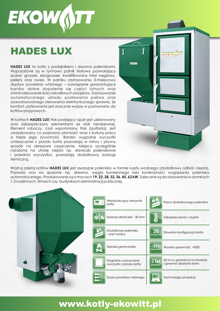 HADES LUX HADES LUX to kotły z podajnikiem i dwoma paleniskami. Wyposażone są w rynnowy palnik tłokowy pozwalający spalać groszek, ekogroszek, kwalifikowany miał węglowy, pellety oraz owies. W palniku zastosowaniu 3-miejscowy dopływ powietrza wtórnego – rozwiązanie gwarantujące bardzo dobre dopalenie się części lotnych oraz zminimalizowanie ilości szkodliwych związków. Zastosowanie automatycznego układu podawania paliwa oraz zaawansowanego sterowania elektronicznego sprawia, że komfort użytkowania jest znacznie wyższy w porównaniu do kotłów zasypowych. W kotłach HADES LUX tłok podający opał jest użebrowany oraz zabezpieczony elementami ze stali nierdzewnej. Element roboczy, czyli wspomniany tłok (szuflada), jest ułożyskowany co poprawia płynność wraz z kulturą pracy a także jego żywotność. Bardzo wygodne wyczystki umieszczone z przodu kotła pozwalają w łatwy i płynny sposób na okresowe czyszczenie. Miejsca szczególnie narażone na utratę ciepła np. drzwiczki paleniskowe i przednia wyczystka, posiadają dodatkową izolację termiczną. Ważną zaletą kotłów HADES LUX jest awaryjne palenisko w formie rusztu wodnego (dodatkowy odbiór ciepła). Pozwala ono na spalanie np. drewna, węgla kamiennego bez konieczności wygaszania paleniska automatycznego. Produkowane są o mocach 19, 22, 28, 32, 36, 45, 62 kW. Zalecane są do stosowania w domkach 1-2 rodzinnych, firmach czy budynkach administracji publicznej. Wielofunkcyjny sterownik kotła Praca dodatkowego paleniska Izolacja drzwiczek - 30 mm Zabezpieczenia i czujniki Dodatkowe palenisko - ruszt wodny Szeroka gama paliw Dogodne usytuowanie wyczystki z przodu kotła 20 konfiguracji Dowolna konfiguracja kotła <85% Wysoka sprawność <85% sprawności 5 lat gwarancji Dysze powietrza wtórnego www.kotly-ekowitt.pl 60 m-cy gwarancji na trwałość i sprawne działanie kotła Technologia produkcji PARAMETRY TECHNICZNE LP Parametr 1. Znamionowa moc cieplna Jedn. kW 19 22 28 32 36 45 62 2. Zakres mocy kW 6-19 8-22 10-28 11-32 12-36 15-45 19-62 3. Pow. ogrzew. pomieszczeń m2 do 130 130-160 160-22 220-250 250-300 300-400 400-550 4. Sprawność cieplna % 83,5-86 5. Max. temp. wody oC 90 6. Max. ciśnienie wody bar 1,5 7. Paliwo Węgiel kamienny, asortyment groszek energetyczny, typ 31 lub 32 o uziarnieniu 5 - 40 mm, udział podziarna ≤15%, wartość opałowa 26 MJ/kg 8. Zużycie paliwa 9. Pojemność zbiornika paliwa 10, Pojemność wodna 11. Masa kotła kg/h 1,2-2,4 1,9-2,6 2,6-3,9 2,8-4,5 3,0-5,8 4,0-8,3 kg 180 180 180 180 180 250 250 l 80 90 100 110 120 135 160 kg 370 415 470 500 545 640 736 Ø250 12. Wymagana średnica komina mm Ø180 Ø180 Ø200 Ø200 Ø200 Ø250 13. Wysokość komina m 6 6 8 8 8 10 14. Wymagany ciąg spalin m 15. Wymiary kotła A B C D E F mm Wymiary kocioł + kosz A1 D1 F+E mm 16. 22-25 4,9-11,0 10 30-35 580 360 1280 1440 550 300 580 360 1400 1550 550 300 620 360 1400 1550 580 300 620 360 1400 1550 610 300 620 360 1400 1550 650 300 650 360 1400 1550 700 300 650 360 1450 1600 820 300 1160 1350 850 1160 1350 850 1200 1350 880 1200 1350 910 1200 1350 950 1230 1400 1000 1230 1400 1120 Projektując konfigurację kotła typu HADES LUX należy uwzględnić przestrzeń serwisową od strony podajnika - minimum 300 mm. DANE KONTAKTOWE P.P.H.U. EKOWITT Tomice, ul. Ogrodowa 4 63-308 Gizałki tel.1. +48 795 552 724 tel.2. +48 795 552 718 e-mail: [email protected] www.kotly-ekowitt.pl
