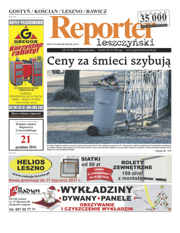 GOSTYŃ / KOŚCIAN / LESZNO / RAWICZ REKLAMA DWUTYGODNIK BEZPŁATNY NR 19 (90) 8 - 20 grudnia 2016 r. NAKŁAD 35 000 egz. www.reporterleszczynski.pl Ceny za śmieci szybują Biuro reklam i ogłoszeń Kolejny numer Reportera Leszczyńskiego 21 grudnia 2016 REKLAMA fot. Arkadiusz Jakubowski [email protected] W całym regionie opłaty za wywóz śmieci od stycznia 2017 roku szybują w górę aż o 27 i 45 procent. Wśród współwinnych podwyżek wymieniani są: zasiłek 500plus (poważnie!) oraz Ukraińcy (serio!). Nam się natomiast wydaje, że swój udział mają też urzędnicy z Komunalnego Związku Gmin Regionu Leszczyńskiego (KZGRL) czytaj str. 3-4 2 Nr 19 (90) 35 000 EGZEmPLARZY 8 - 20 grudnia 2016 r. KONKURS KAJMAKOWY! 2x 400zł Podaj trzy słowa, które kojarzą ci się z kajmakiem. O kajmaku pisaliśmy w poprzednim numerze Reportera Leszczyńskiego (nr 18/2016), który dostępny jest w archiwum na naszej stronie internetowej www.reporterleszczynski.pl. Informacje o kajmaku znajdziesz też w internecie. Odpowiedź przyślij SMS-em na numer 7257 (koszt wysłania SMS-a wynosi 2,46 zł z VAT). Na początku SMS-a napisz: REPORTER KAJMAK i dopiero potem swoją odpowiedź. Na odpowiedzi czekamy do 17 grudnia. Ogłoszenie wyników 21 grudnia w naszej gazecie. Dwie osoby, które udzielą najbardziej oryginalnej odpowiedzi wygrają po 400 zł. Ciasto kajmakowe ROZRYWKA WYNIKI KONKURSÓW Konkurs: Co powiedziała pani Irenka? Tym razem nasza komisja konkursowa doceniła nieco abstrakcyjną odpowiedź, której udzielił pan Tomasz ze Święciechowy: „Może mi pani opowiedzieć historię tej szafki?” Pan Tomasz wygrywa 100 zł Spółdzielnia Mleczarska w Gostyniu ul. Wielkopolska 1, 63-800 Gostyń tel. +48 65 575 22 00 tel. +48 65 575 22 18 Biszkopt: 5 jaj, 5 łyżek cukru, 2,5 łyżki mąki ziemniaczanej, 2,5 łyżki mąki tortowej, 1 łyżeczka proszku do pieczeniaWykonanie: Jajka ubić mikserem z 5 łyżkami cukru. Następnie do dobrze ubitej masy wsypać stopniowo mąki wymieszane z proszkiem do pieczenia i delikatnie wymieszać. Tak przygotowane ciasto wylać na blachę wcześniej wysmarowaną masłem i wyłożoną pergaminem. Biszkopt upiec w piekarniku. Czas 15 minut, temperatura 160 °C – 180 °C. Masa budyniowa: 0,5 l mleka UHT SM w Gostyniu, 0,5 szklanki cukru, 4 żółtka, ¾ szklanki mąki pszennej, ½ kostki masła extra 250 g SM w GostyniuWykonanie: Mleko z cukrem zagotować. W części mleka rozmieszać żółtka i mąkę. Następnie wszystko wlać do gotującego mleka i wolno zagotować do uzyskania masy budyniowej. Przestudzoną masę budyniową ucieramy z ½ kostki masła Masa: 1 puszka mleka słodzonego gotowanego 510 g SM w Gostyniu Bita śmietana: 0,5 litra śmietanki UHT 30 % SM w Gostyniu, 2 łyżeczki żelatyny, 2 śmietan-fix, 1 łyżka cukry pudru. Wykonanie: Śmietankę UHT ubijamy do bitej śmietany – przed końcem ubijania dodajemy cukier puder, żelatynę rozpuszczoną w jak najmniejszej ilości wody oraz śmietano- fix. Do wykonania ciasta potrzebujemy dodatkowo: 1 dużą paczkę krakersów i 2 paczki ciastek petitków. Kolejność przekładnia ciasta: biszkopt, masa budyniowa, petitki, krówka – kajmak, krakersy, bita śmietana. Na bitą śmietanę ucieramy czekoladę (tarką na grubych oczkach) kajmak 510 g. oraz 0,5 lub 0,7 l. wódki czystej 40% (zależnie od preferencji) mocno wymieszać np, w melakserze i gotowe ps. podawać schłodzone 2x 400zł Fundatorem nagrody jest Spółdzielnia Mleczarska w Gostyniu. Regulamin konkursu dostępny na stronie internetowej www.reporterleszczynski.pl oraz w siedzibie organizatora. Organizatorem konkursów jest Agencja Promocyjna Ajak A. Jakubowski wydawca Reportera Leszczyńskiego KRZYŻÓWKA Litery z pól ponumerowanych w prawym dolnym rogu, uporządkowane od 1 do 33 utworzą pytanie. Wymyśloną przez siebie odpowiedź przyślij SmS-em na numer tel. 71 43 (koszt SmS-a 1,23 zł z VAT). UWAGA! Na początku SmS-a napisz wpierw dwa słowa REPORTER KRZYZOWKA a dopiero potem swoją odpowiedź. Autorzy najbardziej oryginalnych odpowiedzi wygrają książki. Tym razem w puli nagród są cztery książki wydawnictwa REPLIKA Rozwiązanie krzyżówki z Reportera leszczyńskiego nr 17 (88): CZASEm fOTEL WŁADZY PChA SIę KOmUŚ SIŁą POD SIEDZENIE autor: Maciej Wendowski Poziomo: 1) rzemiosło zajmujące się wyrobem tkanin, 7) niejeden w książce kucharskiej, 11) mityczna istota o postaci konia, z torsem i głową człowieka, 12) pryska z ogniska, 13) część krzesła (dla pleców), 14) zaczyna się w czerwcu, 15) wycinka lasu, 16) dżinsy lub szarawary, 17) strumień płynącej wody, 18) cienki makaron, 19) lwia ... - ozdobna roślina ogrodowa, 20) hibiskus, 22) nie warto z nim igrać, 25) wygrał milion, 30) najdłuższy równoleżnik, 31) dodatek do umowy, 33) wsteczne w samochodzie, 34) pan na Olimpie, 35) reklamowy drobiazg, 36) cerkiewny obraz, 37) chodzi po niej żebrak, 38) porasta pnie drzew, kamienie, 39) Philippe, 1930 – 2006, aktor francuski (Wielkie żarcie, Kino Paradiso), 40) gra w karty, 41) brednie, banialuki, 42) nie jada mięsa, 43) kiepski futbol. Pionowo: 2) rzuca za 1, 2 lub 3 punkty, 3) brzmi w trzcinie w Szczebrzeszynie, 4) model Škody, 5) wysnute z dysputy, 6) wieś z pałacem Mielżyńskich, położona 13 km na wschód od Leszna, 7) zapowiedź pogody, 8) drobinka piasku, 9) miłe złego … (lecz koniec żałosny), 10) miesiąc żniw, 17) zapasowa do maszyny, 21) wazeliniarz, 23) snuje fantastyczne historie, 24) brat Prometeusza, ożenił się z Pandorą i otworzył jej puszkę, 25) Tym lub Lem, 26) słodka tabliczka, 27) majątkowa umowa między małżonkami, 28) faworki, 29) zuchwała pewność siebie połączona z lekceważeniem innych, 32) do mycia włosów, 33) ziółko dla zakochanych. 4x książka PODWYŻKA 35 000 EGZEmPLARZY Nr 19 (90) 8 - 20 grudnia 2016 r. 3 Horrendalna podwyżka za śmieci W całym regionie opłaty za wywóz śmieci od stycznia 2017 roku szybują w górę aż o 