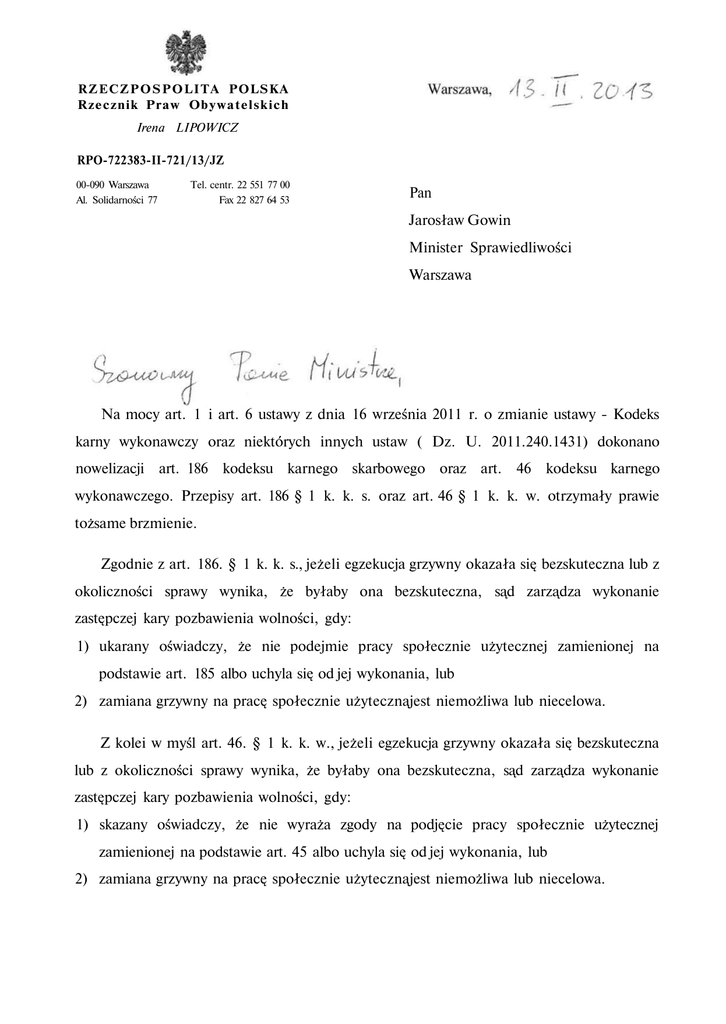 R Z E C Z P O S P O L I T A POLSKA Rzecznik Praw O b y w a t e l s k i c h Irena LIPOWICZ RPO-722383-II-721/13/JZ 00-090 Warszawa Al. Solidarności 77 Tel. centr. 22 551 77 00 Fax 22 827 64 53 Pan Jarosław Gowin Minister Sprawiedliwości Warszawa Na mocy art. 1 i art. 6 ustawy z dnia 16 września 2011 r. o zmianie ustawy - Kodeks karny wykonawczy oraz niektórych innych ustaw ( Dz. U. 2011.240.1431) dokonano nowelizacji art. 186 kodeksu karnego skarbowego oraz art. 46 kodeksu karnego wykonawczego. Przepisy art. 186 § 1 k. k. s. oraz art. 46 § 1 k. k. w. otrzymały prawie tożsame brzmienie. Zgodnie z art. 186. § 1 k. k. s., jeżeli egzekucja grzywny okazała się bezskuteczna lub z okoliczności sprawy wynika, że byłaby ona bezskuteczna, sąd zarządza wykonanie zastępczej kary pozbawienia wolności, gdy: 1) ukarany oświadczy, że nie podejmie pracy społecznie użytecznej zamienionej na podstawie art. 185 albo uchyla się od jej wykonania, lub 2) zamiana grzywny na pracę społecznie użytecznąjest niemożliwa lub niecelowa. Z kolei w myśl art. 46. § 1 k. k. w., jeżeli egzekucja grzywny okazała się bezskuteczna lub z okoliczności sprawy wynika, że byłaby ona bezskuteczna, sąd zarządza wykonanie zastępczej kary pozbawienia wolności, gdy: 1) skazany oświadczy, że nie wyraża zgody na podjęcie pracy społecznie użytecznej zamienionej na podstawie art. 45 albo uchyla się od jej wykonania, lub 2) zamiana grzywny na pracę społecznie użytecznąjest niemożliwa lub niecelowa. 2 W wyniku tej nowelizacji bardzo istotnej zmianie uległy zasady orzekania zastępczej kary pozbawienia wolności za nieuiszczoną grzywnę (por. Lex - komentarz K. Postulskiego do nowego brzmienia art. 46 k. k. w.): 1/ "niemożność" uiszczenia grzywny w takim rozumieniu tego pojęcia, jakie obowiązywało przy interpretacji art. 186 § 1 k. k. s. oraz art. 46 § 1 k. k. w., przestała być przesłanką niezbędną do zarządzenia wykonania kary zastępczej; 2/ bezskuteczność egzekucji nie jest koniecznym warunkiem zarządzenia wykonania kary zastępczej; wystarczająca jest, wynikająca z okoliczności sprawy, ocena, że byłaby ona bezskuteczna; 3/ nie istnieje możliwość warunkowego zawieszenia wykonania zastępczej kary pozbawienia wolności; 4/ zastosowanie zastępczej kary pozbawienia wolności w trybie art. 186 § 1 k. k. s. wobec sprawcy wykroczenia skarbowego, nie jest już obwarowane wymiarem nieściągalnej grzywny. Uprzednio brak spełnienia tego warunku oznaczał konieczność umorzenia grzywny; 5/ uchylony został przepis, który pozwalał na zamianę wykonania orzeczonej zastępczej kary pozbawienia wolności na pracę społecznie użyteczną i na stosowanie korzystniejszych dla skazanego przeliczników przy zamianie kary grzywny na zastępczą karę pozbawienia wolności lub na pracę społecznie użyteczną (art. 47 § 3 i 4 k. k. w); 6/ uległa zmianie terminologia odnosząca się do decyzji sądu z "sąd orzeka wykonanie zastępczej kary pozbawienia wolności" na "sąd zarządza wykonanie zastępczej kary pozbawienia wolności"; w ten sposób ujednolicono terminologię, którą ustawodawca posługuje się także w art. 65 § 1 k. k. w. i art. 75 § 1 k. k. Wprowadzone zmiany wyraźnie łagodzą wymogi potrzebne do zarządzenia wykonania kary pozbawienia wolności. Obowiązek zarządzenia wykonania zastępczej kary pozbawienia wolności powstaje w wyniku negatywnej oceny możliwości ściągnięcia grzywny w drodze egzekucji oraz niemożliwości lub niecelowości wykonania jej w formie pracy społecznie użytecznej. Nie ma przy tym znaczenia przyczyna niemożności lub niecelowości ściągnięcia grzywny w drodze egzekucji. Wystarczające jest stwierdzenie 3 faktu niemożności lub niecelowości wykonania grzywny w formie pracy społecznie użytecznej. Przy ocenie tych rozwiązań warto również uwzględnić społeczne skutki działania nowych przepisów, które w ostatnich miesiącach przedstawiono w licznych doniesieniach medialnych. Tak na przykład autor publikacji w dzienniku „Rzeczpospolita" (J. Kałucki, Kara za pomysły posłów, „Rz." z 29 października 2012 r.) opisuje, jak ostatnia nowelizacja art. 186 kodeksu karnego skarbowego doprowadziła do przymusowego wykonania wobec Joanny W. z O. - samotnej matki dwojga małych dzieci - zastępczej kary pozbawienia wolności za nieuiszczoną grzywnę. Wskazuje jednocześnie, że sposób działania organów państwowych w tej sprawie zbulwersował opinię publiczną. Mając powyższe na uwadze, na podstawie art. 13 ust. 1 pkt 2 ustawy z dnia 15 lipca 1987 r. o Rzeczniku Praw Obywatelskich (t. j . : Dz. U. z 2001 r. Nr 14, poz. 147 z późn. zm.), zwracam się do Pana Ministra z prośbą o ocenę - po ponad rocznym okresie stosowania - przyjętych w art. 186 § 1 kodeksu karnego skarbowego oraz art. 46 § 1 kodeksu karnego wykonawczego nowych rozwiązań prawnych w zakresie zastępczej kary pozbawienia wolności za nieuiszczoną grzywnę.