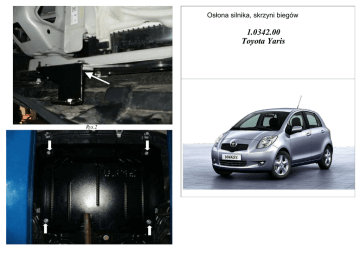 Osłona silnika, skrzyni biegów 1.0342.00 Toyota Yaris Rys.2 Osłona 1.0342.00 Montaż osłony Stosowanie: Toyota Yaris 2011- r.p. Modyfikacje Toyota Yaris Kompletność: L.p 1 2 3 4 5 Nazwa Płyta Uchwyt Listwa Śruba Podkładka Lichba cylindrów Moc KW - - Oznaczenie Skrzynia biegów Pojemość silnika cm3 - - Liczba Uwagi 376 1 219 2 СТП.8.006.033 4 8х25 8 А8 8 Schemat montażu osłony. 3 4 5 2 Rys.1 1 3 4 5 4 5 3 4 5 1. Odkręcić śrubę mocującą osłonę plastykową rys.1. 2. Przykręcić uchwyty 2 z prawej i lewej strony przez otwór do belki radiatora śrubami 4 przez listwy 3 jak wskazano na rysunku 2. Wyciąć otwory w plastyku w miejscach mocowania osłony do uchwytów. 3. Nsłożyć listwy 3 nad otworami tylnej poprzecznej belki silnika. 4. Zamocować płytę 1 od przodu do uchwytów 2 śrubami 4, od tylnej strony do poprzecznej belki silnika śrubami 4. 5. Dokręcić wszystkie miejsca mocowania. Osłona zasłania silnik, skrzynię biegów.