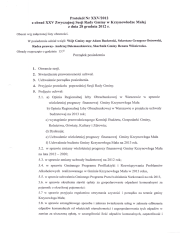 xxv z obrad obecni wlg Protokół Nr XXV/2012 Zwyczajnej Sesji Rady Gminy w Krzynowłodze Małej z dnia 28 grudnia20L2 r. załączonej listy obecności. W posiedzeniuudziaŁwzięli: Wójt Gminy mgrAdam Bacławski, Sekretarz Grzegorz Ostrowskio Radca prawny- Andrzej Dziemaszkiewicz, Skarbnik Gminy Renata Wiśniewska. obrady rozpoczęto o godzinie 13.6 Porządek posiedzenia 1. Otwarcie sesji. 2. 3. 4. 5. Stwierdzenie prawomocności uchwał. Uchwalenie porządku posiedzenia. Przyjęcie protokołu poprzedniej Sesji Rady Gminy. Podjęcie uchwał: w 5.1. a) Opinia Regionalnej Izby Obrachunkowej Warszawie w sprawie wieloletniej prognozy finansowej Gminy KrzynowłogaMała b) opinia Regionalnej lzby obrachunkowej w Warszawie o projekcie uchwały budzetowej na 2013 rok; c) wystąpienie przewodniczącego Komisji Budzetu, Gospodarki Gminy, Rolnictwa, oświaty, Kultury i Zdrowia;' d) Dyskusja; e) Uchwalenie wieloletniej prognozy finansowej Gminy KrzynowłogaMała f) Uchwalenie budżetu Gminy KrzynowłogaMała na 2013 rok. 5.2. w sprawie zmiany wieloletniej prognozy finansowej Gminy KrzynowłogaMała nalata2012 -2020; 5.3. w sprawie zmiany uchwały budzetowej 5.4. w na20l2 rok; sprawie Gminnego Programu Profilaktyki i Rozwiązywaria Problemów Alkoholowych realizowanego w Gminie KrzynowłogaMaław 2013 roku, 5.5. w sprawie uchwalenia Gminnego Programu Przeciwdziałania Narkomanii na rok2013, 5.6. w sprawie określęniastawki opłaty za gospodarowanie odpadami komunalnymi za pojemnik o określonejpojemności: 5.7 w sprawie przyjęeia regulaminu utrzymania czystościi porządku na terenie gminy Krzynowłoga Mała; 5.8. w sprawie szczegółowego sposobu i zakresu świadczęnia usług w zakresie odbierania odpadów komunalnych od właścicielinieruchomości i zagospodaro'ivania Ęch odpadów w zamian za uiszczoną opłatę, w szczegóLności ilośó odpadów komunalnych, częstotliwośó i Sposób świadczenia usług. 6. 7. 8. Informacja Wójta o realizacjt zadań między sesjami. 9. Zakonczenie sesji. Interpelacje i wnioski radnych. Inne wnioski i zaPYtania. Ad. 1 otwarcia posiedzenia dokonał Przewodniczący Rady Gminy Pan Leonard Mikołajewski' który powitał Radnych oraz przybyłych gości. Ad.z . Następnie stwierdził, iŻna stan l5 radnych, na sesji obecnych jest 13, co stanowi quorum do podej mowania prawomocnych uchwał. Ad.3 Z uwagi na brak konieczności podjęcia uchwały w sprawie zmiarry uchwały Nr XXIIV|39l20I2 Rady Gminy w Krzynowłodze Małej z dnia 14 listopada 2012 r. w sprawie trybu prac nad projektem uchwały budzetowej, Przewodnlaząay Zaproponował usunięcie ilw projektu zporządku posiedzenia na co radni vłyrazili zgodę głosując następująco:I3 za i 0 przeciw orazwstrzymujących się. Następnie poddano pod głosowanie nowy porządek posiedzenia który został zaakceptowany stosunkiem głosów 13 zai przeciw 0. Ad.4 Protokół z obtad XXIV Zvłycząnej Sesji Rady Gminy został wyłozony do wglądu. Radni uwag nie zg)'aszali. Za przyjęciem protokółu głosowało13 Radnych, głosów przeciwnych i wstrzymuj ących nie było. Protokół przyjęto j ednogłośnie. Ad. s. 5.1. a) W punkcie tym Przewodniczący Komisji Budzetowej Witold Pszczółkowski odczytał opinię RIo w Warszawie na temat Wieloletniej Prognozy Finansowej Gminy Krzynowło ga Mała na lata 2013 -2020 b) Następnie Przewodniczący Komisji Budżetowej Witold Pszczółkowski odczytał opinię RIo w Warszawie na temat Budzetu Gminy KrzynowłogaMałana 2013 rok c) Witold Pszczółkowski po odczytaniu w/w opinii wyjaśniłiż Komisja Budżetowa na swoim posiedzeniu analizując Wieloletnią Prognozę Finansową oraz projekt Budzetu nie stwierdziła nieprawidłowościi również pozy.tyrłnie opiniuje w/w projekty uchwał. d) Dyskusja. Radni nie zgłaszalipytuh ani uwag. Nie było zgłoszeh do dyskusji. e) Przewodniczący Rady Leonard Mikołajewski przedstawił projekt uchwały w sprawie Wieloletniej Prognozy Finansowej Gminy KrzynowłogaMałanalata2013 -20Ż0. Na stan radnych, obecnych na sesji, w 13 głosowaniu jawnym za przedstawionym projektem uchwały głosowało13 radnych, głosów wstrzymujących się i przeciwnych nie było. Uchwała zostałapodjęta jednogłośnie. l) Przewodniczący Rady Leonard Mikołajewski przedstawił projekt uchwały w sprawie budżetu Gminy KrzynowłogaMałanaŻOI3 rok. Na stan 13 radnych' obecnych na sesji, w głosowaniu jawnym zaprzedstawionym projektem uchwały głosowało13 radnych' głosów wstrzymujących się i przeciwnych nie było. Uchw ała została po dj ęta j edno gło śnie. 5.2. W punkcie tym Przewodniczący Rady Gminy Pan Leonard Mikołajewski przedstawił projekt uchwały w sprawie zmiany wieloletniej prognozy finansowej Gminy KrzynowłogaMil'a nalata ŻOI2 _ 2O2O . Na stan 13 radnych, obecnych na sesji, w głosowaniu jawnym za ptzedstawionym projektem uchwały głosowało i3 radnych, głosów wstrzymujących się i przeciwnych nie było. Uchwała została podj ęta j edno gło śnie. 5.3. W punkcie tym Przewodniczący Rady Gminy Pan Leonard Mikołajewski przedstawił projekt uchwały w sprawie zmiany uchwały budzetowej na20l2 rok. Na stan 13 radnych, obecnych na sesji' w głosowaniu jawnym zaprzedstawionym projektem uchwały głosowało 13 radnych' głosów wstrzymujących się i przeciwnych nie było. Uchwałazostałapodjęta jednogłośnie. 5.4. W punkcie tym Przewodniczący Rady Gminy Pan Leonard Mikołajewski przedstawił projekt uchwały w sprawie Gminnego Programu Profilaktyki i Rozwiązywania Problemów Alkoholowych realizowanego w Gminie Krzynowło gaMaŁaw 2013 roku. Na stan 13 radnych, obecnych na sesji, w głosowaniu jawnym za ptzedstawionym projektem uchwały głosowało 13 radnych, głosów wstrzymujących się i przeciwnych nie było. Uchwałazostałapodjęta jednogłośnie' 5.5. W punkcie tylrn Przewodniczący Rady Gminy Pan Leonard Mikołajewski przedstawił projekt uchwały w sprawie uchwalenia Gminnego Programu PrzecivłdziałaniaNarkomanii na rok 2