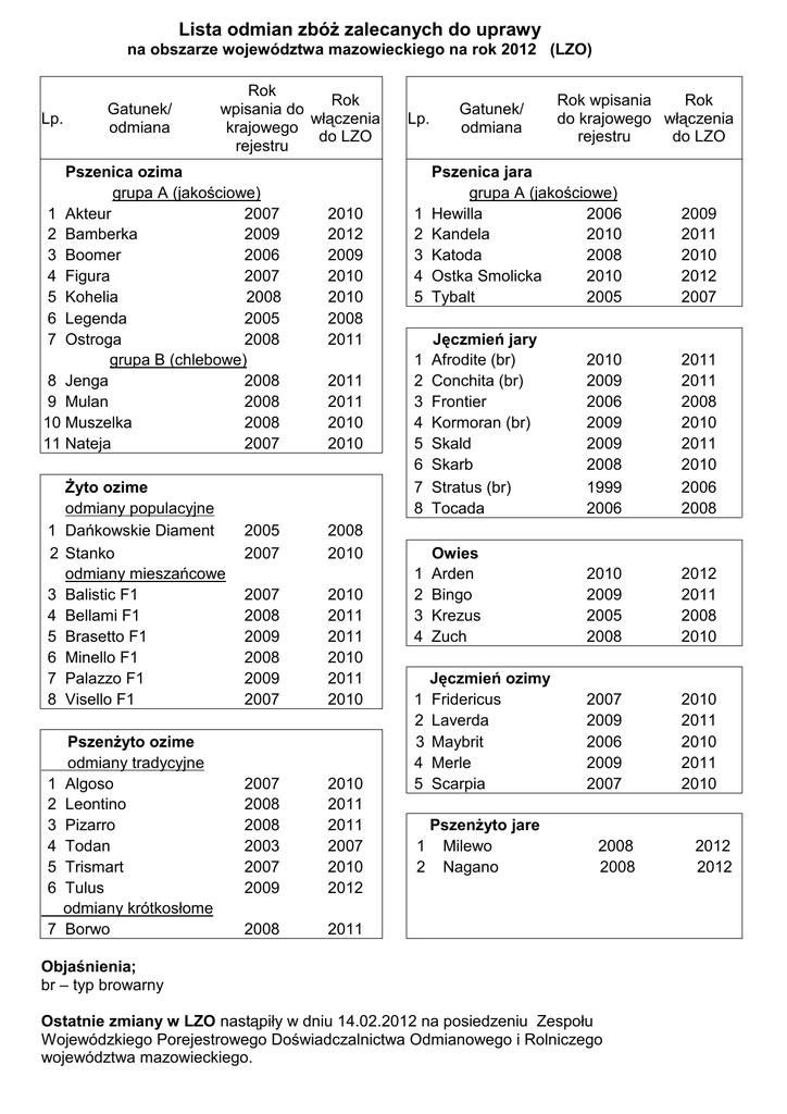 Lista odmian zbóż zalecanych do uprawy na obszarze województwa mazowieckiego na rok 2012 (LZO) Lp. Gatunek/ odmiana Rok Rok wpisania do włączenia krajowego do LZO rejestru Pszenica ozima grupa A (jakościowe) 1 Akteur 2007 2 Bamberka 2009 3 Boomer 2006 4 Figura 2007 5 Kohelia 2008 6 Legenda 2005 7 Ostroga 2008 grupa B (chlebowe) 8 Jenga 2008 9 Mulan 2008 10 Muszelka 2008 11 Nateja 2007 1 2 3 4 5 6 7 8 1 2 3 4 5 6 7 Żyto ozime odmiany populacyjne Dańkowskie Diament Stanko odmiany mieszańcowe Balistic F1 Bellami F1 Brasetto F1 Minello F1 Palazzo F1 Visello F1 Pszenżyto ozime odmiany tradycyjne Algoso Leontino Pizarro Todan Trismart Tulus odmiany krótkosłome Borwo 2005 2007 2010 2012 2009 2010 2010 2008 2011 2011 2011 2010 2010 Lp. 2010 2011 2011 2010 2011 2010 2007 2008 2008 2003 2007 2009 2010 2011 2011 2007 2010 2012 2008 2011 Rok wpisania Rok do krajowego włączenia do LZO rejestru 1 2 3 4 5 Pszenica jara grupa A (jakościowe) Hewilla 2006 Kandela 2010 Katoda 2008 Ostka Smolicka 2010 Tybalt 2005 2009 2011 2010 2012 2007 1 2 3 4 5 6 7 8 Jęczmień jary Afrodite (br) Conchita (br) Frontier Kormoran (br) Skald Skarb Stratus (br) Tocada 2010 2009 2006 2009 2009 2008 1999 2006 2011 2011 2008 2010 2011 2010 2006 2008 1 2 3 4 Owies Arden Bingo Krezus Zuch 2010 2009 2005 2008 2012 2011 2008 2010 1 2 3 4 5 Jęczmień ozimy Fridericus Laverda Maybrit Merle Scarpia 2007 2009 2006 2009 2007 2010 2011 2010 2011 2010 1 2 Pszenżyto jare Milewo Nagano 2008 2010 2007 2008 2009 2008 2009 2007 Gatunek/ odmiana 2008 2008 Objaśnienia; br – typ browarny Ostatnie zmiany w LZO nastąpiły w dniu 14.02.2012 na posiedzeniu Zespołu Wojewódzkiego Porejestrowego Doświadczalnictwa Odmianowego i Rolniczego województwa mazowieckiego. 2012 2012 LZO ZIEMNIAKI. WOJEWÓDZTWO MAZOWIECKIE. 2012 r. Lp. GRUPA WCZESNOŚCI I BARDZO WCZESNE II WCZESNE III ŚREDNIOWCZESNE IV ŚRENIOPÓŹNE I PÓŹNE ODMIANY 1. Denar 2. Impala 3. Lord 4. Miłek 5. Viviana 1. Aruba 2. Cyprian 3. Michalina 4. Owacja 5. Vineta 1. Ametyst 2. Finezja 3. Gawin 4. Satina 5. Stasia 6. Tajfun 1. Soplica 2. Syrena 3. Zenia Rok wpisania do KR Rok włączenia do LZO 1999 2003 1999 2006 2010 2007 2007 2010 2006 1999 2009 2007 2010 2000 2010 2004 2008 2002 2010 2007 2011 2007 2009 2011 2012 2010 2011 2008 2007 2012 2010 2012 2007 2011 2007 2011 2007 2012