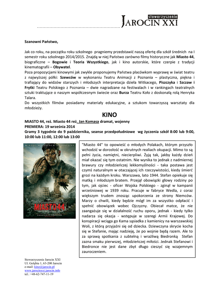 …………………………………………………… Szanowni Państwo, Jak co roku, na początku roku szkolnego pragniemy przedstawić naszą ofertę dla szkół średnich na I semestr roku szkolnego 2014/2015. Znajdą w niej Państwo zarówno filmy historyczne jak Miasto 44, biograficzne – Bogowie i Teoria Wszystkiego, jak i kino autorskie, które czerpie z tradycji kinematografii – Obywatel. Poza propozycjami kinowymi jak zwykle proponujemy Państwa placówkom wyprawę w świat teatru z najwyższej półki: Szewców w wykonaniu Teatru Animacji z Poznania – plastyczna, piękna i trafiający do widzów starszych i młodszych interpretacja dzieła Witkacego, Piszczyka i Szczaw i Frytki Teatru Polskiego z Poznania – dwie nagradzane na festiwalach i w rankingach teatralnych sztuki traktujące o naszym współczesnym świecie oraz Burza Teatru Koło z doskonałą rolą Henryka Talara. Do wszystkich filmów posiadamy materiały edukacyjne, a sztukom towarzyszą warsztaty dla młodzieży. KINO MIASTO 44, reż. Miasto 44 reż. Jan Komasa dramat, wojenny PREMIERA: 19 września 2014 Gramy 3 tygodnie do 9 października, seanse przedpołudniowe wg życzenia szkół 8:00 lub 9:00, 10:00 lub 11:00, 12:00 lub 13:00 "Miasto 44" to opowieść o młodych Polakach, którym przyszło wchodzić w dorosłość w okrutnych realiach okupacji. Mimo to są pełni życia, namiętni, niecierpliwi. Żyją tak, jakby każdy dzień miał okazać się tym ostatnim. Nie wynika to jednak z nadmiernej brawury czy młodzieńczej lekkomyślności - taka postawa jest czymś naturalnym w otaczającej ich rzeczywistości, kiedy śmierć grozi na każdym kroku. Warszawa, lato 1944. Stefan opiekuje się matką i młodszym bratem. Przejął obowiązki głowy rodziny po tym, jak ojciec - oficer Wojska Polskiego - zginął w kampanii wrześniowej w 1939 roku. Pracuje w fabryce Wedla, z coraz większym trudem znosząc upokorzenia ze strony Niemców. Marzy o chwili, kiedy będzie mógł im za wszystko odpłacić i spełnić obowiązek wobec Ojczyzny. Obiecał matce, że nie zaangażuje się w działalność ruchu oporu, jednak - kiedy tylko nadarza się okazja - wstępuje w szeregi Armii Krajowej. Do konspiracji wciąga go Kama sąsiadka z kamienicy na warszawskiej Woli, z którą przyjaźni się od dziecka. Dziewczyna skrycie kocha się w Stefanie, mając nadzieję, że po wojnie będą razem. Ale to za sprawą spotkania z subtelną i wrażliwą Biedronką Stefan zazna smaku pierwszej, młodzieńczej miłości. Jednak Stefanowi i Biedronce nie jest dane zbyt długo cieszyć się wzajemnym zauroczeniem. Stowarzyszenie Jarocin XXI Ul. Golębia 1, 63-200 Jarocin e-mail: [email protected] www.jarocinxxi.jarocin.info tel.: +48-62-747-11-19 BOGOWIE , reż. Łukasz Palkowski, biograficzny, dramat, PREMIERA: 10 października Gramy 2 tygodnie, do 23 października, seanse przedpołudniowe wg życzenia szkół 8:00 lub 9:00, 10:00 lub 11:00, 12:00 lub 13:00 Film "Bogowie" Łukasza Palkowskiego opowiada o początkach kariery przeszczepu słynnego kardiochirurga Zbigniewa Religi (w tej roli Tomasz Kot), który w roku 1985 przeprowadził pierwszy udany zabieg przeszczepienia serca w Polsce. "Bogowie" portretują wybitnego człowieka, który odważył się zmienić obowiązujące zasady. Wyjmując z ludzkiego ciała serce, Religa przełamał moralne, kulturowe i religijne tabu. Kot tak mówi o swojej roli: To jest film o pięknej sprawie i stanowi duże wyzwanie aktorskie. Podczas przygotowań poznałem ludzi uratowanych dzięki działalności Zbigniewa Religi, którzy dalej żyją. Odczuwam olbrzymią odpowiedzialność za tę rolę. Zdjęcia do nowej produkcji Łukasza Palkowskiego trwały ponad dwa miesiące. Początkowo film kręcony był na Mazurach i na Śląsku, lecz większość zdjęć zrealizowano w warszawskim Szpitalu Wolskim. Ośrodek imitował klinikę kardiochirurgii w Zabrzu, w której 5 listopada 1985 roku dokonano pierwszego udanego przeszczepu. OBYWATEL, reż. Jerzy Stuhr, komediodramat PREMIERA: 7 listopada Gramy 2 tygodnie do 20 listopada, seanse przedpołudniowe wg życzenia szkół 8:00 lub 9:00, 10:00 lub 11:00, 12:00 lub 13:00 Stowarzyszenie Jarocin XXI Ul. Golębia 1, 63-200 Jarocin e-mail: [email protected] www.jarocinxxi.jarocin.info tel.: +48-62-747-11-19 W swojej najnowszej komedii Jerzy Stuhr wyśmiewa wszystko i wszystkich, nie oszczędzając przy tym samego siebie. To najzabawniejsza rola aktora od czasu „Seksmisji”. Jak ta kultowa komedia, „Obywatel” również pokazuje, że w jakim systemie Polacy by się nie znaleźli, zawsze potrafią śmiać się ze swoich wad i wszelkich „izmów”. Obywatel Jan Bratek. Gdziekolwiek się nie pojawi, ściąga na siebie lawinę niespodziewanych zdarzeń. Niczym Forrest Gump, Bratek bierze udział w najważniejszych wydarzeniach swojej epoki. Ma wielkie szczęście, a może raczej… pecha, że zawsze znajduje się w miejscach, gdzie historia akurat zmienia swój bieg. Los miota nim zarówno w czasach komuny, jak i w nowoczesnej, demokratycznej Polsce doprowadzając do zabawnych wpadek. Jana Bratka, który przez całe życie stara się jedynie być sobą, zagrali ojciec i syn – Jerzy i Maciej Stuhrowie. TEORIA WSZYSTKIEGO, reż. James Marsh (I), dramat biograficzny, USA PREMIERA: 30.01.2014 Gramy 1 tydzień seanse przedpołudniowe wg życzenia szkół 8:00 lub 9:00, 10:00 lub 11:00, 12:00 lub 13:00 Opowieść o życiu wybitnego kosmologa, Stephena Hawkinga, jego osiągnięciach zawodowych, walce z chorobą, a przede wszystkim o uczuciu, jakie łączyło go z żoną. TEATR SZEWCY, reż. Anna Rozmianiec , TEATR ANIMACJI Z POZNANIA 1 października, Środa, godz. 18:00, kino ECHO Stanisław Ignacy Witkiewicz (1885-1939) – artysta malarz, dramaturg, powieściopisarz, filozof, fotografik. Wizjoner wyprzedzający epokę, a zarazem dotkliwie rzeczowy prześmiewca. Przenikliwość jego sądów i katastroficznych przepowiedni pozwala go potomnym odkrywać wc
