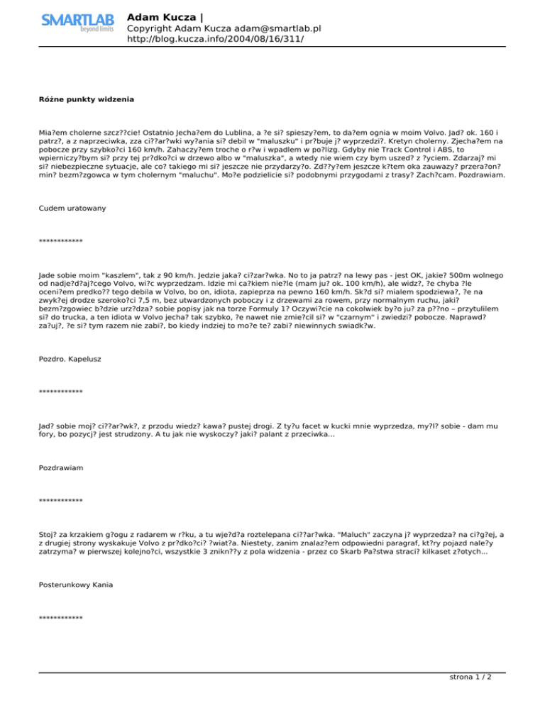 Adam Kucza | Copyright Adam Kucza [email protected] http://blog.kucza.info/2004/08/16/311/ Różne punkty widzenia Mia?em cholerne szcz??cie! Ostatnio Jecha?em do Lublina, a ?e si? spieszy?em, to da?em ognia w moim Volvo. Jad? ok. 160 i patrz?, a z naprzeciwka, zza ci??ar?wki wy?ania si? debil w "maluszku" i pr?buje j? wyprzedzi?. Kretyn cholerny. Zjecha?em na pobocze przy szybko?ci 160 km/h. Zahaczy?em troche o r?w i wpadlem w po?lizg. Gdyby nie Track Control i ABS, to wpierniczy?bym si? przy tej pr?dko?ci w drzewo albo w "maluszka", a wtedy nie wiem czy bym uszed? z ?yciem. Zdarzaj? mi si? niebezpieczne sytuacje, ale co? takiego mi si? jeszcze nie przydarzy?o. Zd??y?em jeszcze k?tem oka zauwazy? przera?on? min? bezm?zgowca w tym cholernym "maluchu". Mo?e podzielicie si? podobnymi przygodami z trasy? Zach?cam. Pozdrawiam. Cudem uratowany ************ Jade sobie moim "kaszlem", tak z 90 km/h. Jedzie jaka? ci?zar?wka. No to ja patrz? na lewy pas - jest OK, jakie? 500m wolnego od nadje?d?aj?cego Volvo, wi?c wyprzedzam. Idzie mi ca?kiem nie?le (mam ju? ok. 100 km/h), ale widz?, ?e chyba ?le oceni?em predko?? tego debila w Volvo, bo on, idiota, zapieprza na pewno 160 km/h. Sk?d si? mialem spodziewa?, ?e na zwyk?ej drodze szeroko?ci 7,5 m, bez utwardzonych poboczy i z drzewami za rowem, przy normalnym ruchu, jaki? bezm?zgowiec b?dzie urz?dza? sobie popisy jak na torze Formuly 1? Oczywi?cie na cokolwiek by?o ju? za p??no – przytulilem si? do trucka, a ten idiota w Volvo jecha? tak szybko, ?e nawet nie zmie?cil si? w "czarnym" i zwiedzi? pobocze. Naprawd? za?uj?, ?e si? tym razem nie zabi?, bo kiedy indziej to mo?e te? zabi? niewinnych swiadk?w. Pozdro. Kapelusz ************ Jad? sobie moj? ci??ar?wk?, z przodu wiedz? kawa? pustej drogi. Z ty?u facet w kucki mnie wyprzedza, my?l? sobie - dam mu fory, bo pozycj? jest strudzony. A tu jak nie wyskoczy? jaki? palant z przeciwka... Pozdrawiam ************ Stoj? za krzakiem g?ogu z radarem w r?ku, a tu wje?d?a roztelepana ci??ar?wka. "Maluch" zaczyna j? wyprzedza? na ci?g?ej, a z drugiej strony wyskakuje Volvo z pr?dko?ci? ?wiat?a. Niestety, zanim znalaz?em odpowiedni paragraf, kt?ry pojazd nale?y zatrzyma? w pierwszej kolejno?ci, wszystkie 3 znikn??y z pola widzenia - przez co Skarb Pa?stwa straci? kilkaset z?otych... Posterunkowy Kania ************ strona 1 / 2 Adam Kucza | Copyright Adam Kucza [email protected] http://blog.kucza.info/2004/08/16/311/ Lec? sobie samolotem nad tras? Warszawa - Lublin, patrz? w d??, a tam policjant za krzakami szarpie si? z radarem, kierowca ci??ar?wki pr?buje pu?ci? "maluszka", a z przeciwka mknie, du?o przekraczaj?c predko??, Volvo. Bartek ************ Jad? swoim motorkiem 280 km/h, z przodu cz?apie jaki? gostek w Volvo, z przeciwka ci??ar?wka - chyba stoi. No to daj? w ogie?, nagle wy?ania si? "maluch", m?wi? sobie - koniec ze mna... puszczam kierownic?... a tu nagle gostek w Volvo - r?wny go?? - ust?puje mi z drogi i zje?d?a na pobocze, na trawk?... Wi?c ja w manetk?, ca?e szcz??cie mia?em ASR! Uratowa? mi ?ycie, z drugiej strony jednak - dlaczego je?dzicie tak wolno? Przez takich wolnojazd?w p?zniej s? wypadki! A ja i tak wam nie dam swojej nerki! Edek ************ ?ykam sobie po pracy winko w rowie, patrz?, a tu z jednej strony jaka? ci??ar?wka, kt?ra pr?buje wyprzedzi? jaki? "kaszel", z drugiej strony jaki? gostek w Volvo podlatuje bli?ej, a ?e si? nie zmie?ci? na drodze, wi?c wje?d?a na r?w... (NA M?J R?W) i po girach mi przeje?d?a, p.... jeden, jak go k... dorw?, to nogi z dupy powyrywam - niech no tylko poczeka, a? z gipsu wylez?! Rolnik Stasiu ************ Lec? sobie UFO na pod?wietlnej, patrz? w d??, a tam jeden gostek na prehistorycznym sprz?cie bez UFO-esu daje 160 km/h. Wpad?by do rowu, ale pomog?em mu swoim polem magnetycznym i jako? wyci?gn??em go z opresji. P??niej ten drugi, co go myka?, ledwo przeszed?, a ch?opu w rowie te? si? uda?o... Ludzie!!! Nie mo?emy wszystkim ci?gle pomagac! Czy Wy wiecie, ile takich zacofanych planet mamy pod opiek?? strona 2 / 2