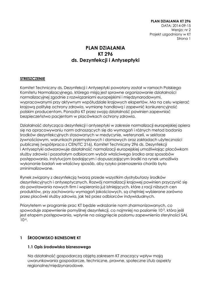 PLAN DZIAŁANIA KT 296 DATA: 2014-09-15 Wersja: nr 2 Projekt uzgodniony w KT Strona 1 PLAN DZIAŁANIA KT 296 ds. Dezynfekcji i Antyseptyki STRESZCZENIE Komitet Techniczny ds. Dezynfekcji i Antyseptyki powołany został w ramach Polskiego Komitetu Normalizacyjnego, którego misją jest sprawne organizowanie działalności normalizacyjnej zgodnie z rozwiązaniami europejskimi i międzynarodowymi, wypracowanymi przy aktywnym współudziale krajowych ekspertów. Ma na celu wspierać krajową politykę ochrony zdrowia, wymianę handlową i zapewnić konkurencyjność polskim producentom. Ponadto KT przez swoją działalność powinien zapewniać bezpieczeństwo pacjentom w placówkach ochrony zdrowia. Działalność dotycząca dezynfekcji i antyseptyki w zakresie normalizacji europejskiej opiera się na opracowywaniu norm odnoszących się do wymagań i różnych metod badania środków dezynfekcyjnych stosowanych w medycynie, weterynarii, w sektorze żywnościowym, warunkach przemysłowych i domowych oraz zakładach użyteczności publicznej (współpraca z CEN/TC 216). Komitet Techniczny 296 ds. Dezynfekcji i Antyseptyki odwzorowuje działalność normalizacji europejskiej umożliwiając placówkom służby zdrowia i pozostałym odbiorcom wybór właściwego środka oraz sposobów postępowania. Instytucjom badającym i dopuszczającym środki na rynek umożliwia wykonanie badań we właściwy sposób, aby ryzyko przenoszenia chorób było zminimalizowane. Rynek związany z dezynfekcją tworzą przede wszystkim dystrybutorzy środków dezynfekcyjnych i antyseptycznych. Rozwój normalizacji krajowej powinien przyczynić się do powstawania nowych firm i wspierania już istniejących, które z racji niższych cen produktów, przy zachowaniu wymagań jakościowych, są chętniej wybierane zarówno przez placówki służby zdrowia, jak też przez odbiorców indywidualnych. Priorytetem w programie prac KT będzie wdrażanie norm zharmonizowanych, co spowoduje zapewnienie pomyślnej dezynfekcji, co najmniej na poziomie 10-3, która jeśli jest etapem postępowania, wpłynie na osiągnięcie poziomu zapewnienia sterylności SAL 10-6. 1 ŚRODOWISKO BIZNESOWE KT 1.1 Opis środowiska biznesowego Na działalność gospodarczą objętą zakresem KT znaczący wpływ mają uwarunkowania gospodarcze, techniczne, prawne, społeczne i/lub aspekty regionalne/międzynarodowe. PLAN DZIAŁANIA KT 296 DATA: 2014-09-15 Wersja: nr 2 Projekt uzgodniony w KT Strona 2 Dezynfekcja i sterylizacja są dziedzinami, które na przestrzeni ostatnich 20 lat rozwijają się niezwykle dynamicznie z uwagi na pojawiające się niebezpieczne dla zdrowia i życia ludzi choroby. Zakażenia, zwłaszcza szpitalne, generują olbrzymie koszty, a odpowiedzialność placówek służby zdrowia zmusza je do stosowania rygorystycznych procedur chroniących pacjentów. Stosowanie rozwiązań profilaktycznych czyli rozwój szeroko pojętej higieny zmniejsza prawie dwukrotnie nakłady finansowe ponoszone w zwalczaniu zakażeń. Niektóre normy z zakresu dezynfekcji uznano w Europie za niezwykle ważne i zharmonizowano je z dyrektywą 93/42 EWG, która została wdrożona do polskiego prawa w postaci ustawy o wyrobach medycznych z dnia 20 maja 2010 r. (Dz. U. Nr 107, poz. 679 z późn. zmianami). Normy dotyczące środków dezynfekcyjnych podzielono na 4 podstawowe grupy: działające bakteriobójczo (faza 2/etap 1), działające grzybobójczo (faza 2/etap 1 i 2), działające prątkobójczo (faza 2/etap 1 i 2), działające wirusobójczo (faza 2/etap 1) i są opracowywane na zlecenie Komisji Europejskiej i Europejskiego Stowarzyszenia Wolnego Handlu. KT 296 prowadzi działalność normalizacyjną odwzorowującą prace CEN/TC 216, w postaci opiniowania projektów norm i innych dokumentów oraz tłumaczenia norm zharmonizowanych. W Polsce kwestie związane z wprowadzaniem do obrotu produktów biobójczych, w tym preparatów przeznaczonych do dezynfekcji i stosowanych w antyseptyce, reguluje ustawa o produktach biobójczych z 13 września 2002 r. (Dz. U. 2002 Nr 175 poz. 1433 z późn. zmianami – tekst jednolity z 1 lutego 2007 r. (Dz. U. Nr 39, poz. 252)) będąca wdrożeniem dyrektywy o wprowadzaniu do obrotu produktów biobójczych nr 98/8/WE. Przepis ten ułatwia rejestrację środków i znosi bariery techniczne w handlu, a także zapewnia wysoki poziom ochrony ludzi i środowiska. Powstaną dwie listy substancji aktywnych odpowiadających wymaganiom, uzgodnione w konsultacjach społecznych. Jednostkami zainteresowanymi procesem normalizacji w tej dziedzinie są wytwórcy krajowi i dystrybutorzy środków , szeroka grupa użytkowników, Ministerstwo Zdrowia, Główny Inspektorat Sanitarny, laboratoria badające produkty, Urząd Rejestracji Produktów Leczniczych, Wyrobów Medycznych i Produktów Biobójczych jako organ dopuszczający wyrób na rynek. Istotne znaczenie z punktu widzenia KT ma EN 14885, która stanowi formę przewodnika w stosowaniu norm z zakresu dezynfekcji oraz normy EN 1499 i EN 1500, które są podstawą do opracowania procedur postępowania dla personelu w placówkach służby zdrowia. PLAN DZIAŁANIA KT 296 DATA: 2014-09-15 Wersja: nr 2 Projekt uzgodniony w KT Strona 3 1.2 Wskaźniki ilościowe dotyczące środowiska biznesowego Poniższe wskaźniki ilościowe opisują środowisko biznesowe, w celu wsparcia działań KT poprzez zapewnienie niezbędnych danych: Głównymi źródłami finansowania projektów związanych z dezynfekcją są środki finansowe pochodzące z budżetu państwa, sporadycznie są to środki pochodzące z Ministerstwa Zdrowia. Spodziewane jest przywrócenie finansowania prac normalizacyjnych przez producentów i dystrybutorów środków. Wydatki z budżetu państwa na ochronę zdrowia wyniosły w 2012 r. 7 241,9 mln zł, tj. 2,3 % łącznych wydatków z budżetu. Natomiast samorządy terytorialne przeznaczyły ze swoich budżetów na ten cel 3 514,6 mln zł (łącznie ze środkami otrzymanymi z bu