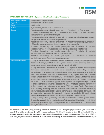 IPPB5/4510-1244/15-2/BC - Dyrektor Izby Skarbowej w Warszawie Rodzaj dokumentu Sygnatura Data Autor Temat Istota interpretacji interpretacja indywidualna IPPB5/4510-1244/15-2/BC 2016.02.03 Dyrektor Izby Skarbowej w Warszawie Podatek dochodowy od osób prawnych --> Przychody --> Przychody Podatek dochodowy od osób prawnych --> Przychody --> Sprzedaż nieruchomosci i praw majątkowych Podatek dochodowy od osób prawnych --> Koszty uzyskania przychodów -> Pojęcie kosztów uzyskania przychodów Podatek dochodowy od osób prawnych --> Koszty uzyskania przychodów -> Wydatki nieuznawane za koszty uzyskania przychodów Podatek dochodowy od osób prawnych --> Przedmiot i podmiot opodatkowania --> Powiązania gospodarcze, rodzinne, kapitałowe Podatek dochodowy od osób prawnych --> Przedmiot i podmiot opodatkowania --> Podatkowe grupy kapitałowe Podatek dochodowy od osób prawnych --> Przedmiot i podmiot opodatkowania --> Przedmiot opodatkowania 1. Czy w stosunku do transakcji, w tym darowizn, dokonywanych pomiędzy Spółkami tworzącymi PGK nie będą mieć zastosowania przepisy dotyczące cen transferowych na podstawie art. 11 ust. 8 UPDOP? 2. Czy darowizna, dokonana w ramach PGK, będzie u Spółki przekazującej darowiznę stanowić pośredni koszt podatkowy potrącalny w dacie poniesienia, tj. w momencie zawarcia notarialnej umowy darowizny, który to koszt jako element składowy dochodu albo straty Spółki Zależnej powinien zostać uwzględniony w rozliczeniu CIT Podatkowej Grupy Kapitałowej przez Spółkę Dominującą zobowiązaną do obliczenia podatku w PGK na podstawie art. la ust. 7 UPDOP lub w przypadku wystąpienia sytuacji opisanej w punkcie b) analogiczne konsekwencje podatkowe w CIT wystąpią u spółki Darczyńcy? 3. Czy darowizna, dokonana w ramach PGK, na rzecz Spółki Dominującej przez Spółkę Zależną, będzie stanowić w momencie zawarcia notarialnej umowy darowizny przychód u Spółki Dominującej otrzymującej darowiznę lub w przypadku wystąpienia sytuacji opisanej w punkcie b) analogiczne konsekwencje podatkowe w CIT wystąpią u spółki Obdarowanej? 4. Czy w przypadku sprzedaży udziałów/akcji Spółki Zależnej przez Spółkę Dominującą (skutkującej utratą statusu PGK) dochód lub strata z tytułu takiej sprzedaży powinien być uwzględniony/-na w rozliczeniu CIT Podatkowej Grupy Kapitałowej? Na podstawie art. 14b § 1 i § 6 ustawy z dnia 29 sierpnia 1997 r. Ordynacja podatkowa (Dz. U. z 2015 r., poz. 613 z późn. zm.) oraz § 4 pkt 4 rozporządzenia Ministra Finansów z dnia 22 kwietnia 2015 r. w sprawie upoważnienia do wydawania interpretacji przepisów prawa podatkowego (Dz. U. z 2015 r., poz. 643) Dyrektor Izby Skarbowej w Warszawie działający w imieniu Ministra Finansów stwierdza, że 1 stanowisko - przedstawione we wniosku z dnia 21 grudnia 2015 r. (data wpływu 29 grudnia 2015 r.) o wydanie interpretacji przepisów prawa podatkowego dotyczącej podatku dochodowego od osób prawnych w zakresie: 1. stosowania przepisów dotyczących cen transferowych w stosunku do transakcji dokonywanych pomiędzy spółkami tworzącymi Podatkową Grupę Kapitałową - jest prawidłowe, 2. kwalifikacji podatkowej i momentu poniesienia u Spółki przekazującej (Spółki Zależnej /Darczyńcy) darowizny środków pieniężnych i/lub wierzytelności własnych Spółkom w ramach Podatkowej Grupy Kapitałowej oraz momentu zaliczenia do kosztów uzyskania przychodów Podatkowej Grupy Kapitałowej ww. darowizn przekazanych w ramach grupy - jest prawidłowe, 3. powstania przychodu u Spółki Dominującej / Spółki Obdarowanej / Podatkowej Grupy Kapitałowej w związku z dokonaniem na rzecz Spółki Dominującej / Spółki Obdarowanej darowizny przez Spółkę Zależną / Darczyńcę w ramach Podatkowej Grupy Kapitałowej - jest prawidłowe, 4. rozliczenia dochodu/straty ze sprzedaży udziałów/akcji Spółki Zależnej wchodzącej w skład Podatkowej Grupy Kapitałowej - jest prawidłowe. UZASADNIENIE W dniu 29 grudnia 2015 r. został złożony ww. wniosek o udzielenie pisemnej interpretacji przepisów prawa podatkowego w indywidualnej sprawie dotyczącej podatku dochodowego od osób prawnych w zakresie: stosowania przepisów dotyczących cen transferowych w stosunku do transakcji dokonywanych pomiędzy spółkami tworzącymi Podatkową Grupę Kapitałową, kwalifikacji podatkowej i momentu poniesienia u Spółki przekazującej (Spółki Zależnej /Darczyńcy) darowizny środków pieniężnych i/lub wierzytelności własnych Spółkom w ramach Podatkowej Grupy Kapitałowej oraz momentu zaliczenia do kosztów uzyskania przychodów Podatkowej Grupy Kapitałowej ww. darowizn przekazanych w ramach grupy, powstania przychodu u Spółki Dominującej / Spółki Obdarowanej / Podatkowej Grupy Kapitałowej w związku z dokonaniem na rzecz Spółki Dominującej / Spółki Obdarowanej darowizny przez Spółkę Zależną / Darczyńcę w ramach Podatkowej Grupy Kapitałowej, rozliczenia dochodu/straty ze sprzedaży udziałów/akcji Spółki Zależnej wchodzącej w skład Podatkowej Grupy Kapitałowej. We wniosku przedstawiono następujące zdarzenie przyszłe. Grupa kapitałowa rozważa przeprowadzenie procesu restrukturyzacyjnego, którego jednym z założeń jest utworzenie podatkowej grupy kapitałowej w rozumieniu art. la ustawy o podatku dochodowym od osób prawnych (dalej: „PGK”, „Podatkowa Grupa Kapitałowa”), w skład której będą wchodzić spółka dominująca oraz spółki zależne (lub przynajmniej 1 spółka zależna). W ramach PGK wnioskodawca będzie spółką dominującą (dalej: „Spółka Dominująca”, lub „Wnioskodawca”) i jednocześnie spółką reprezentującą PGK, odpowiedzialną za rozliczenia podatkowe PGK w rozumieniu art. la ust. 3 pkt 4 oraz art. la ust. 7 ustawy o podatku dochodowym od osób prawnych (dalej: „UPDOP”). Powołanie PGK oraz założenia opisane poniżej stanowią „zdarzenie przyszłe” w rozumieniu art