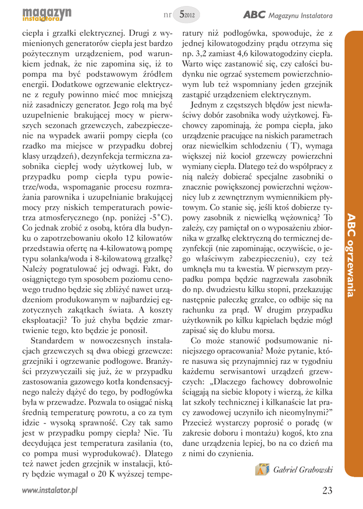 nr 52012 www.instalator.pl ratury niż podłogówka, spowoduje, że z jednej kilowatogodziny prądu otrzyma się np. 3,2 zamiast 4,6 kilowatogodziny ciepła. Warto więc zastanowić się, czy całości budynku nie ogrzać systemem powierzchniowym lub też wspomniany jeden grzejnik zastąpić urządzeniem elektrycznym. Jednym z częstszych błędów jest niewłaściwy dobór zasobnika wody użytkowej. Fachowcy zapominają, że pompa ciepła, jako urządzenie pracujące na niskich parametrach oraz niewielkim schłodzeniu (T), wymaga większej niż kocioł grzewczy powierzchni wymiany ciepła. Dlatego też do współpracy z nią należy dobierać specjalne zasobniki o znacznie powiększonej powierzchni wężownicy lub z zewnętrznym wymiennikiem płytowym. Co stanie się, jeśli ktoś dobierze typowy zasobnik z niewielką wężownicą? To zależy, czy pamiętał on o wyposażeniu zbiornika w grzałkę elektryczną do termicznej dezynfekcji (nie zapominając, oczywiście, o jego właściwym zabezpieczeniu), czy też umknęła mu ta kwestia. W pierwszym przypadku pompa będzie nagrzewała zasobnik do np. dwudziestu kilku stopni, przekazując następnie pałeczkę grzałce, co odbije się na rachunku za prąd. W drugim przypadku użytkownik po kilku kąpielach będzie mógł zapisać się do klubu morsa. Co może stanowić podsumowanie niniejszego opracowania? Może pytanie, które nasuwa się przynajmniej raz w tygodniu każdemu serwisantowi urządzeń grzewczych: „Dlaczego fachowcy dobrowolnie ściągają na siebie kłopoty i wierzą, że kilka lat szkoły technicznej i kilkanaście lat pracy zawodowej uczyniło ich nieomylnymi?” Przecież wystarczy poprosić o poradę (w zakresie doboru i montażu) kogoś, kto zna dane urządzenia lepiej, bo na co dzień ma z nimi do czynienia. GabrielGrabowski 23 ABC ogrzewania ciepła i grzałki elektrycznej. Drugi z wymienionych generatorów ciepła jest bardzo pożytecznym urządzeniem, pod warunkiem jednak, że nie zapomina się, iż to pompa ma być podstawowym źródłem energii. Dodatkowe ogrzewanie elektryczne z reguły powinno mieć moc mniejszą niż zasadniczy generator. Jego rolą ma być uzupełnienie brakującej mocy w pierwszych sezonach grzewczych, zabezpieczenie na wypadek awarii pompy ciepła (co rzadko ma miejsce w przypadku dobrej klasy urządzeń), dezynfekcja termiczna zasobnika ciepłej wody użytkowej lub, w przypadku pomp ciepła typu powietrze/woda, wspomaganie procesu rozmrażania parownika i uzupełnianie brakującej mocy przy niskich temperaturach powietrza atmosferycznego (np. poniżej -5˚C). Co jednak zrobić z osobą, która dla budynku o zapotrzebowaniu około 12 kilowatów przedstawia ofertę na 4-kilowatową pompę typu solanka/woda i 8-kilowatową grzałkę? Należy pogratulować jej odwagi. Fakt, do osiągniętego tym sposobem poziomu cenowego trudno będzie się zbliżyć nawet urządzeniom produkowanym w najbardziej egzotycznych zakątkach świata. A koszty eksploatacji? To już chyba będzie zmartwienie tego, kto będzie je ponosił. Standardem w nowoczesnych instalacjach grzewczych są dwa obiegi grzewcze: grzejniki i ogrzewanie podłogowe. Branżyści przyzwyczaili się już, że w przypadku zastosowania gazowego kotła kondensacyjnego należy dążyć do tego, by podłogówka była w przewadze. Pozwala to osiągać niską średnią temperaturę powrotu, a co za tym idzie - wysoką sprawność. Czy tak samo jest w przypadku pompy ciepła? Nie. Tu decydująca jest temperatura zasilania (to, co pompa musi wyprodukować). Dlatego też nawet jeden grzejnik w instalacji, który będzie wymagał o 20 K wyższej tempe- ABC Magazynu Instalatora