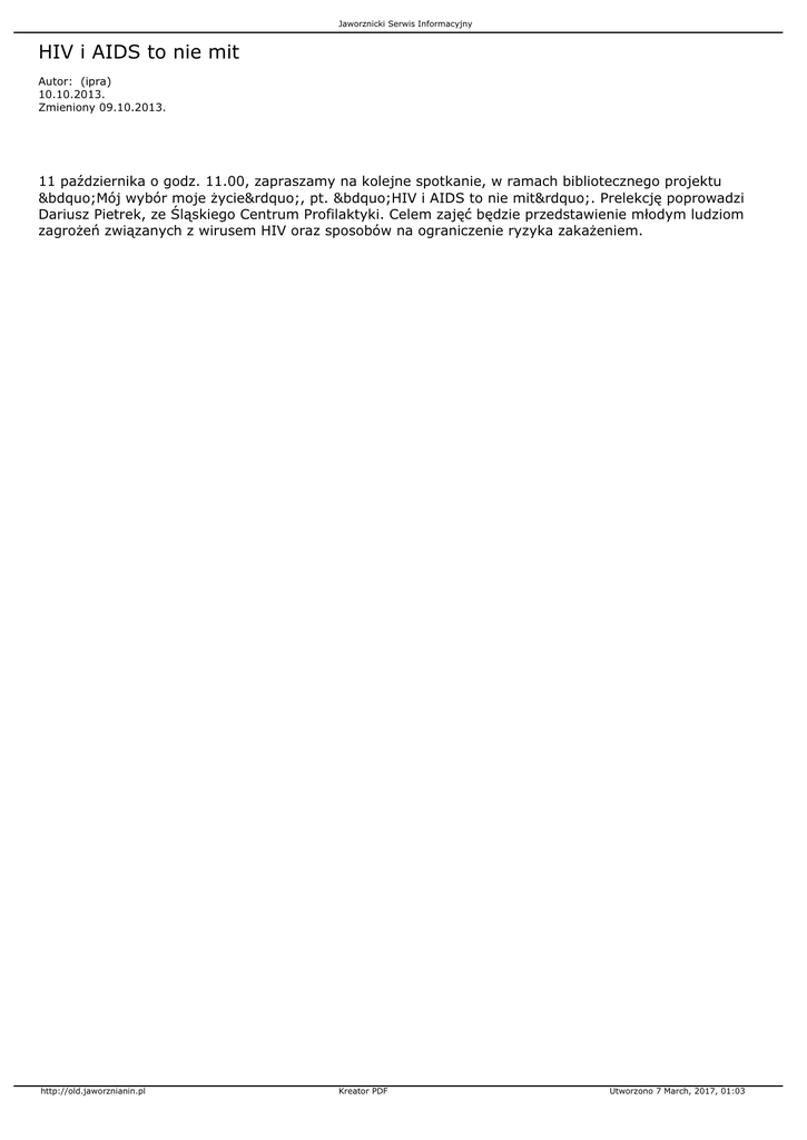Jaworznicki Serwis Informacyjny HIV i AIDS to nie mit Autor: (ipra) 10.10.2013. Zmieniony 09.10.2013. 11 października o godz. 11.00, zapraszamy na kolejne spotkanie, w ramach bibliotecznego projektu „Mój wybór moje życie”, pt. „HIV i AIDS to nie mit”. Prelekcję poprowadzi Dariusz Pietrek, ze Śląskiego Centrum Profilaktyki. Celem zajęć będzie przedstawienie młodym ludziom zagrożeń związanych z wirusem HIV oraz sposobów na ograniczenie ryzyka zakażeniem. http://old.jaworznianin.pl Kreator PDF Utworzono 7 March, 2017, 01:03