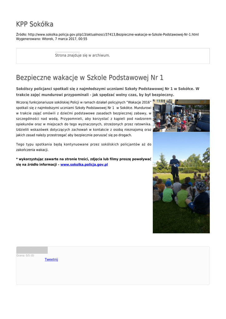 KPP Sokółka Źródło: http://www.sokolka.policja.gov.pl/p13/aktualnosci/37413,Bezpieczne-wakacje-w-Szkole-Podstawowej-Nr-1.html Wygenerowano: Wtorek, 7 marca 2017, 00:55 Strona znajduje się w archiwum. Bezpieczne wakacje w Szkole Podstawowej Nr 1 Sokólscy policjanci spotkali się z najmłodszymi uczniami Szkoły Podstawowej Nr 1 w Sokółce. W trakcie zajęć mundurowi przypominali - jak spędzać wolny czas, by był bezpieczny. Wczoraj funkcjonariusze sokólskiej Policji w ramach działań policyjnych ”Wakacje 2016” spotkali się z najmłodszymi uczniami Szkoły Podstawowej Nr 1 w Sokółce. Mundurowi w trakcie zajęć omówili z dziećmi podstawowe zasadach bezpiecznej zabawy, w szczególności nad wodą. Przypomnieli, aby korzystać z kąpieli pod nadzorem opiekunów oraz w miejscach do tego wyznaczonych, strzeżonych przez ratownika. Udzielili wskazówek dotyczących zachowań w kontakcie z osobą nieznajomą oraz jakich zasad należy przestrzegać aby bezpiecznie poruszać się po drogach. Tego typu spotkania będą kontynuowane przez sokólskich policjantów aż do zakończenia wakacji. * wykorzystując zawarte na stronie treści, zdjęcia lub filmy proszę powoływać się na źródło informacji – www.sokolka.policja.gov.pl Ocena: 0/5 (0) Tweetnij