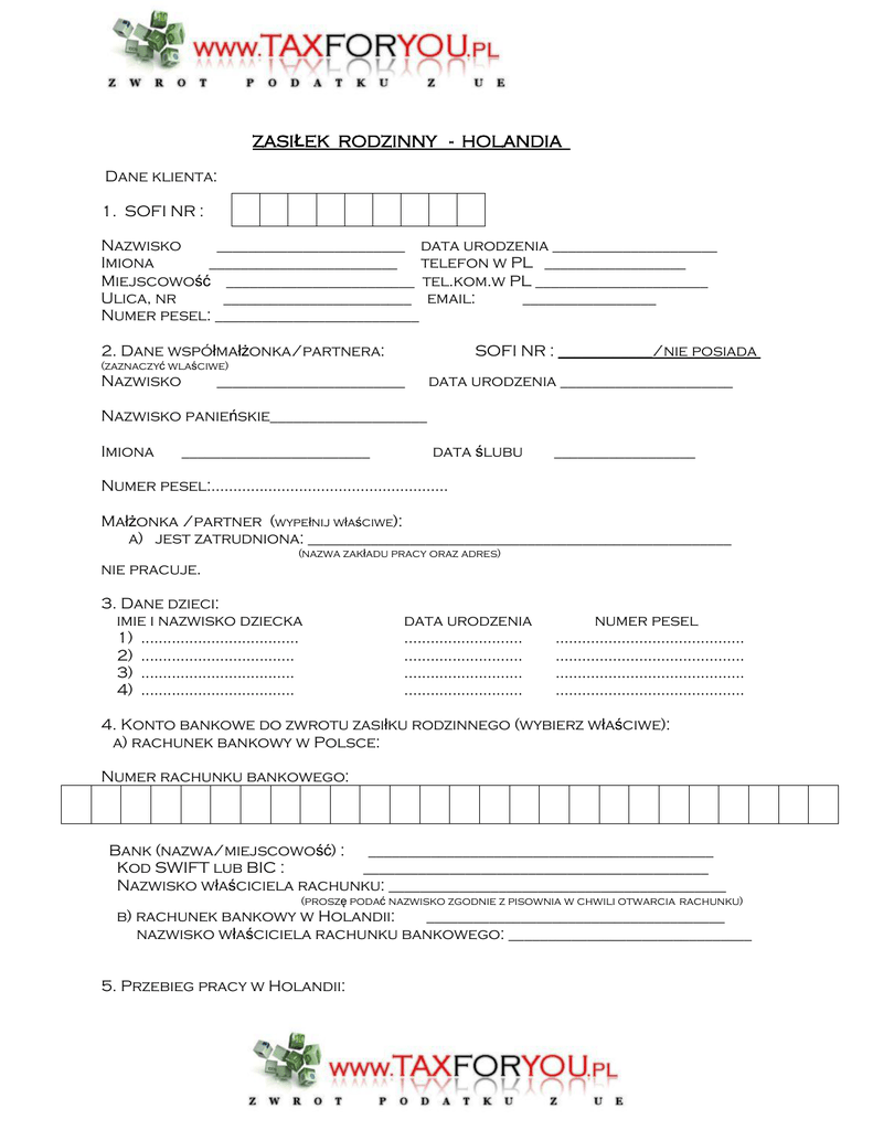 ZASIŁEK RODZINNY - HOLANDIA Dane klienta: 1. SOFI NR : Nazwisko ________________________ data urodzenia _____________________ Imiona ________________________ telefon w PL __________________ Miejscowość ________________________ tel.kom.w PL ______________________ Ulica, nr ________________________ email: _________________ Numer pesel: __________________________ 2. Dane współmałżonka/partnera: SOFI NR : ____________/nie posiada (zaznaczyć wlaściwe) Nazwisko ________________________ data urodzenia ______________________ Nazwisko panieńskie____________________ Imiona ________________________ data ślubu __________________ Numer pesel:……………………………………………… Małżonka /partner (wypełnij właściwe): a) jest zatrudniona: ______________________________________________________ (nazwa zakładu pracy oraz adres) nie pracuje. 3. Dane dzieci: imie i nazwisko dziecka 1) .................................... 2) ................................... 3) ................................... 4) ................................... data urodzenia ........................... ........................... ........................... ........................... numer pesel ……………………………………. ……………………………………. ……………………………………. ……………………………………. 4. Konto bankowe do zwrotu zasiłku rodzinnego (wybierz właściwe): a) rachunek bankowy w Polsce: Numer rachunku bankowego: Bank (nazwa/miejscowość) : ____________________________________________ Kod SWIFT lub BIC : ____________________________________________ Nazwisko właściciela rachunku: ___________________________________________ (proszę podać nazwisko zgodnie z pisownia w chwili otwarcia rachunku) b) rachunek bankowy w Holandii: ______________________________________ nazwisko właściciela rachunku bankowego: _______________________________ 5. Przebieg pracy w Holandii: Nazwa firmy Miejscowość, Kod pocztowy Ulica, numer Zatrudniony w okresie od dnia - do dnia Aktualnie posiadam umowę/kontrakt o pracę w Holandii do dnia : _________________ Pracował/am/em w Holandii w ciągu ostatnich 12 m-cy TAK / NIE Pracował/am/em w Holandii w ciągu ostatnich 5 lat TAK / NIE Przebieg pracy partnera/partnerki w Holandii: Pracował/a w ciągu ostatnich 12 m-cy w Polsce/ w Holandii TAK / NIE Pracowała w ciągu ostatnich 5 lat w Polsce/ w Holandii TAK / NIE 6. Otrzymuję zasiłek rodzinny w Polsce (dołączyć kopię decyzji) a) nie, nie otrzymuję zasiłku rodzinnego, b) tak, ja mam przyznany zasiłek rodzinny od dnia : _______ do dnia: _________ w kwocie: ____________ złotych miesięcznie, c)tak, moja małżonka/partner ma przyznany zasiłek rodzinny od dnia: ____________ do dnia: _____________ w kwocie: _________ złotych miesięcznie. 7. Data przyjazdu do Holandii: ………………………………………………. 8. Jak często utrzymywany jest kontakt z dzieckiem i w jaki sposób? …………………………………………………… 9. Do Holandii przyjechał/am/em: a) autobusem b) samochodem własnym c)inne………………………………… Upoważniam biuro TaxForYou i jego partnerow w Holandii do prowadzenia czynności związanych z zasiłkiem rodzinnym wypłacanym przez holenderski Urząd SVB. Miejscowość i data …………………………………………………………………………… podpis klienta: ………………………………………………………………………………….