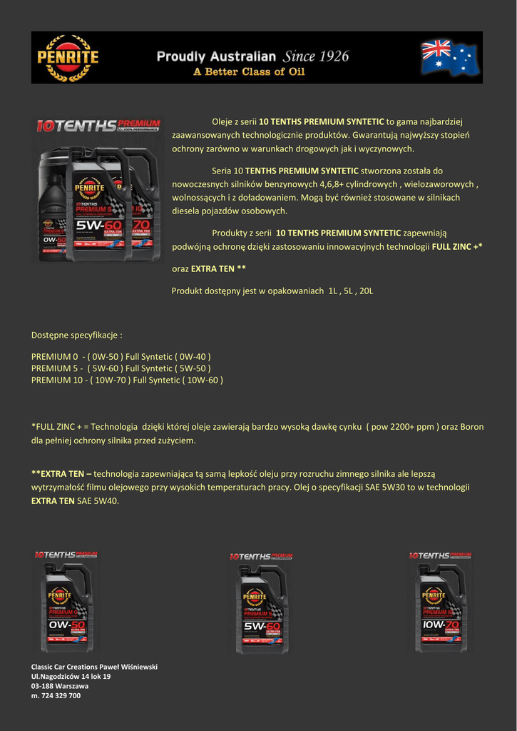 Oleje z serii 10 TENTHS PREMIUM SYNTETIC to gama najbardziej zaawansowanych technologicznie produktów. Gwarantują najwyższy stopień ochrony zarówno w warunkach drogowych jak i wyczynowych. Seria 10 TENTHS PREMIUM SYNTETIC stworzona została do nowoczesnych silników benzynowych 4,6,8+ cylindrowych , wielozaworowych , wolnossących i z doładowaniem. Mogą być również stosowane w silnikach diesela pojazdów osobowych. Produkty z serii 10 TENTHS PREMIUM SYNTETIC zapewniają podwójną ochronę dzięki zastosowaniu innowacyjnych technologii FULL ZINC +* oraz EXTRA TEN ** Produkt dostępny jest w opakowaniach 1L , 5L , 20L Dostępne specyfikacje : PREMIUM 0 - ( 0W-50 ) Full Syntetic ( 0W-40 ) PREMIUM 5 - ( 5W-60 ) Full Syntetic ( 5W-50 ) PREMIUM 10 - ( 10W-70 ) Full Syntetic ( 10W-60 ) *FULL ZINC + = Technologia dzięki której oleje zawierają bardzo wysoką dawkę cynku ( pow 2200+ ppm ) oraz Boron dla pełniej ochrony silnika przed zużyciem. **EXTRA TEN – technologia zapewniająca tą samą lepkość oleju przy rozruchu zimnego silnika ale lepszą wytrzymałość filmu olejowego przy wysokich temperaturach pracy. Olej o specyfikacji SAE 5W30 to w technologii EXTRA TEN SAE 5W40. Classic Car Creations Paweł Wiśniewski Ul.Nagodziców 14 lok 19 03-188 Warszawa m. 724 329 700