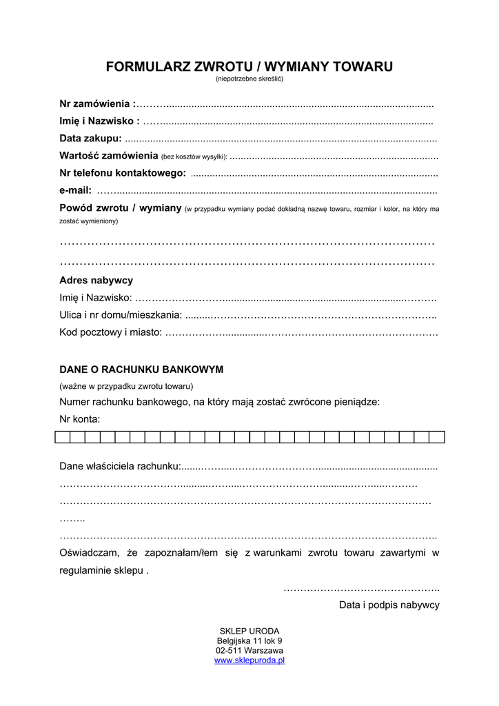 FORMULARZ ZWROTU / WYMIANY TOWARU (niepotrzebne skreślić) Nr zamówienia :………................................................................................................ Imię i Nazwisko : ……................................................................................................. Data zakupu: ................................................................................................................ Wartość zamówienia (bez kosztów wysyłki): ........................................................................... Nr telefonu kontaktowego: ......................................................................................... e-mail: ……................................................................................................................... Powód zwrotu / wymiany (w przypadku wymiany podać dokładną nazwę towaru, rozmiar i kolor, na który ma zostać wymieniony) …………………………………………………………………………………… …………………………………………………………………………………… Adres nabywcy Imię i Nazwisko: ………………………................................................................………. Ulica i nr domu/mieszkania: .........………………………………………………………….. Kod pocztowy i miasto: ………………..............……………………………………………. DANE O RACHUNKU BANKOWYM (ważne w przypadku zwrotu towaru) Numer rachunku bankowego, na który mają zostać zwrócone pieniądze: Nr konta: Dane właściciela rachunku:.......…….....……………………............................................ ………………………………..........…….....……………………..........…….....………. ………………………………………………………………………………………………… …….. ………………………………………………………………………………………………….. Oświadczam, że zapoznałam/łem się z warunkami zwrotu towaru zawartymi w regulaminie sklepu . ……………………………………….. Data i podpis nabywcy SKLEP URODA Belgijska 11 lok 9 02-511 Warszawa www.sklepuroda.pl