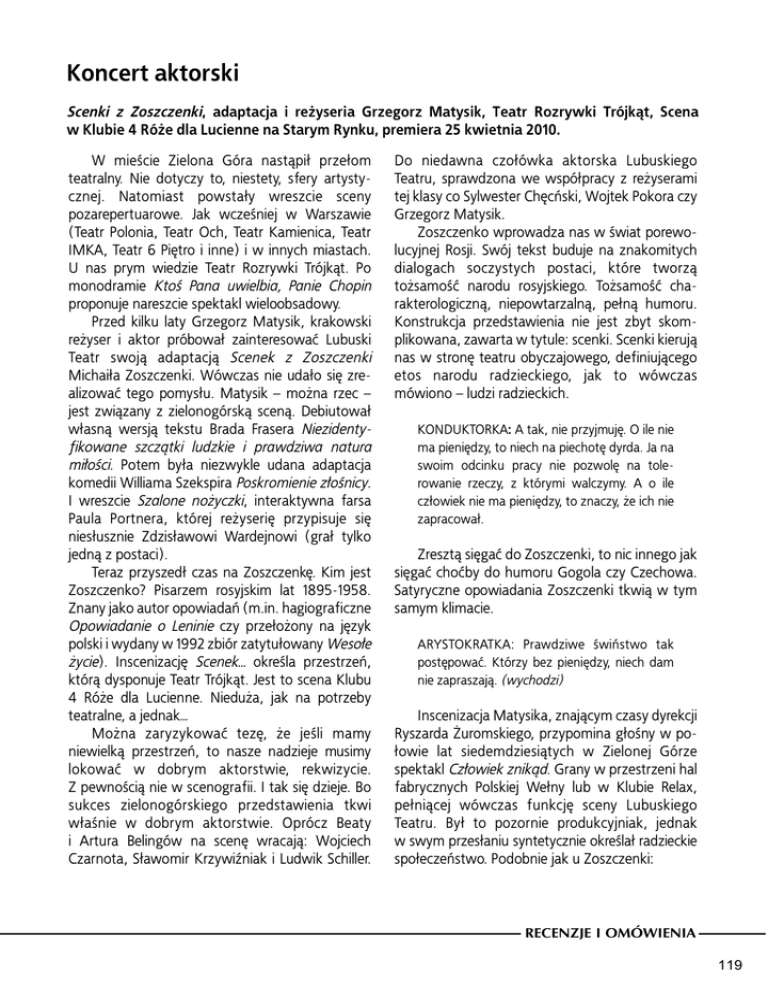 Koncert aktorski Scenki z Zoszczenki, adaptacja i reżyseria Grzegorz Matysik, Teatr Rozrywki Trójkąt, Scena w Klubie 4 Róże dla Lucienne na Starym Rynku, premiera 25 kwietnia 2010. W mieście Zielona Góra nastąpił przełom teatralny. Nie dotyczy to, niestety, sfery artystycznej. Natomiast powstały wreszcie sceny pozarepertuarowe. Jak wcześniej w Warszawie (Teatr Polonia, Teatr Och, Teatr Kamienica, Teatr IMKA, Teatr 6 Piętro i inne) i w innych miastach. U nas prym wiedzie Teatr Rozrywki Trójkąt. Po monodramie Ktoś Pana uwielbia, Panie Chopin proponuje nareszcie spektakl wieloobsadowy. Przed kilku laty Grzegorz Matysik, krakowski reżyser i aktor próbował zainteresować Lubuski Teatr swoją adaptacją Scenek z Zoszczenki Michaiła Zoszczenki. Wówczas nie udało się zrealizować tego pomysłu. Matysik – można rzec – jest związany z zielonogórską sceną. Debiutował własną wersją tekstu Brada Frasera Niezidentyfikowane szczątki ludzkie i prawdziwa natura miłości. Potem była niezwykle udana adaptacja komedii Williama Szekspira Poskromienie złośnicy. I wreszcie Szalone nożyczki, interaktywna farsa Paula Portnera, której reżyserię przypisuje się niesłusznie Zdzisławowi Wardejnowi (grał tylko jedną z postaci). Teraz przyszedł czas na Zoszczenkę. Kim jest Zoszczenko? Pisarzem rosyjskim lat 1895-1958. Znany jako autor opowiadań (m.in. hagiograficzne Opowiadanie o Leninie czy przełożony na język polski i wydany w 1992 zbiór zatytułowany Wesołe życie). Inscenizację Scenek… określa przestrzeń, którą dysponuje Teatr Trójkąt. Jest to scena Klubu 4 Róże dla Lucienne. Nieduża, jak na potrzeby teatralne, a jednak… Można zaryzykować tezę, że jeśli mamy niewielką przestrzeń, to nasze nadzieje musimy lokować w dobrym aktorstwie, rekwizycie. Z pewnością nie w scenografii. I tak się dzieje. Bo sukces zielonogórskiego przedstawienia tkwi właśnie w dobrym aktorstwie. Oprócz Beaty i Artura Belingów na scenę wracają: Wojciech Czarnota, Sławomir Krzywiźniak i Ludwik Schiller. Do niedawna czołówka aktorska Lubuskiego Teatru, sprawdzona we współpracy z reżyserami tej klasy co Sylwester Chęcński, Wojtek Pokora czy Grzegorz Matysik. Zoszczenko wprowadza nas w świat porewolucyjnej Rosji. Swój tekst buduje na znakomitych dialogach soczystych postaci, które tworzą tożsamość narodu rosyjskiego. Tożsamość charakterologiczną, niepowtarzalną, pełną humoru. Konstrukcja przedstawienia nie jest zbyt skomplikowana, zawarta w tytule: scenki. Scenki kierują nas w stronę teatru obyczajowego, definiującego etos narodu radzieckiego, jak to wówczas mówiono – ludzi radzieckich. KONDUKTORKA: A tak, nie przyjmuję. O ile nie ma pieniędzy, to niech na piechotę dyrda. Ja na swoim odcinku pracy nie pozwolę na tolerowanie rzeczy, z którymi walczymy. A o ile człowiek nie ma pieniędzy, to znaczy, że ich nie zapracował. Zresztą sięgać do Zoszczenki, to nic innego jak sięgać choćby do humoru Gogola czy Czechowa. Satyryczne opowiadania Zoszczenki tkwią w tym samym klimacie. ARYSTOKRATKA: Prawdziwe świństwo tak postępować. Którzy bez pieniędzy, niech dam nie zapraszają. (wychodzi) Inscenizacja Matysika, znającym czasy dyrekcji Ryszarda Żuromskiego, przypomina głośny w połowie lat siedemdziesiątych w Zielonej Górze spektakl Człowiek znikąd. Grany w przestrzeni hal fabrycznych Polskiej Wełny lub w Klubie Relax, pełniącej wówczas funkcję sceny Lubuskiego Teatru. Był to pozornie produkcyjniak, jednak w swym przesłaniu syntetycznie określał radzieckie społeczeństwo. Podobnie jak u Zoszczenki: RECENZJE I OMÓWIENIA 119 ELEKTROMONTER: A-a, to tak! Dobra, to ja dziś nie gram. Nie będę oświetlał waszego przedsiębiorstwa. Grajcie beze mnie. Zobaczymy kto ważniejszy i kogo należy fotografować gdzieś z boku, a kogo sadzać w środkowym krześle. (wraca do PANIENKI i wyłącza światło. Kompletna ciemność) Przy okazji tej inscenizacji jawi się odpowiedź na pytanie: „jak postępować w teatrze z rosyjską literaturą?” (a to w kontekście ostatniej adaptacji Trzech sióstr Czechowa w Lubuskim Teatrze). Pisałem o tym w recenzji Pusty Czechow. Zatem czy dopisywać, czy aktualizować? Otóż zamiast dopisywać można przecież sięgać np. do Sigariewa czy Kolady, do ich oryginalnych, współczesnych tekstów. Zamiast dopisywać bezmyślne dialogi wywodzące się z koniunkturalnych i powtarzal- 120 nych rozwiązań scenicznych i dramatopisarskich współczesnego teatru. Albo sięgać do Zoszczenki, którego dialogi brzmią jakże aktualnie, jak choćby te: PACJENT I: Raz w tygodniu leczę się na choroby wewnętrzne i przepuklinę, tu, u doktora Opuszkina. To dobry medyk, rozumiejący. Leczę się u niego już piąty rok. I w porządku, nie jest mi gorzej. PACJENT II: Co to, kochaniutki, za choroba, ta twoja przepuklina. Splunąć i rozetrzeć – tyle twojej choroby. Co innego ja. Nie liczy się, że gębę mam wypukłą, jestem niezależnie okropnie chory. Nerki mi dolegają. Andrzej Buck