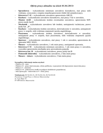 Oferty pracy aktualne na dzień 01.04.2011r − − − − − − − − − − − − − Sprzedawca – wykształcenie minimum zawodowe kierunkowe, staż pracy mile widziany, orzeczenie o stopniu niepełnosprawności (lekki lub umiarkowany), Kierowca C+E – wykształcenie zawodowe uprawnienia ABCiE, Kucharz – wykształcenie zawodowe kierunkowe, staż pracy 5 lat w zawodzie, Monter AGD – wykształcenie średnie ewentualnie zawodowe, uprawnienia SEP, prawo jazdy kat.B Mechanik – wykształcenie zawodowe lub średnie, umiejętności techniczne, prawo jazdy kat. „B”, Kucharz – wykształcenie średnie zawodowe, doświadczenie w zawodzie, umiejętność pracy w zespole, mile widziana znajomość języka angielskiego, Pizzermen – wykształcenie średnie zawodowe, doświadczenie w zawodzie, umiejętność pracy w zespole, kurs pizzermena, mile widziana znajomość języka angielskiego, Spawacz – wykształcenie zawodowe, staż pracy 1 rok w zawodzie, uprawnienia do spawania MIG, MAG, Ślusarz – wykształcenie zawodowe, 1 rok stażu pracy, umiejętność spawania, Kierowca C+E – wykształcenie minimum zawodowe, 1 rok stażu pracy w zawodzie, wszystkie uprawnienia niezbędne przy prowadzeniu pojazdu Kierowca kat. B – wykształcenie zawodowe, prawo jazdy kat.B Pomocnik lakiernika – wykształcenie zawodowe, 2 lata stażu pracy Ślusarz – tokarz - wykształcenie zawodowe, 2 lata stażu pracy Szczegółowe informacje można uzyskać: - Pokój nr 20 - staże - Pokój nr 21 - prace interwencyjne, roboty publiczne, wyposażenie lub doposażenie stanowiska pracy - Pokój nr 5 - szkolenia - Pokój nr 18 - jednorazowe środki na podjęcie działalności gospodarczej - Sala operacyjna - stanowisko nr 9 - oferty pracy Telefonicznie 29-74-521-51, 29-74-521-52, 29-74-533-93 Powiatowy Urząd Pracy w Ostrowi Mazowieckiej ul. 3-go Maja 55 07-300 Ostrów Mazowiecka