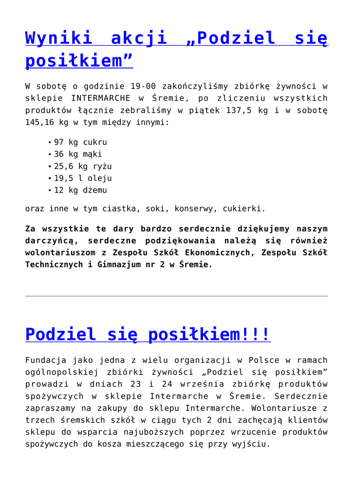Wyniki akcji posiłkiem” „Podziel się W sobotę o godzinie 19-00 zakończyliśmy zbiórkę żywności w sklepie INTERMARCHE w Śremie, po zliczeniu wszystkich produktów łącznie zebraliśmy w piątek 137,5 kg i w sobotę 145,16 kg w tym między innymi: 97 kg cukru 36 kg mąki 25,6 kg ryżu 19,5 l oleju 12 kg dżemu oraz inne w tym ciastka, soki, konserwy, cukierki. Za wszystkie te dary bardzo serdecznie dziękujemy naszym darczyńcą, serdeczne podziękowania należą się również wolontariuszom z Zespołu Szkół Ekonomicznych, Zespołu Szkół Technicznych i Gimnazjum nr 2 w Śremie. Podziel się posiłkiem!!! Fundacja jako jedna z wielu organizacji w Polsce w ramach ogólnopolskiej zbiórki żywności „Podziel się posiłkiem” prowadzi w dniach 23 i 24 września zbiórkę produktów spożywczych w sklepie Intermarche w Śremie. Serdecznie zapraszamy na zakupy do sklepu Intermarche. Wolontariusze z trzech śremskich szkół w ciągu tych 2 dni zachęcają klientów sklepu do wsparcia najuboższych poprzez wrzucenie produktów spożywczych do kosza mieszczącego się przy wyjściu. Rozbiórka schroniska w Śremie W dniu 19 Września Fundacja przystąpiła do prac związanych z rozbiórką schroniska dla kobiet mieszczącego się w Śremie przy ulicy Dutkiewicza 8a, a następnie przystąpimy do budowy nowego, 2 piętrowego budynku przeznaczonego na schronisko dla 24 kobiet z dziećmi na które pozyskaliśmy pieniądze z Banku Gospodarstwa Krajowego w Warszawie. W rozbiórkę zaangażowani są wolontariusze między innymi nasi podopieczni, za co im serdecznie dziękujemy !! Mini Olimpiada Sportowa 2011 i już po… 15 Września 2011 na Przystani „Marina” w Śremie odbyła się Mini Olimpiada Sportowa w której udział wzięły osoby niepełnosprawne z Powiatu Śremskiego. Wszyscy uczestnicy wzięli udział w 10 rozgrywkach sportowych. Po rywalizacji sportowej uczestnicy imprezy wspólnie bawili się przy muzyce. Każdy uczestnik mógł skosztować podczas imprezy kiełbaski z grilla, bigosu czy chleba ze smalcem i pysznym ogórkiem. Należy jednak pamiętać że Mini Olimpiada nie odbyłaby się bez pomocy wolontariuszy. Młodzież z Zespołu Szkół Technicznych im. Hipolita Cegielskiego w Śremie przeprowadziła konkurencję sportowe oraz pilnowała porządku podczas imprezy. Natomiast wolontariusze z Zespołu Szkół Politechnicznych im. Powstańców Wielkopolskich zabezpieczyli obsługę gastronomiczną. Za co Wolontariuszom bardzo dziękujemy. Impreza została sfinansowana ze środków PCPR w Śremie oraz od sponsorów: PGK w Śremie, PISOP w Lesznie i innych. Wszystkim darczyńcom serdecznie dziękujemy za pomoc w organizacji tego przedsięwzięcia. Mini Olimpiada Sportowa 2011 Serdecznie zapraszamy 15.09.2011r na organizowana przez Fundację imprezę jaką jest Mini Olimpiadę sportową ruszamy o godzinie 10:00 na terenie przystani „Marina” w Śremie. Na uczestników imprezy czekać będzie szereg atrakcyjnych konkurencji sportowych, wspaniałe nagrody i bardzo smaczny poczęstunek: kiełbaski z grilla, placek drożdżowy. SERDECZNIE ZAPRASZAMY!!! Kolejny transport z Wielkopolskiego Banku Żywności w Poznaniu Fundacja od wielu lat współpracuje z Wielkopolskim Bankiem Żywności w Poznaniu w ostatnim transporcie otrzymaliśmy między innymi : Mleko napoje gazowane kukurydze w puszkach śledzie i pasty rybne sosy do makaronu makaron świderki i muszelki zupa krupnik kasza z gulaszem w puszcze zupa pomidorowa w puszcze makaron z gulaszem w puszcze kasza gryczana kasza z warzywami ser żółty płatki kukurydziane i musli łącznie ponad 13 ton żywności. Wycieczka do Uniejowa Uczestnicy tegorocznych półkolonii letnich organizowanych w świetlicy w Psarskim 30 sierpnia wzięli udział w wycieczce do basenów termalnych w Uniejowa. Dzieci oprócz zabaw w basenach wzięły udział w barwnych zajęciach, podczas których uczestnicy zobaczyli piękne stroje średniowieczne i inne atrakcje. Każdy z uczestników podczas pobytu w Uniejowie posilił się pysznych obiadkiem. Wyjazd ten miała oficjalnie zakończyć letni wypoczynek organizowany w ramach półkolonii. Wycieczka została zorganizowana z środków Gminy Śrem, Fundacji oraz prywatnych sponsorów. Zakończenie letnich półkolonii 12 sierpnia zakończyły się dwu tygodniowe półkolonie w świetlicy „oaza” w Psarskim. Drugi tydzień zajęć jak i pierwszy również obfitował w interesujące atrakcje między innymi: spotkanie z szefem kuchni i wspólne gotowanie na wesoło, konkurs plastyczny, lepienie z masy solnej, poznanie historii zabytków śremskich. Na zakończenie każdy z uczestników otrzymał paczkę ze słodyczami oraz upominek. Przepyszne obiadki serwowane były przez firmę GastronomicznoHandlową M. Z. Bianek. Wypoczynek został sfinansowany przez Wielkopolski Urząd Wojewódzki w Poznaniu, Gminę Śrem oraz prywatnych sponsorów. Za co w umieniu naszych podopiecznych bardzo dziękujemy. Wspomnienia z wycieczki do „Chaty Kowala” Pierwszy tydzień półkolonii już za nami ! Z pewnością największa atrakcją tego tygodnia (może za wyjątkiem zabaw pirackich), była piątkowa wycieczka do Chaty Kowala w Kluczewie gdzie uczestnicy półkolonii mogli się przekonać ,,Jak wygląda życie na wsi” oraz jak hoduje i pielęgnuje się zwierzęta w gospodarstwie. W programie zajęć przewidziane były również wyścigi rydwanów.. a po nich ognisko. Połkolonie w świetlicy… I tydzień połkoloni w obiektywie