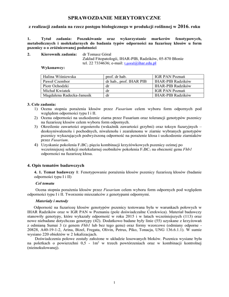 SPRAWOZDANIE MERYTORYCZNE z realizacji zadania na rzecz postępu biologicznego w produkcji roślinnej w 2016. roku 1. Tytuł zadania: Poszukiwanie oraz wykorzystanie markerów fenotypowych, metabolicznych i molekularnych do badania typów odporności na fuzariozę kłosów u form pszenicy o o zróżnicowanej podatności 2. Kierownik zadania: dr Tomasz Góral Zakład Fitopatologii, IHAR-PIB, Radzików, 05-870 Błonie tel. 22 7334636; e-mail: [email protected] Wykonawcy: Halina Wiśniewska Paweł Czembor Piotr Ochodzki Michał Kwiatek Magdalena Radecka-Janusik prof. dr hab. dr hab., prof. IHAR PIB dr dr dr IGR PAN Poznań IHAR-PIB Radzików IHAR-PIB Radzików IGR PAN Poznań IHAR-PIB Radzików 3. Cele zadania: 1) Ocena stopnia porażenia kłosów przez Fusarium celem wyboru form odpornych pod względem odporności typu I i II. 2) Ocena odporności na uszkodzenie ziarna przez Fusarium oraz tolerancji genotypów pszenicy na fuzariozę kłosów celem wyboru form odpornych. 3) Określenie zawartości ergosterolu (wskaźnik zawartości grzybni) oraz toksyn fuzaryjnych – deoksyniwalenolu i pochodnych, niwalenolu i zearalenonu w ziarnie wybranych genotypów pszenicy wykazujących podwyższoną odporność na porażenie kłosa i uszkodzenie ziarniaków przez Fusarium. 4) Uzyskanie pokolenia F1BC2 pięciu kombinacji krzyżówkowych pszenicy ozimej po wcześniejszej selekcji molekularnej osobników pokolenia F1BC1 na obecność genu Fhb1 odporności na fuzariozę kłosa. 4. Opis tematów badawczych 4. 1. Temat badawczy 1: Fenotypowanie porażenia kłosów pszenicy fuzariozą kłosów (badanie odporności typu I i II) Cel tematu Ocena stopnia porażenia kłosów przez Fusarium celem wyboru form odpornych pod względem odporności typu I i II. Tworzenie mieszańców z genotypami odpornymi. Materiały i metody Odporność na fuzariozę kłosów genotypów pszenicy testowana była w warunkach polowych w IHAR Radzików oraz w IGR PAN w Poznaniu (pole doświadczalne Cerekwica). Materiał badawczy stanowiły genotypy, które wykazały odporność w roku 2015 i w latach wcześniejszych (113) oraz nowe niebadane dotychczas genotypy (42). Dodatkowo badane były linie (55) uzyskane z krzyżowań z odmianą Sumai 3 (z genem Fhb1 lub bez tego genu) oraz formy wzorcowe (odmiany odporne 20828, A40-19-1-2, Arina, Bizel, Fregata, Olivin, Petrus, Piko, Tonacja, UNG 136.6.1.1). W sumie wysiano 220 obiektów w 2 lokalizacjach. Doświadczenia polowe zostały założone w układzie losowanych bloków. Pszenica wysiane była na poletkach o powierzchni 0,5 - 1m2 w trzech powtórzeniach oraz w kombinacji kontrolnej (nieinokulowanej). 1 Fot. 1. Izolat F. culmorum na pożywce PDA oraz zarodnikowanie F. culmorum na ziarnie pszenicy w szklanych kolbach.. Do produkcji inokulum zastosowano 3 izolaty Fusarium culmorum, wytwarzające deoksyniwalenol oraz zearalenon. Izolaty te zostały przetestowane pod względem agresywności wobec pszenicy i pszenżyta i były używane do oceny odporności w warunkach polowych. Izolaty inkubowane były na autoklawowanym ziarnie pszenicy w szklanych kolbach przez około 4 tygodni a następnie były naświetlane ciągłym światłem UV przez 4 do 7 dni w temperaturze 18oC (Fot. 1). Ziarno skolonizowane przez F. culmorum było następnie suszone i przechowywane w lodówce w temperaturze 4oC do momentu użycia. W dniu, kiedy wykonywana była inokulacja, ziarno z grzybnią i zarodnikami F. culmorum namaczano w wodzie przez około 2 godziny i następnie filtrowano w celu uzyskania zawiesiny zarodników. Stężenie zawiesin zarodników ustalono na około 5 x 105 zar./ml za pomocą hematokrytu. Zawiesiny ze wszystkich izolatów były mieszane w równych proporcjach. Zastosowano technikę inokulacji przez opryskiwanie (Fot. 2). Pozwoliło to na określenie połączonych typów odporności I (odporność na infekcję) oraz II (odp. na rozprzestrzenianie się patogena w tkankach). Kłosy pszenicy w fazie kwitnienia opryskiwano zawiesiną zarodników w ilości około 100 ml zawiesiny na 1 m-2. Inokulacja prowadzona była oddzielnie na każdym poletku na początku kwitnienia i powtarzana około 3 dni później w fazie pełni kwitnienia. Inokulacje prowadzone były w godzinach wieczornych, kiedy wzrastała względna wilgotność powietrza. W Cerekwicy zastosowano dodatkowe zamgławianie kłosów przez 72 po inokulacji. Ocena porażenia została rozpoczęta około 10 dni po ostatniej inokulacji. Przeprowadzono dwie oceny w odstępach 7dniowych. Nasilenie fuzariozy kłosów było określane na podstawie proporcji porażonych kłosków w kłosie (tylko w kłosach z objawami choroby) oraz proporcji kłosów porażonych na poletku. Z tych wartości został wyliczony indeks fuzariozy kłosów (IFK): IFK = (% porażenia kłosa x % kłosów porażonych na poletku)/100 Fot. 2. Inokulacja kłosów pszenicy ozimej (z lewej) oraz mikrozraszzcze (z prawej) na polu doświadczalnym w Cerekwicy (IGR PAN Poznań). Badanie odporności typu I (odporność na infekcję) i II (odporność na rozprzestrzenianie się Fusarium w kłosie): 2 W celu przebadania odporności typów 1 i 2 wysiano 80 genotypów pszenicy ozimej w dwóch doświadczeniach w warunkach częściowo kontrolowanych w tunelach foliowych z instalacją zraszającą. Dla określenia odporności typu I kłosy pszenicy opryskiwane były zawiesiną zarodników F. culmorum o stężeniu 105 zar./ml. Po 7-10 dniach od inokulacji oceniana była liczba punktów infekcji na 10 kłosach na poletku (Fot. 3). Fot. 3. Kłosy pszenicy z objawami fuzariozy kłosów po opryskaniu zawiesiną zarodników F. culmorum w celu oceny odporności na infekcję Fot 4. Inokulacja punktowa kłosów pszenicy w tunelu doświadczalnym w IHAR-PIB Radzików w celu oceny odporności na rozprzestrzenianie się Fusarium w kłosie Dla określenia odporności typu II zastosowana była metoda inokulacji punktowej kłosów (Fot. 4). Metoda ta jest używana do szacowania odporności typu II i pozwala na pr