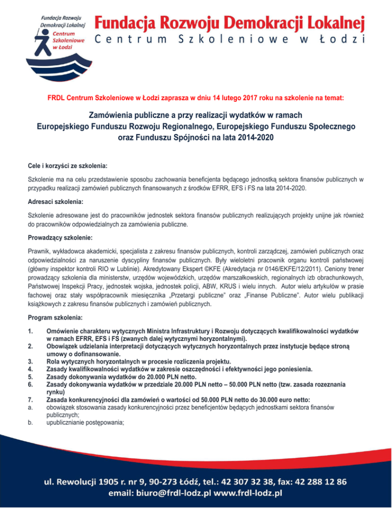 FRDL Centrum Szkoleniowe w Łodzi zaprasza w dniu 14 lutego 2017 roku na szkolenie na temat: Zamówienia publiczne a przy realizacji wydatków w ramach Europejskiego Funduszu Rozwoju Regionalnego, Europejskiego Funduszu Społecznego oraz Funduszu Spójności na lata 2014-2020 Cele i korzyści ze szkolenia: Szkolenie ma na celu przedstawienie sposobu zachowania beneficjenta będącego jednostką sektora finansów publicznych w przypadku realizacji zamówień publicznych finansowanych z środków EFRR, EFS i FS na lata 2014-2020. Adresaci szkolenia: Szkolenie adresowane jest do pracowników jednostek sektora finansów publicznych realizujących projekty unijne jak również do pracowników odpowiedzialnych za zamówienia publiczne. Prowadzący szkolenie: Prawnik, wykładowca akademicki, specjalista z zakresu finansów publicznych, kontroli zarządczej, zamówień publicznych oraz odpowiedzialności za naruszenie dyscypliny finansów publicznych. Były wieloletni pracownik organu kontroli państwowej (główny inspektor kontroli RIO w Lublinie). Akredytowany Ekspert ©KFE (Akredytacja nr 0146/EKFE/12/2011). Ceniony trener prowadzący szkolenia dla ministerstw, urzędów wojewódzkich, urzędów marszałkowskich, regionalnych izb obrachunkowych, Państwowej Inspekcji Pracy, jednostek wojska, jednostek policji, ABW, KRUS i wielu innych. Autor wielu artykułów w prasie fachowej oraz stały współpracownik miesięcznika „Przetargi publiczne” oraz „Finanse Publiczne”. Autor wielu publikacji książkowych z zakresu finansów publicznych i zamówień publicznych. Program szkolenia: 1. 2. 3. 4. 5. 6. 7. a. b. Omówienie charakteru wytycznych Ministra Infrastruktury i Rozwoju dotyczących kwalifikowalności wydatków w ramach EFRR, EFS i FS (zwanych dalej wytycznymi horyzontalnymi). Obowiązek udzielania interpretacji dotyczących wytycznych horyzontalnych przez instytucje będące stroną umowy o dofinansowanie. Rola wytycznych horyzontalnych w procesie rozliczenia projektu. Zasady kwalifikowalności wydatków w zakresie oszczędności i efektywności jego poniesienia. Zasady dokonywania wydatków do 20.000 PLN netto. Zasady dokonywania wydatków w przedziale 20.000 PLN netto – 50.000 PLN netto (tzw. zasada rozeznania rynku) Zasada konkurencyjności dla zamówień o wartości od 50.000 PLN netto do 30.000 euro netto: obowiązek stosowania zasady konkurencyjności przez beneficjentów będących jednostkami sektora finansów publicznych; upublicznianie postępowania; ul. Rewolucji 1905 r. nr 9, 90-273 Łódź, tel.: 42 632 63 19, fax: 42 288 12 86 email: [email protected] www.frdl-lodz.pl c. d. e. f. 8. a. b. c. d. e. f. g. h. 9. opis przedmiotu zamówienia, kryteria oceny ofert, warunki udziału w postępowaniu; konflikt interesów; przebieg i dokumentowanie postępowania, szacowania wartości zamówienia Zamówienia publiczne powyżej 30.000 euro przy realizacji projektu finansowanego z środków EFRR, EFS i FS na lata 2014-2020: szacowanie wartości zamówienia publicznego; wymogi dotyczące opisu przedmiotu zamówienia publicznego przy realizacji projektu finansowanego z środków EFRR, EFS i FS na lata 2014-2020; ustalanie terminów dla wykonawców przy realizacji projektu finansowanego z środków EFRR, EFS i FS na lata 20142020; upublicznianie informacji o postępowaniach o zamówienie publiczne przy realizacji projektu finansowanego z środków EFRR, EFS i FS na lata 2014-2020 kryteria oceny ofert przy realizacji projektu finansowanego z środków EFRR, EFS i FS na lata 2014-2020; klauzule społeczne – obowiązek, czy uprawnienie zamawiającego? stosowanie trybów niekonkurencyjnych w tym obowiązek zamieszczania ogłoszenia o zamiarze zawarcia umowy w trybie niekonkurencyjnym (wolna ręka, zapytanie o cenę, negocjacje bez ogłoszenia); możliwość skracania terminów wynikających z PZP lub dyrektyw UE. Szczegółowe omówienie taryfikatora korekt finansowych. ul. Rewolucji 1905 r. nr 9, 90-273 Łódź, tel.: 42 632 63 19, fax: 42 288 12 86 email: [email protected] www.frdl-lodz.pl Informacje organizacyjne i warunki zgłoszeń: Szkolenie odbędzie się w siedzibie FRDL Centrum Szkoleniowego w Łodzi, ul. Rewolucji 1905 roku nr 9, II PIĘTRO (DOMOFON NR 36) 14 lutego 2017 r. w godzinach 10.00 – 15.00. Cena szkolenia wynosi 359 zł netto przy zgłoszeniu do 2 lutego. Cena po 2 lutego wynosi 409 zł netto. RABAT 10% dla drugiej i następnej osoby z tej samej instytucji. Zwolnione z VAT w przypadku finansowania ze środków publicznych. W cenie szkolenia materiały szkoleniowe, zaświadczenie, lunch oraz przerwy kawowe. Płatność przelewem na podstawie wystawionej faktury w dniu szkolenia. Prosimy o przesyłanie zgłoszeń 8 lutego 2017 r. na adres mailowy [email protected] wysyłając uzupełnioną kartę zgłoszenia faksem na numer wysyłając uzupełnioną kartę zgłoszenia 42 / 288 12 86 przez formularz elektroniczny zamieszczony na www.frdl-lodz.pl Szkolenia realizujemy również w formie zamkniętej na terenie instytucji. Zapytania prosimy kierować na adres mailowy [email protected] Zgłoszenie na szkolenie nt. Zamówienia publiczne a przy realizacji wydatków w ramach Europejskiego Funduszu Rozwoju Regionalnego, Europejskiego Funduszu Społecznego oraz Funduszu Spójności na lata 2014-2020 w dniu 14 lutego 2017 r Instytucja (dane do faktury) ……………………………………………………………………………………………………………………………………………………………….. Adres: ....................................................................................................................................................... Tel: ...................................................................................................................... NIP: ..................................................................................... E-mail: ......................................................................