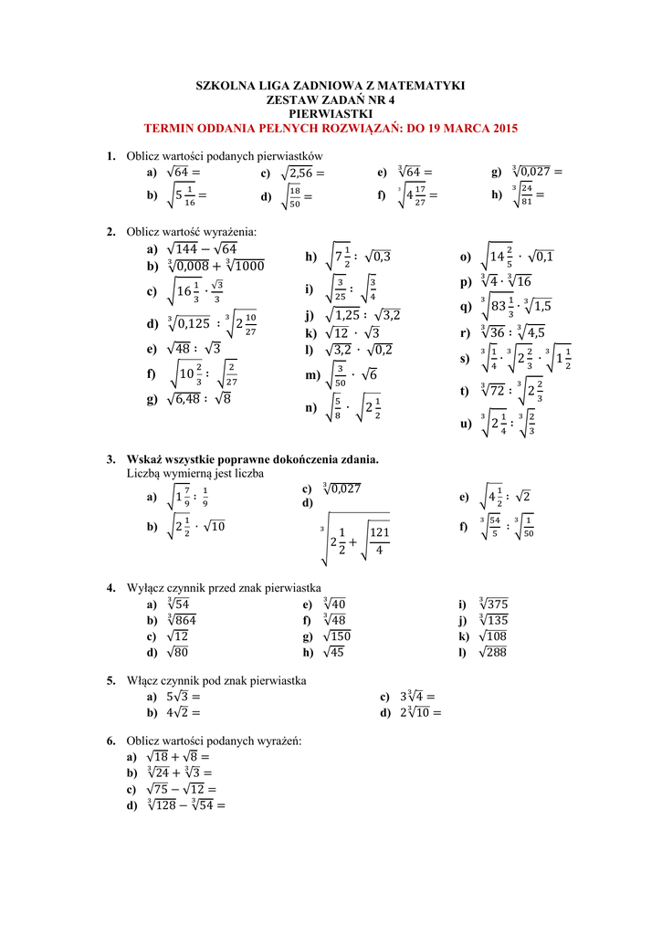 SZKOLNA LIGA ZADNIOWA Z MATEMATYKI ZESTAW ZADAŃ NR 4 PIERWIASTKI TERMIN ODDANIA PEŁNYCH ROZWIĄZAŃ: DO 19 MARCA 2015 1. Oblicz wartości podanych pierwiastków a) c) b) d) e) g) f) h) 2. Oblicz wartość wyrażenia: a) b) h) c) i) e) j) k) l) f) m) d) g) o) p) q) r) s) t) n) u) 3. Wskaż wszystkie poprawne dokończenia zdania. Liczbą wymierną jest liczba c) a) d) e) b) f) 4. Wyłącz czynnik przed znak pierwiastka e) a) f) b) c) g) d) h) 5. Włącz czynnik pod znak pierwiastka a) b) 6. Oblicz wartości podanych wyrażeń: a) b) c) d) i) j) k) l) c) d) 7. Na działce należy wydzielić ogródek w kształcie kwadratu o polu powierzchni . Ogrodzenie tego ogródka będzie wykonane z gotowych elementów, każdy o długości a) Ile elementów potrzeba na ogrodzenie ogródka? b) Czy na każdy prostokątny ogródek o powierzchni należy zakupić tyle samo gotowych elementów? 8. Dane są dwa kwadraty. Kwadrat I ma pole , a kwadrat II ma pole a) Jaki obwód ma kwadrat I? b) Jaką część obwodu kwadratu I stanowi obwód kwadratu I ? 9. Objętość sześcianu jest równa krótszej. . oblicz objętość sześcianu o krawędzi 3 razy 10. Uzasadnij, że długość krawędzi sześcianu o objętości długości krawędzi sześcianu o polu powierzchni jest 3 razy większa od . .
