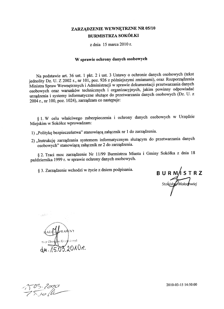 ZARZĄDZENIE WEWNĘTRZNE NR 05/10 BURMISTRZA SOKÓLKI Na podstawie art. 36 ust. 1 pkt. 2 i ust. 3 Ustawy o ochronie danych osobowych (tekst jednolity Dz. U. Z 2002 r., nr 101, poz. 926 z późniejszymi zmianami), oraz Rozporządzenia Ministra Spraw Wewnętrznych i Administracji w sprawie dokumentacji przetwarzania danych osobowych oraz warunków technicznych i organizacyjnych, jakim powinny odpowiadać urządzenia i systemy informatyczne służące do przetwarzania danych osobowych (Dz. U. z 2004 r., nr 100, poz. 1024), zarządzam co następuje: § 1. W celu właściwego zabezpieczenia Miejskim w Sokółce wprowadzam: ochrony danych osobowych w Urzędzie 1) "Politykę bezpieczeństwa" stanowiącą załącznik nr 1 do zarządzenia. 2) "Instrukcję zarządzania systemem informatycznym służącym do przetwarzania osobowych" stanowiącą załącznik nr 2 do zarządzenia. danych § 2. Traci moc zarządzenie Nr 11199 Burmistrza Miasta i Gminy Sokółka z dnia 18 października 1999 r. w sprawie ochrony danych osobowych. Załącznik nr 1 Do Zarządzenie wewnętrznego Nr 05/10 Burmistrza Sokółki z dnia 15.03.2010 r. Polityka bezpieczeństwa Spis treści 1 Definicj e 2 Zasady ogólne 3 Zabezpieczenie dostępu do danych osobowych 4 Wykaz zbiorów danych osobowych wraz ze wskazaniem programów zastosowanych do przetwarzania tych danych '" 5 Opis struktury zbiorów danych wskazujący zawartość poszczególnych pól informacyjnych i powiązania między nimi 6 Sposób przepływu danych pomiędzy poszczególnymi systemami 7 Określenie środków technicznych i organizacyjnych 7.1 Zasady ogólne: 7.2 Środki techniczne 7.3 Środki organizacyjne 7.4 Sposób postępowania w zakresie komunikacji w sieci komputerowej 7.5 Zasady postępowania w przypadku naruszenia ochrony danych osobowych 8 Zasady korzystania z komputerów przenośnych, na których są przetwarzane dane osobowe 1 1 2 .2 3 3 3 3 3 3 4 .4 .4 6 Definicje a) Zbiór danych osobowych - każdy posiadający strukturę zestaw danych o charakterze osobowym, dostępnych według określonych kryteriów, niezależnie od tego, czy zestaw ten jest rozproszony lub podzielony funkcjonalnie. b) Administrator danych osobowych - zadania administratora danych osobowych wykonuje Burmistrz Sokółki. c) Administrator bezpieczeństwa informacji - osoba wyznaczona przez administratora danych osobowych, odpowiedzialna za bezpieczeństwo danych osobowych przetwarzanych we wskazanych systemach informatycznych. d) Administrator systemu informatycznego - osoba odpowiedzialna za sprawność, konserwację oraz wdrażanie technicznych zabezpieczeń systemu informatycznego do przetwarzania danych osobowych w Urzędzie Miejskim w Sokółce. e) System informatyczny - zespół współpracujących ze sobą urządzeń, programów, procedur przetwarzania informacji i narzędzi programowych zastosowanych w celu przetwarzania danych. f) Stacja robocza - stacjonarny lub przenośny komputer wchodzący w skład systemu informatycznego umożliwiający użytkownikom systemu dostęp do danych osobowych znajdujących się w systemie. g) Bezpieczeństwo systemu informatycznego - wdrożenie przez administratora danych h) i) j) k) 1) m) osobowych lub osobę przez niego uprawnioną środków organizacyjnych i technicznych w celu zabezpieczenia oraz ochrony danych przed dostępem, modyfikacją, ujawnieniem, pozyskaniem lub zniszczeniem. Przetwarzanie danych osobowych - wykonywanie jakichkolwiek operacji na danych osobowych, takich jak zbieranie, utrwalanie, przechowywanie, opracowywanie, zmienianie, udostępnianie i ich usuwanie. Osoba upoważniona - osoba posiadająca upoważnienie wydane przez administratora danych osobowych i dopuszczona jako użytkownik do przetwarzania danych osobowych w zakresie wskazanym w upoważnieniu. Użytkownik systemu - osoba posiadająca uprawnienia do przetwarzania danych osobowych w systemie informatycznym. Osoba uprawniona - osoba posiadająca upoważnienie wydane przez administratora danych osobowych do wykonywania w jego imieniu określonych czynności. Ustawa - ustawa z dnia 29 sierpnia 1997 r. o ochronie danych osobowych. Rozporządzenie - rozporządzenie Ministra Spraw Wewnętrznych i Administracji z dnia 29 kwietnia 2004 r. w sprawie dokumentacji przetwarzania danych osobowych oraz warunków technicznych i organizacyjnych, jakim powinny odpowiadać urządzenia i systemy informatyczne służące do przetwarzania danych osobowych. 2 Zasady ogólne a) Ochrona danych osobowych przetwarzanych w Urzędzie Miejskim w Sokółce obowiązuje wszystkie osoby, które mają dostęp do informacji przetwarzanych w urzędzie, bez względu na zajmowane stanowisko oraz miejsce wykonywania pracy, jak również charakter stosunku pracy. Ochroną objęte są również dane pozyskiwane w trakcie realizacji przez gminę projektów współfinansowanych ze środków publicznych wymienionych w Art. 5 ust. 1 pkt 2 i 3 ustawy z dnia 27 sierpnia 2009r. O finansach publicznych (Dz. U. Nr 157 poz. 1240 z późno zm.) b) Osoby mające dostęp do danych osobowych są zobligowane do stosowania niezbędnych środków zapobiegających ujawnieniu tych danych osobom nieupoważnionym. c) Zachowanie tajemnicy obowiązuje zarówno podczas trwania stosunku pracy jak i po jego ustaniu. d) Kadra Kierownicza Urzędu Miejskiego w Sokółce jest odpowiedzialna za tworzenie, wdrażanie, administrację i interpretację polityki bezpieczeństwa informacji, standardów, zaleceń oraz procedur w całym systemie. 3 Zabezpieczenie dostępu do danych osobowych Przetwarzanie danych osobowych może odbywać się wyłącznie w obszarach do tego celu przeznaczonych. Wykaz pomieszczeń, w których dopuszczalne jest przetwarzanie danych osobowych stanowi Załącznik nr 1 do niniejszej instrukcji. W szczególnych przypadkach możliwe jest przetwarzanie danych osobowych poza wyznaczonym obszarem (np. na komputerach przenośnych) jednak wymaga to zgody indywidualnej administratora bezpieczeństwa informacji. Szcze